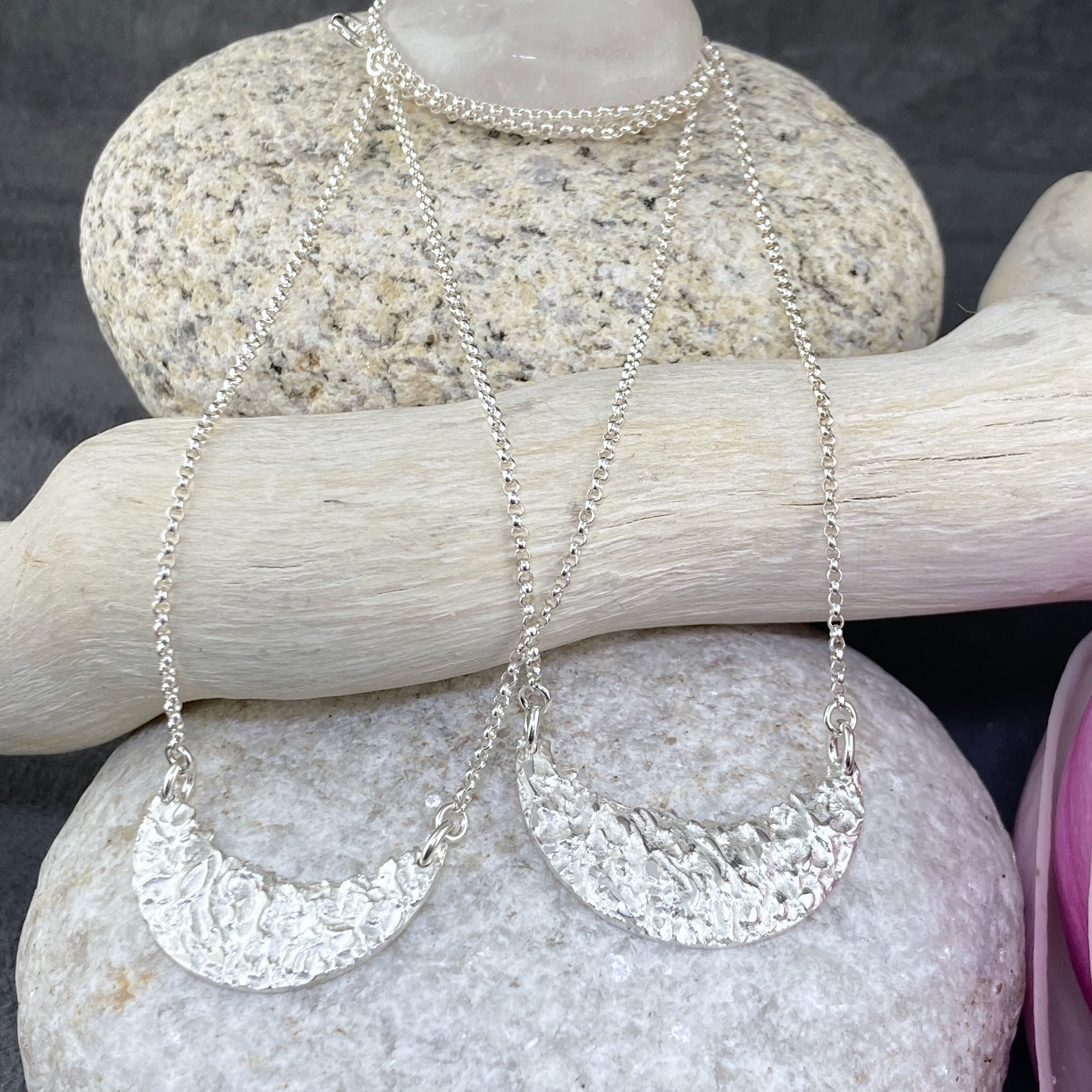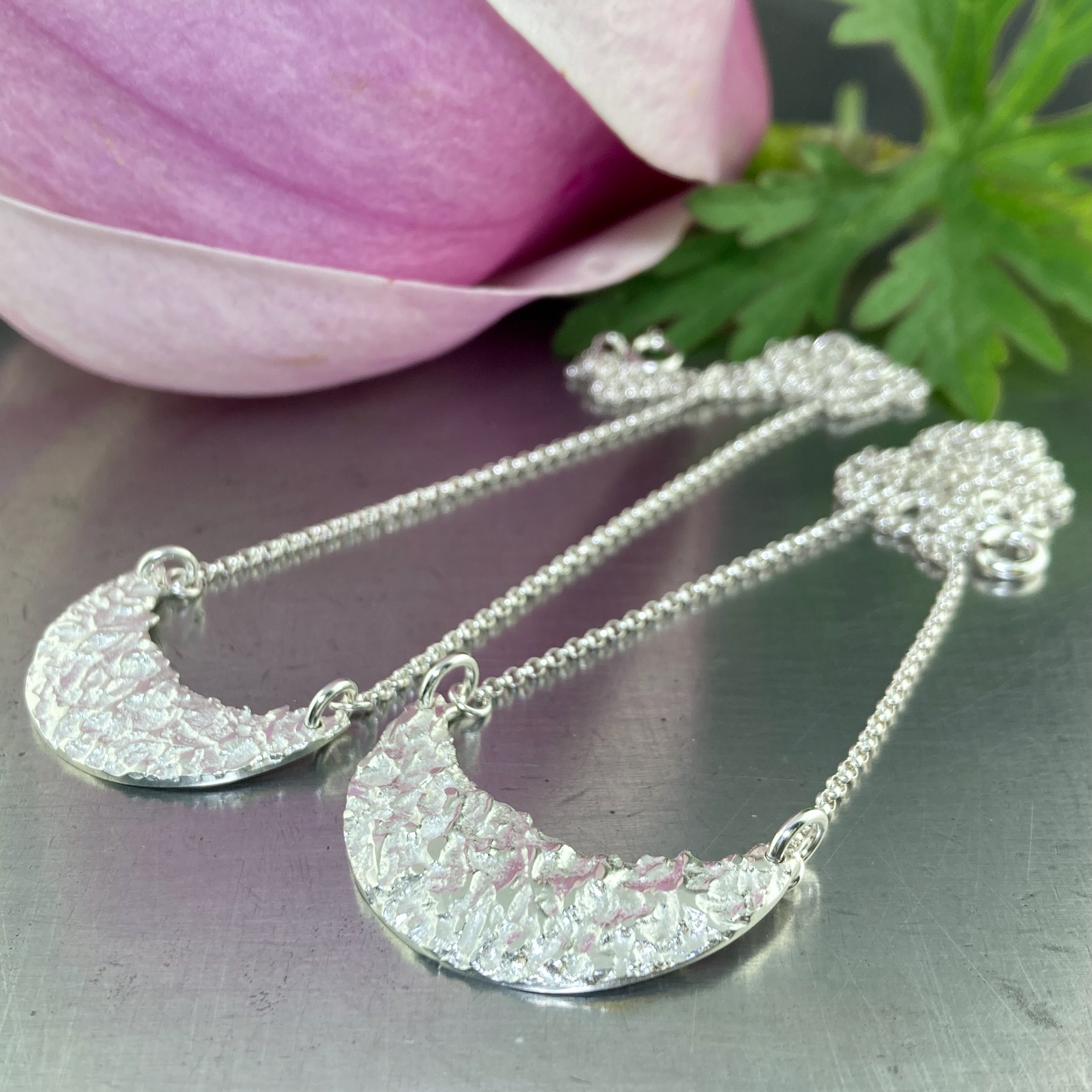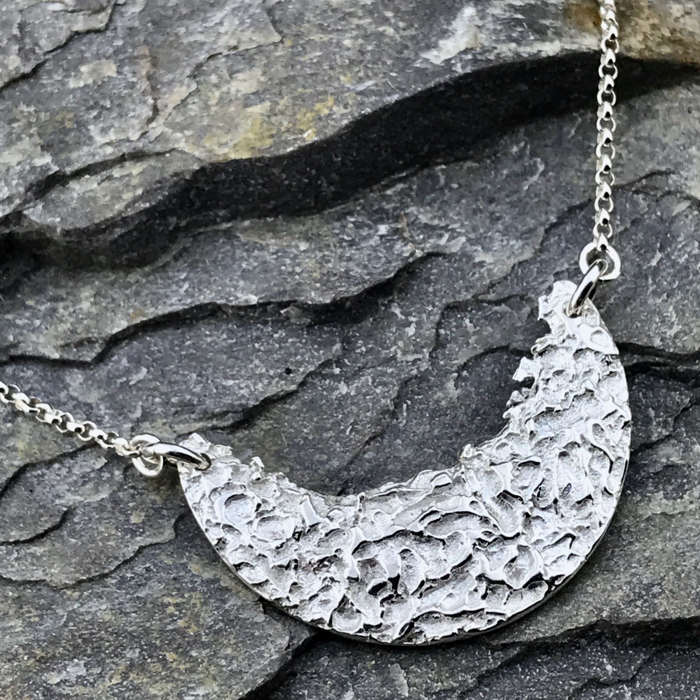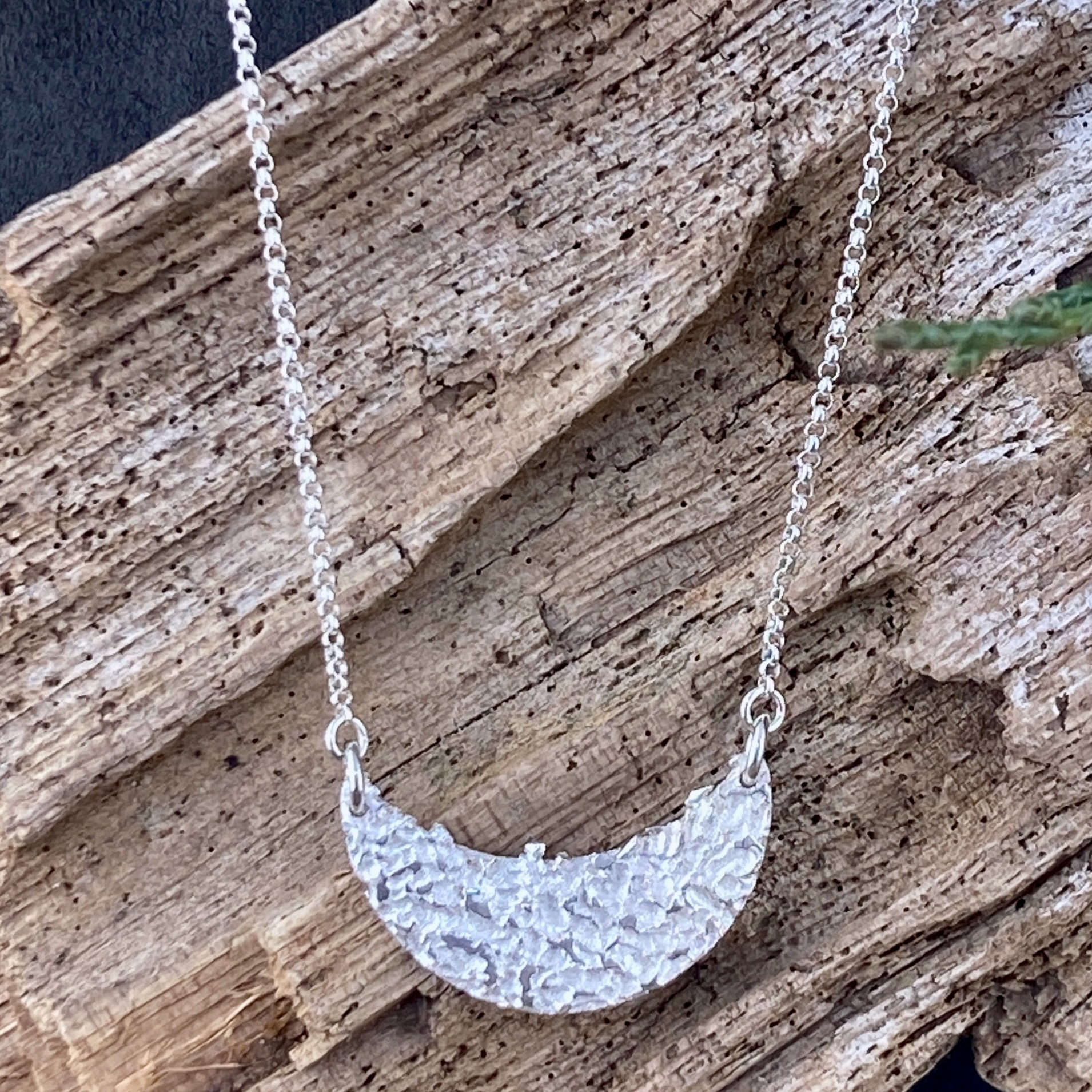 Crescent moon on chain – lunar texture. The Lunar texture is made by manipulating the Argentium silver while it is liquid, until it resembles the surface of the Moon.