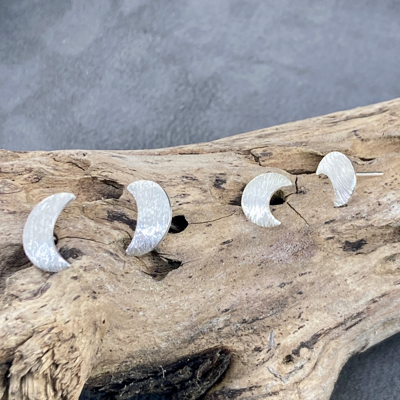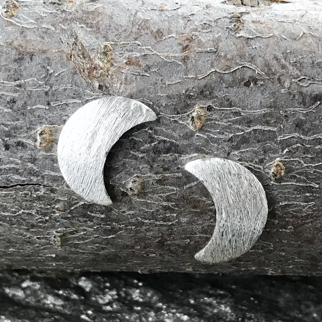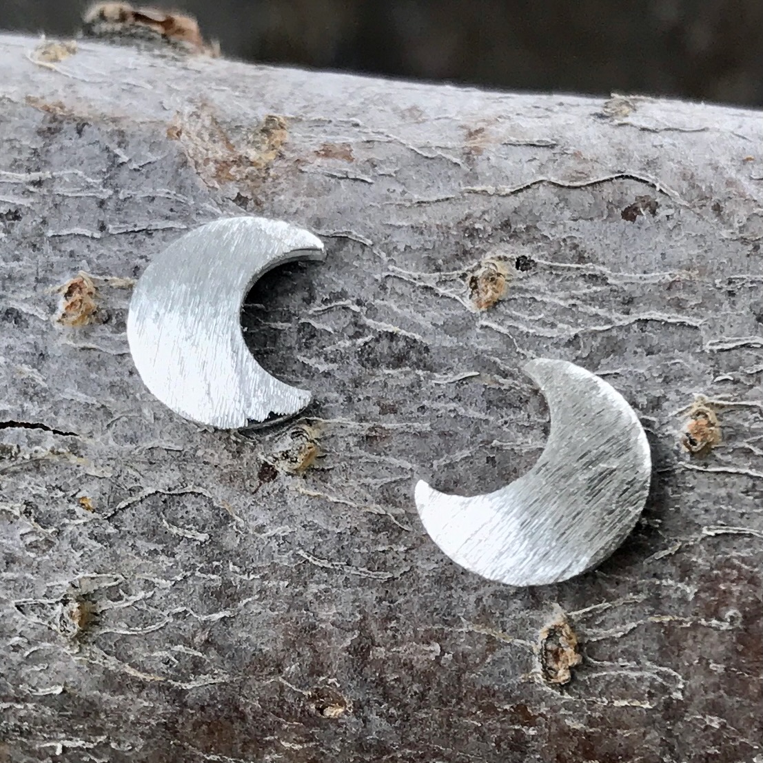 Argentium silver earrings. Crescent moons, cut in 2 earring sizes, and then hand etched with a linear design. Post soldered on is also Argentium, as is the butterfly.