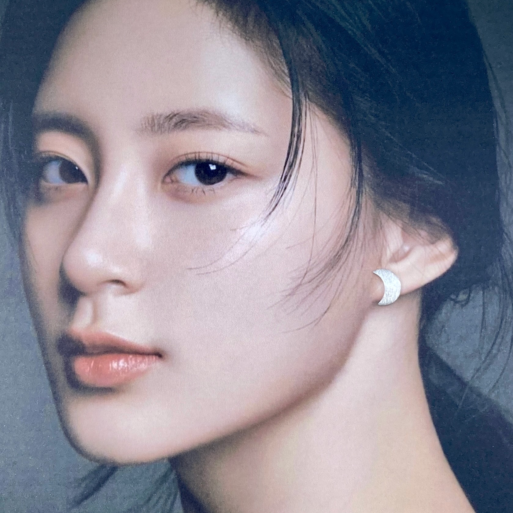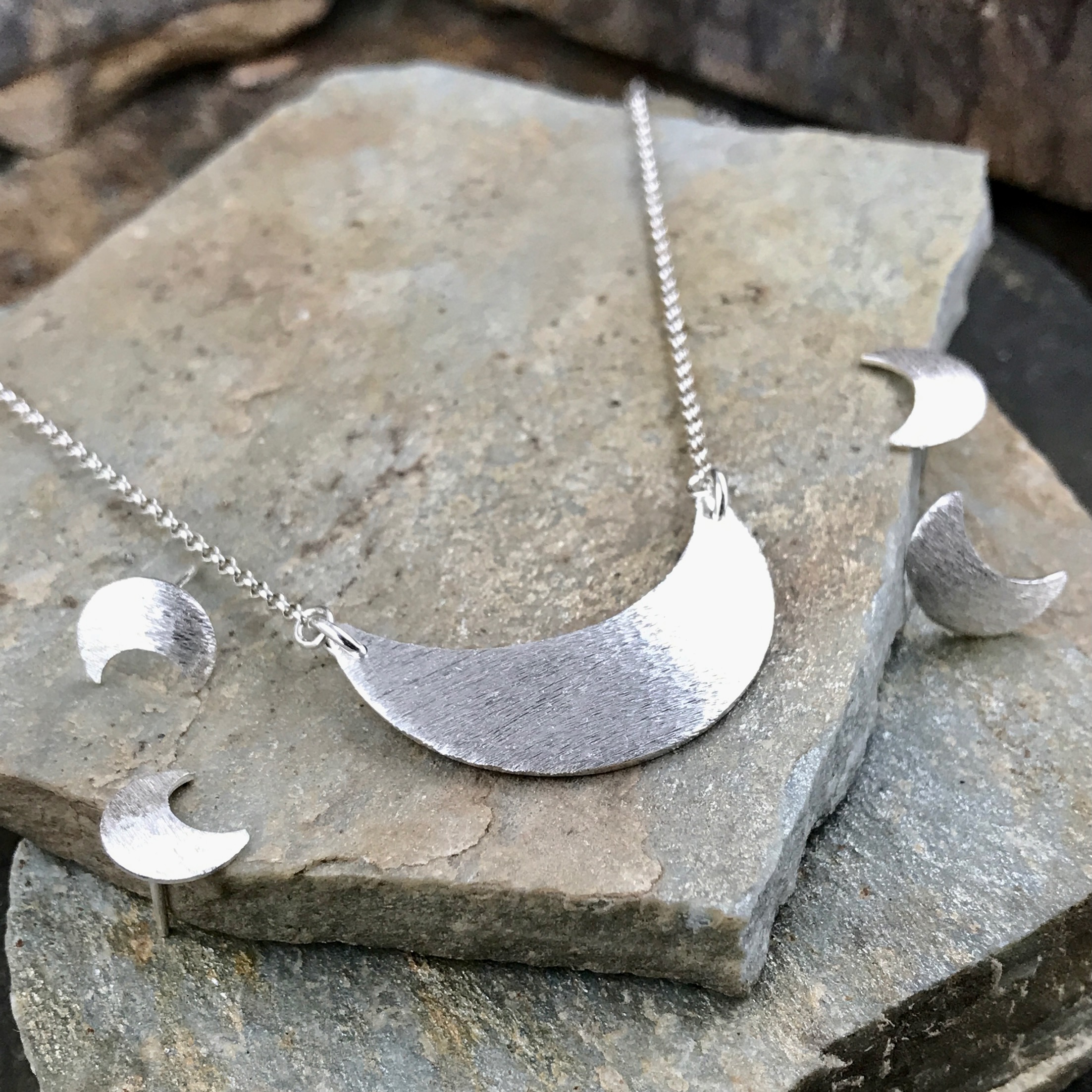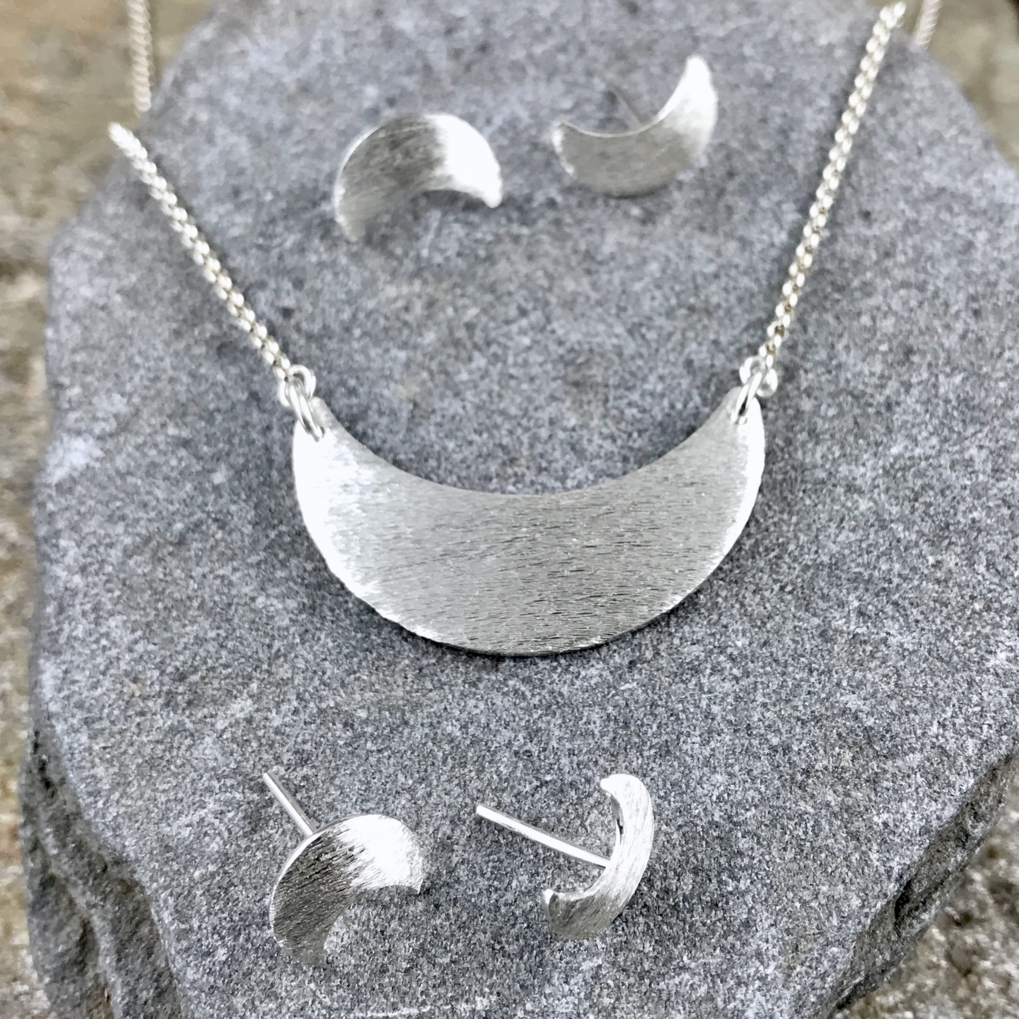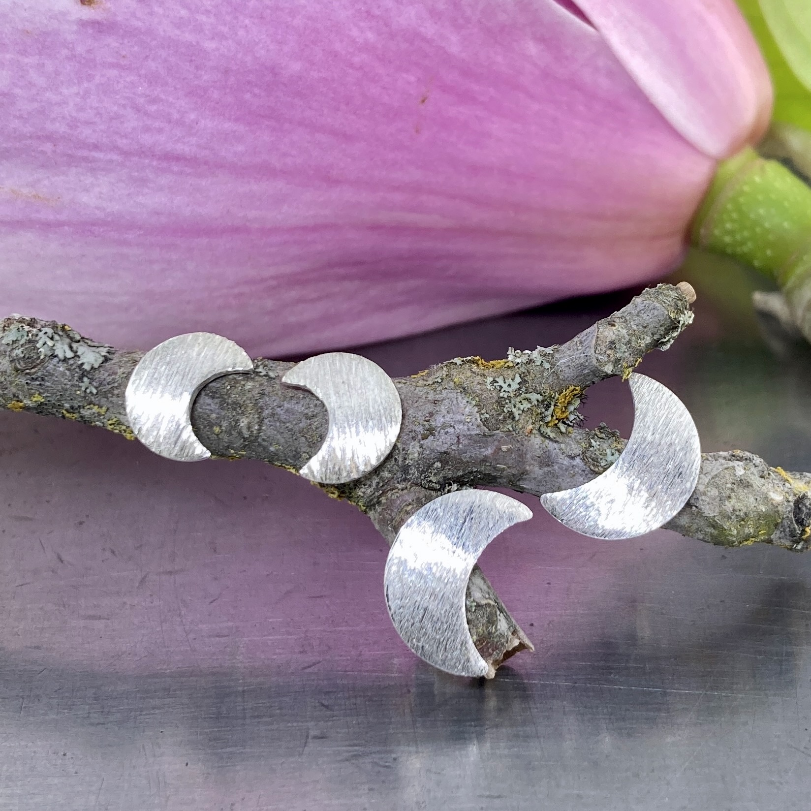Argentium silver earrings. Crescent moons, cut in 2 earring sizes, and then hand etched with a linear design. Post soldered on is also Argentium, as is the butterfly.