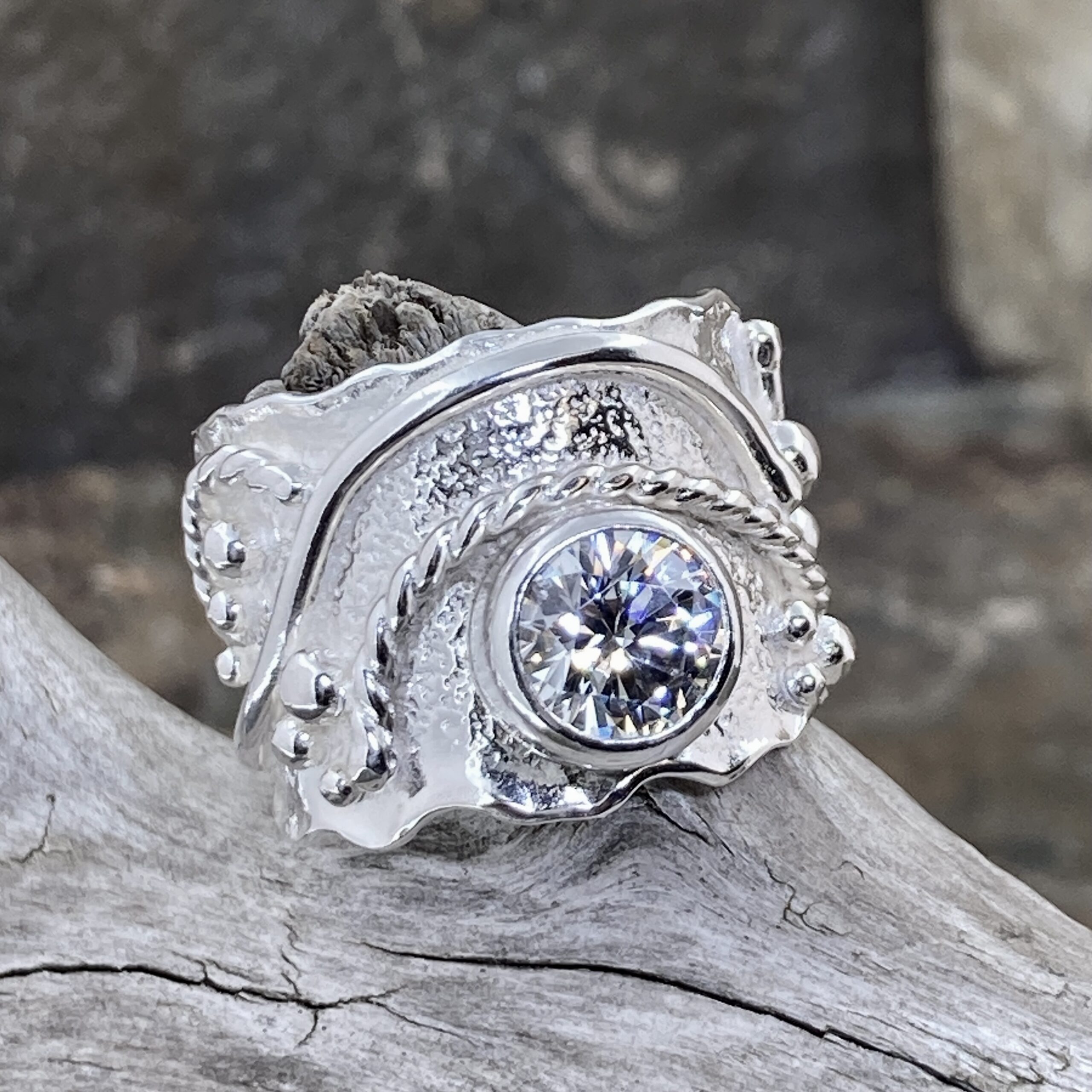 The gemstone is a 2 carat brilliant cut Cubic Zirconia in a bezel setting. Its clear sparkle contrasts beautifully with the textured silver, creating light and depth within the design. The bezel adds a clean, polished edge while keeping the stone well protected.