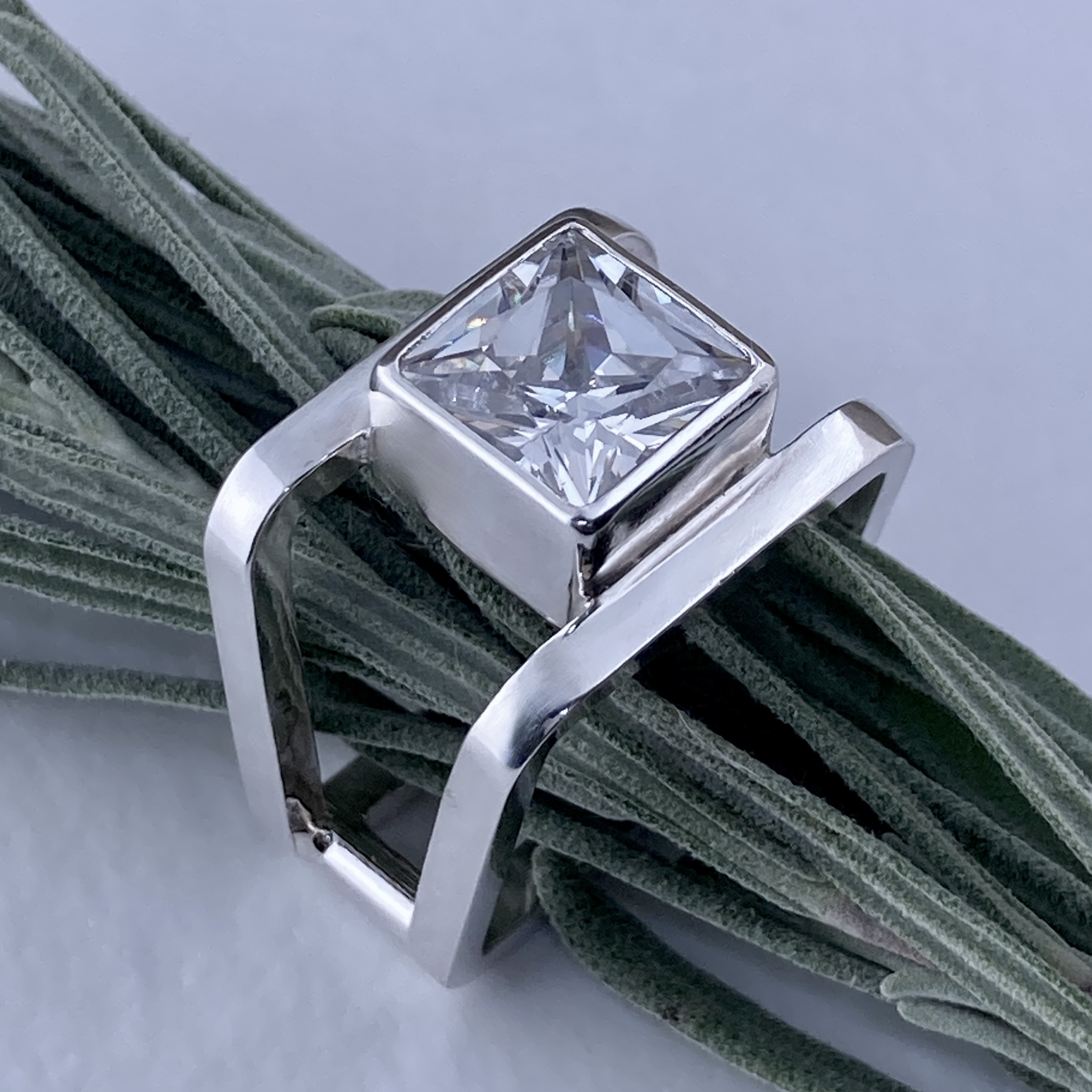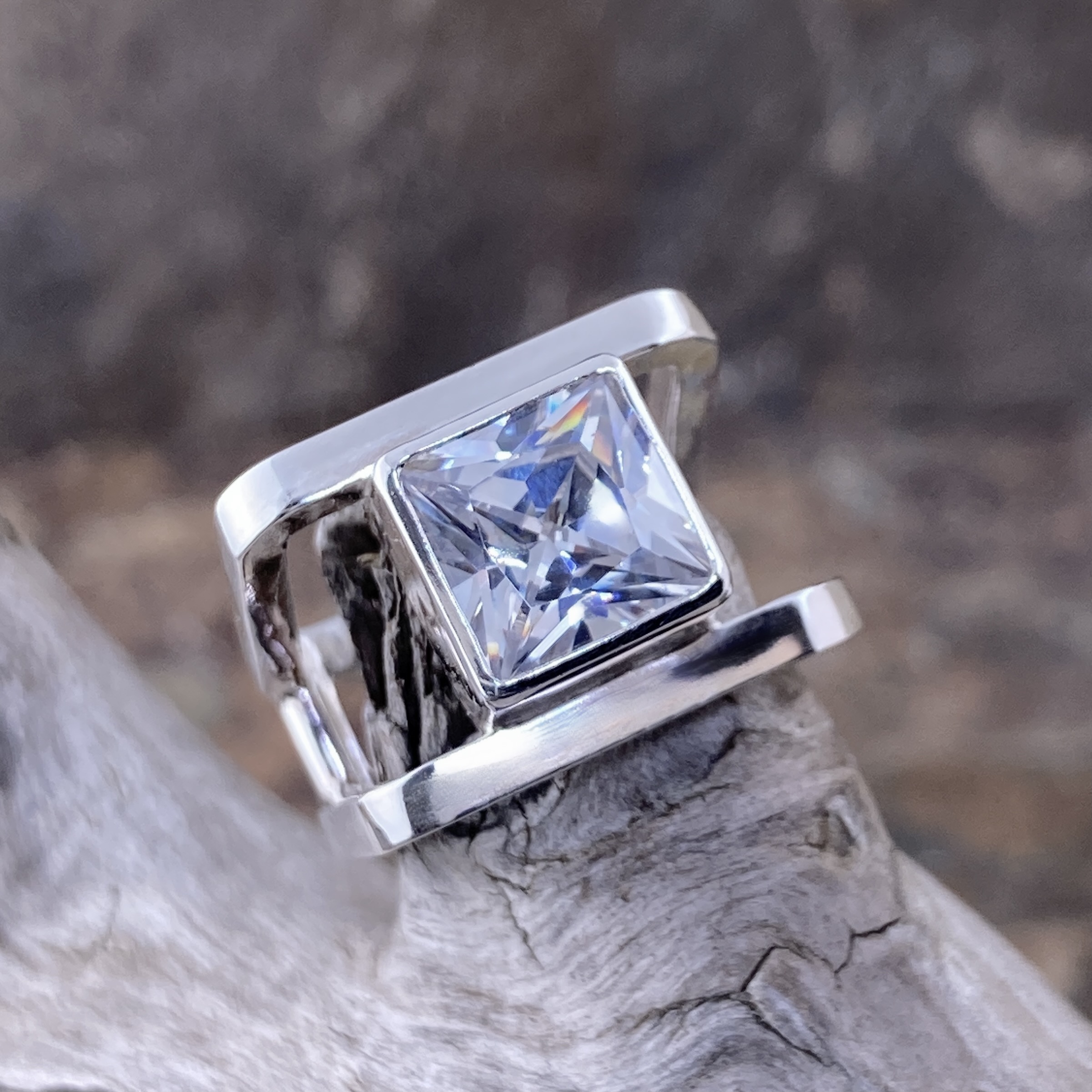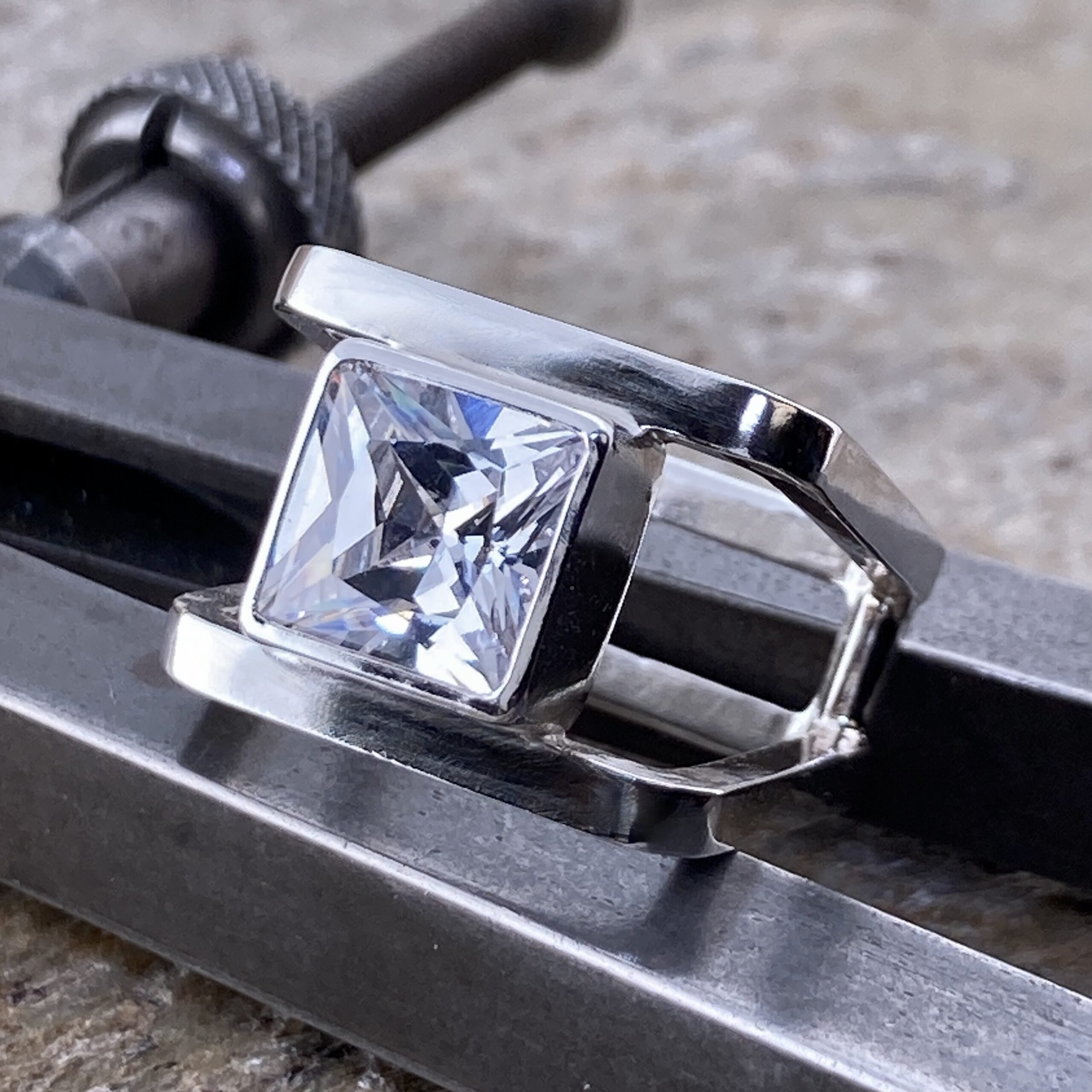 The Cubic Zirconia is a square 4 carat cut, chosen for clarity and brilliance. Its crisp geometry complements the sharp, polished finish of the band. Set in Argentium silver, the stone maintains excellent light reflection and long-lasting durability.