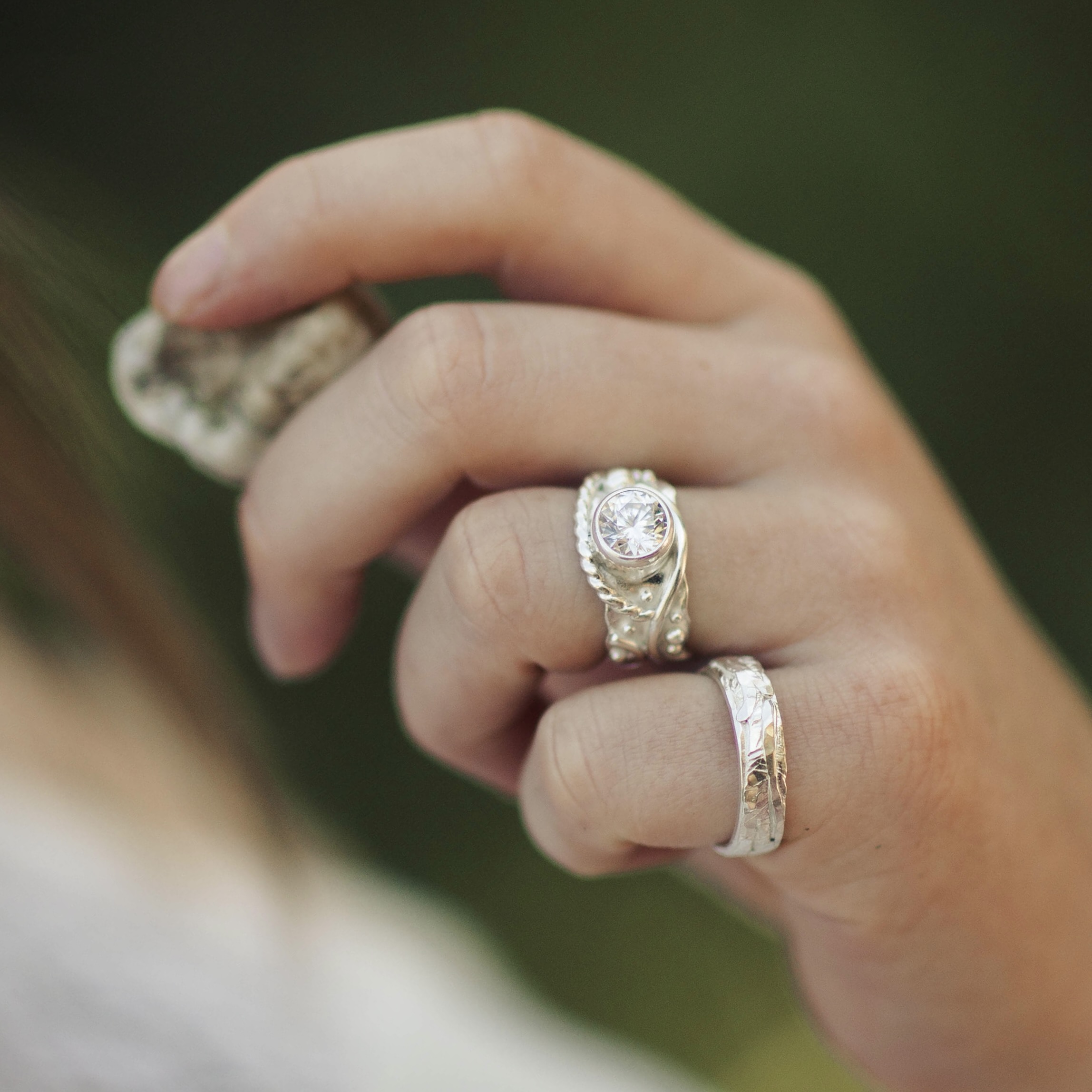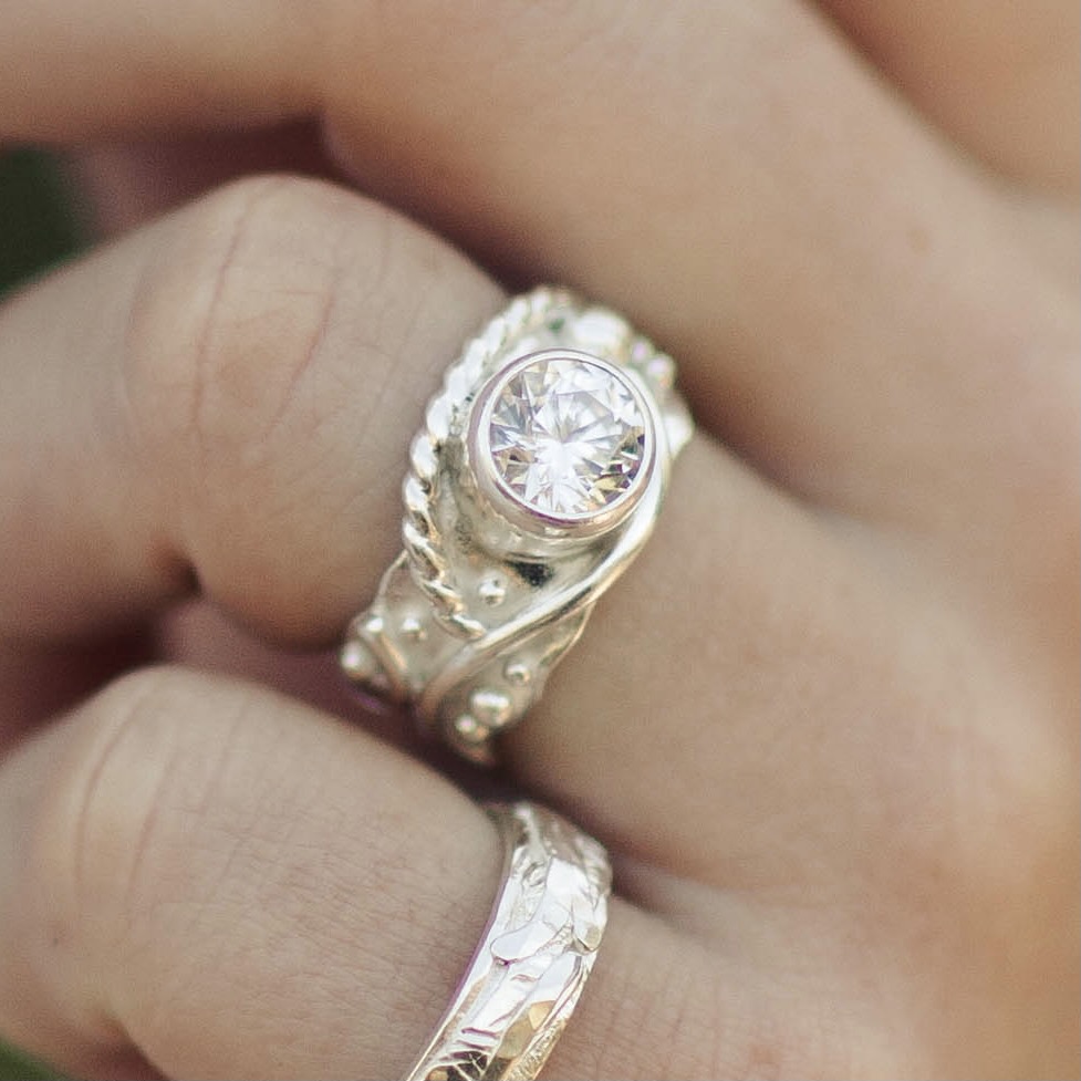This 2.5 carat brilliant-cut Cubic Zirconia radiates pure, white brilliance — perfectly matched to the cool brightness of Argentium 940 silver. The bezel setting enhances the sparkle while keeping the stone low and secure for everyday wear.