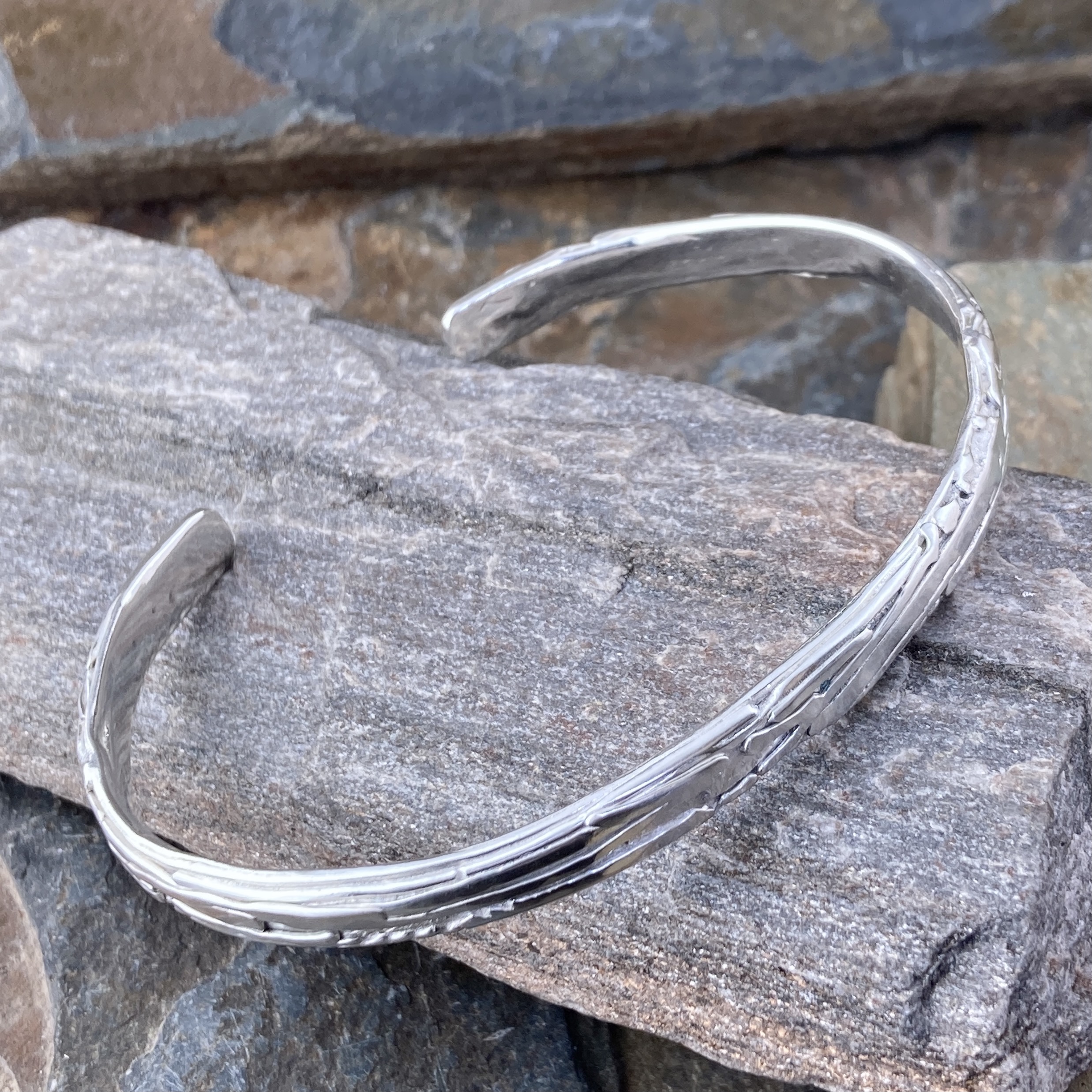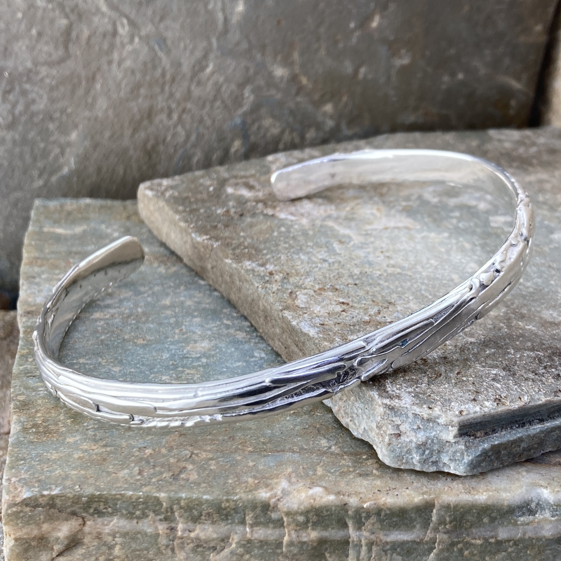 First, I cut a strip of Argentium silver to the cuff width I plan to make. Then I fuse layers of cut Argentium silver wire onto that sheet, repeating the layering and fusing until the surface reads like bark. I clean and shape the ends, form the strip into a smooth oval, and refine the edges for comfort. Finally, I polish the high points so they catch the light, and work-harden the silver for strength. Because every step is done by hand, each cuff has its own character.