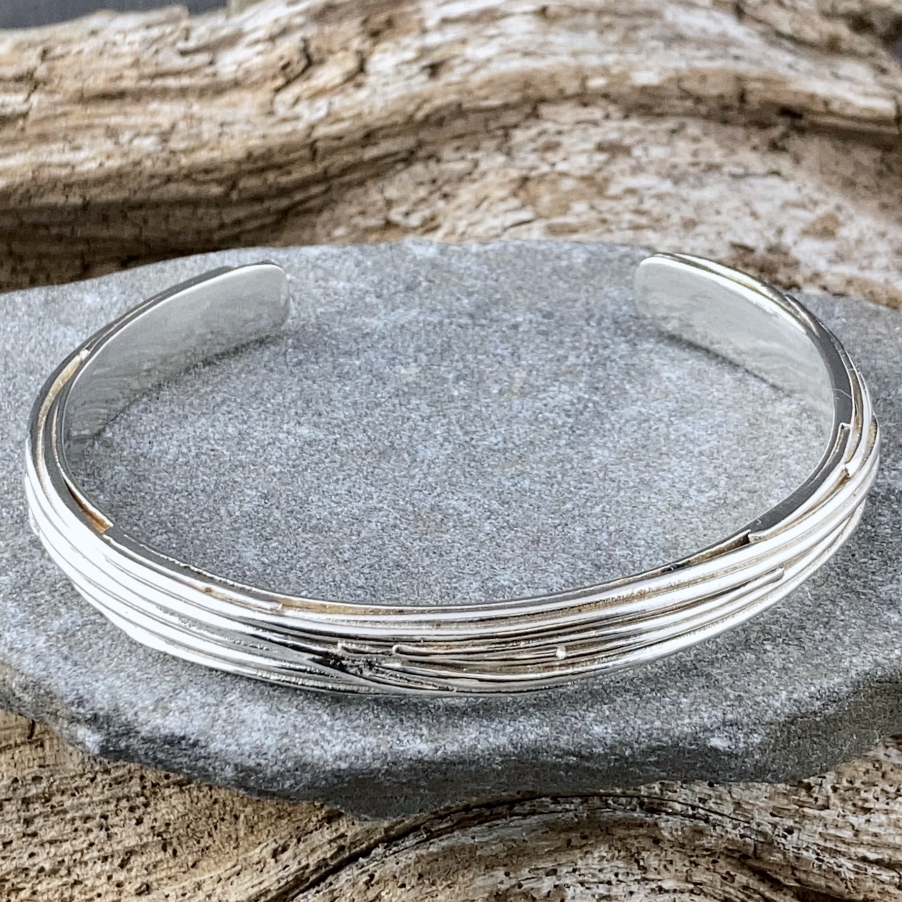 First, I cut a strip of Argentium silver to the cuff width I plan to make. Then I fuse layers of cut Argentium silver wire onto that sheet, repeating the layering and fusing until the surface reads like bark. I clean and shape the ends, form the strip into a smooth oval, and refine the edges for comfort. Finally, I polish the high points so they catch the light, and work-harden the silver for strength. Because every step is done by hand, each cuff has its own character.