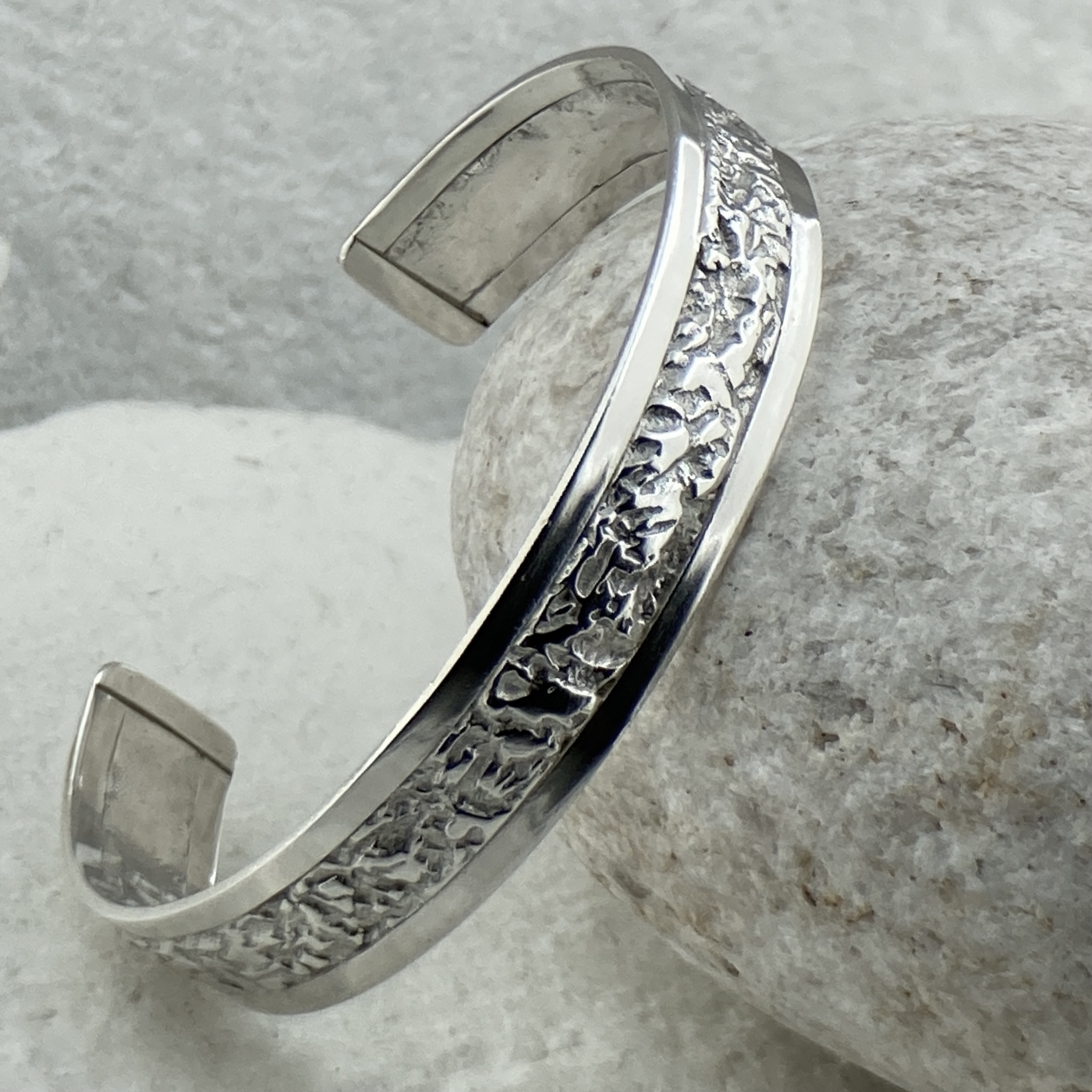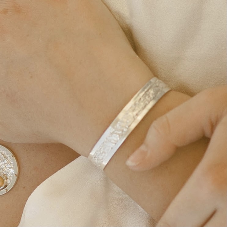 The Handmade Argentium Lunar Cuff captures the beauty and strength of the moon’s surface. I melt solid Argentium silver and move the molten metal with a pick until the texture mirrors the craters and shadows of the lunar landscape. Afterward, I hammer and shape the cuff, adding a solid silver edge to create clean, smooth sides. The result is a refined yet rugged bracelet with weight and presence.
