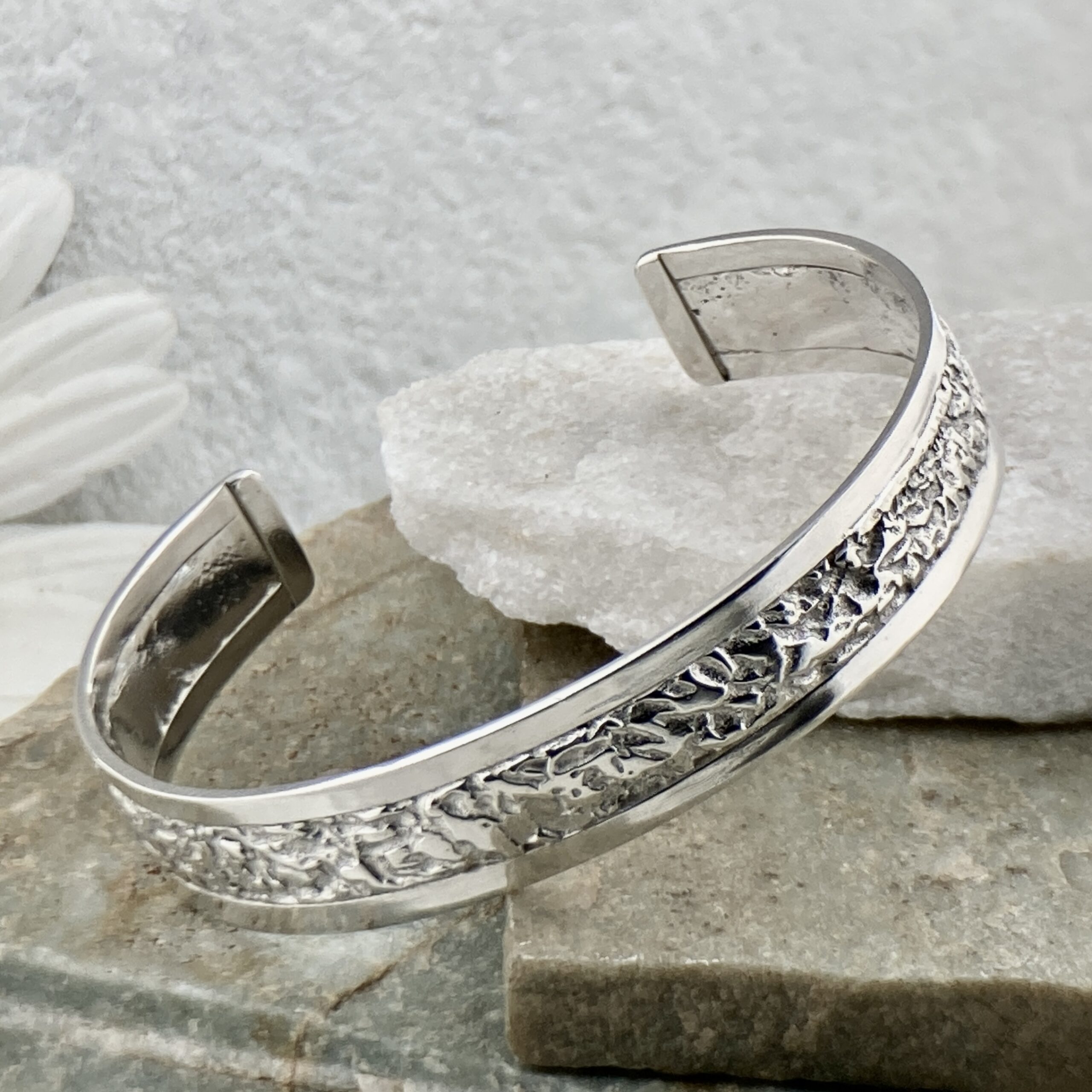 Each cuff begins as solid Argentium silver and is forged, textured, and finished entirely by hand in my Creston, BC studio. Every mark comes from direct contact with flame and tools, creating a piece that is truly one of a kind.