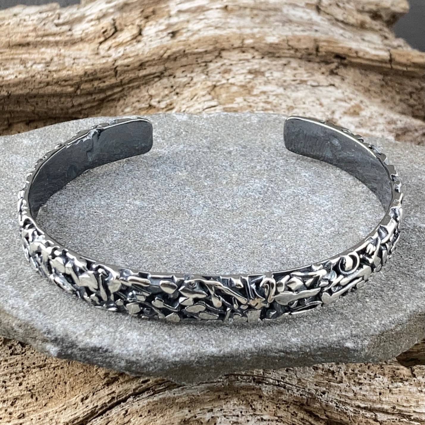 This bracelet is made from Argentium 940 silver, a modern silver alloy that includes germanium. It stays whiter, is harder than sterling, and resists tarnish naturally. Because it’s nickel-free and hypoallergenic, it’s comfortable for all skin types. The antique finish is permanent, so it never needs polishing. Simply wipe gently with a soft cloth and store in a dry place.