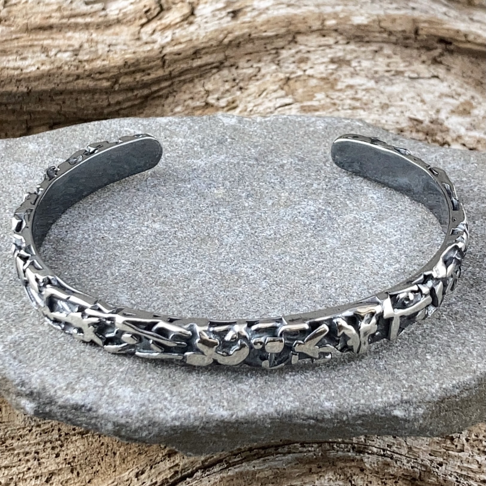 This cuff is made from Argentium 940 silver, a premium alloy with germanium. It is whiter, harder, and slower to tarnish than sterling—and always nickel-free and hypoallergenic. The antique finish is permanent, so you never need to polish it. Simply wipe with a soft cloth and store in a dry place.