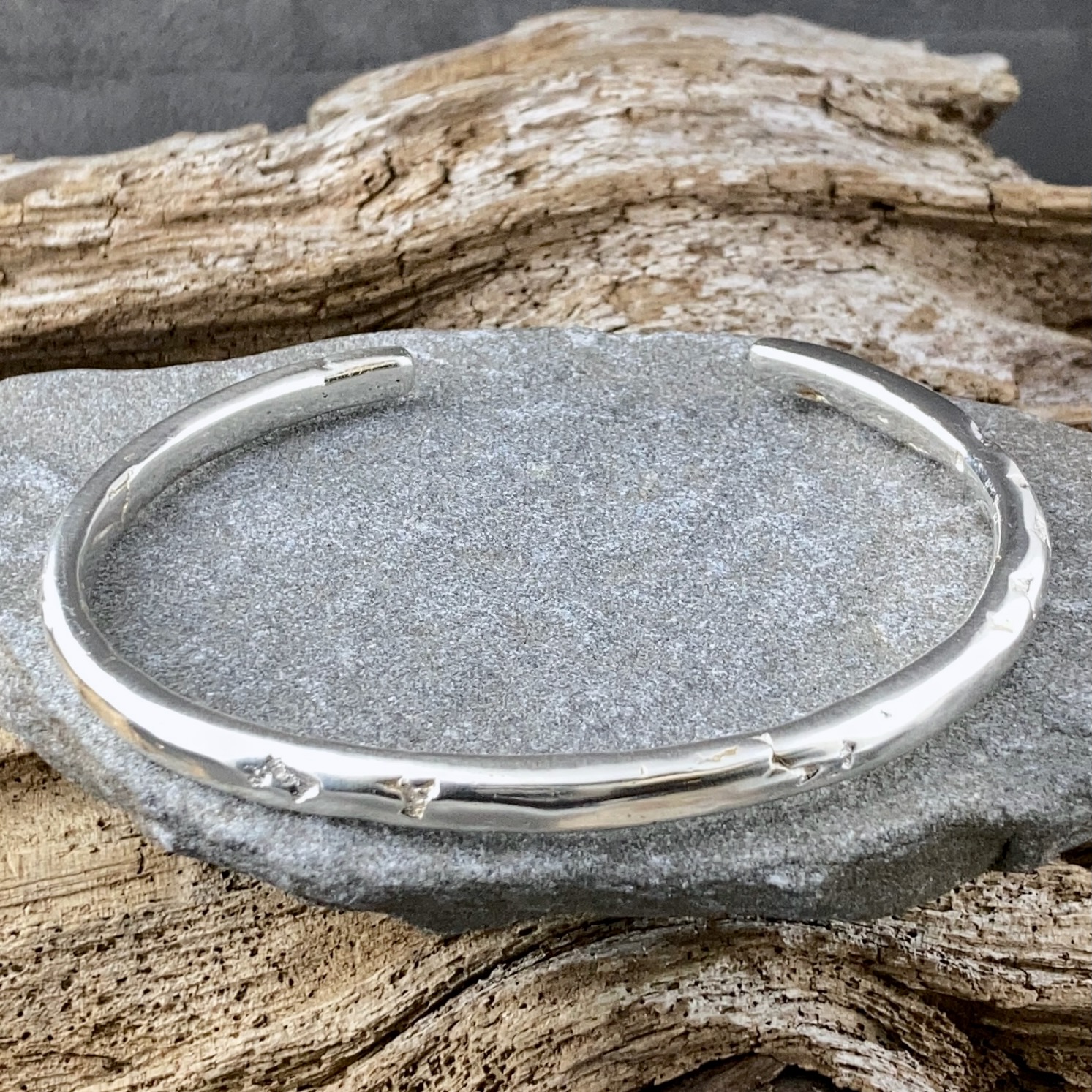 I craft this bracelet from Argentium 940 silver, a bright, nickel-free alloy with germanium. It stays whiter, hardens well, and naturally resists tarnish. After wearing, simply wipe it with a soft cloth and store it dry. Avoid dips and harsh chemicals to preserve the forged texture and polish.