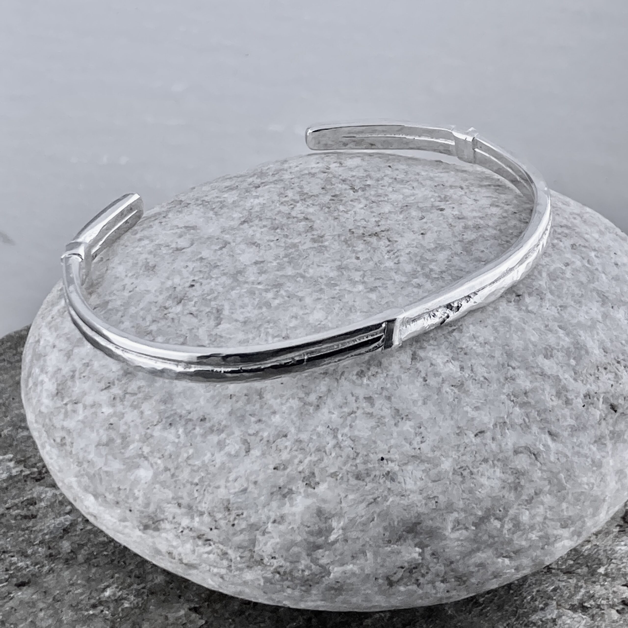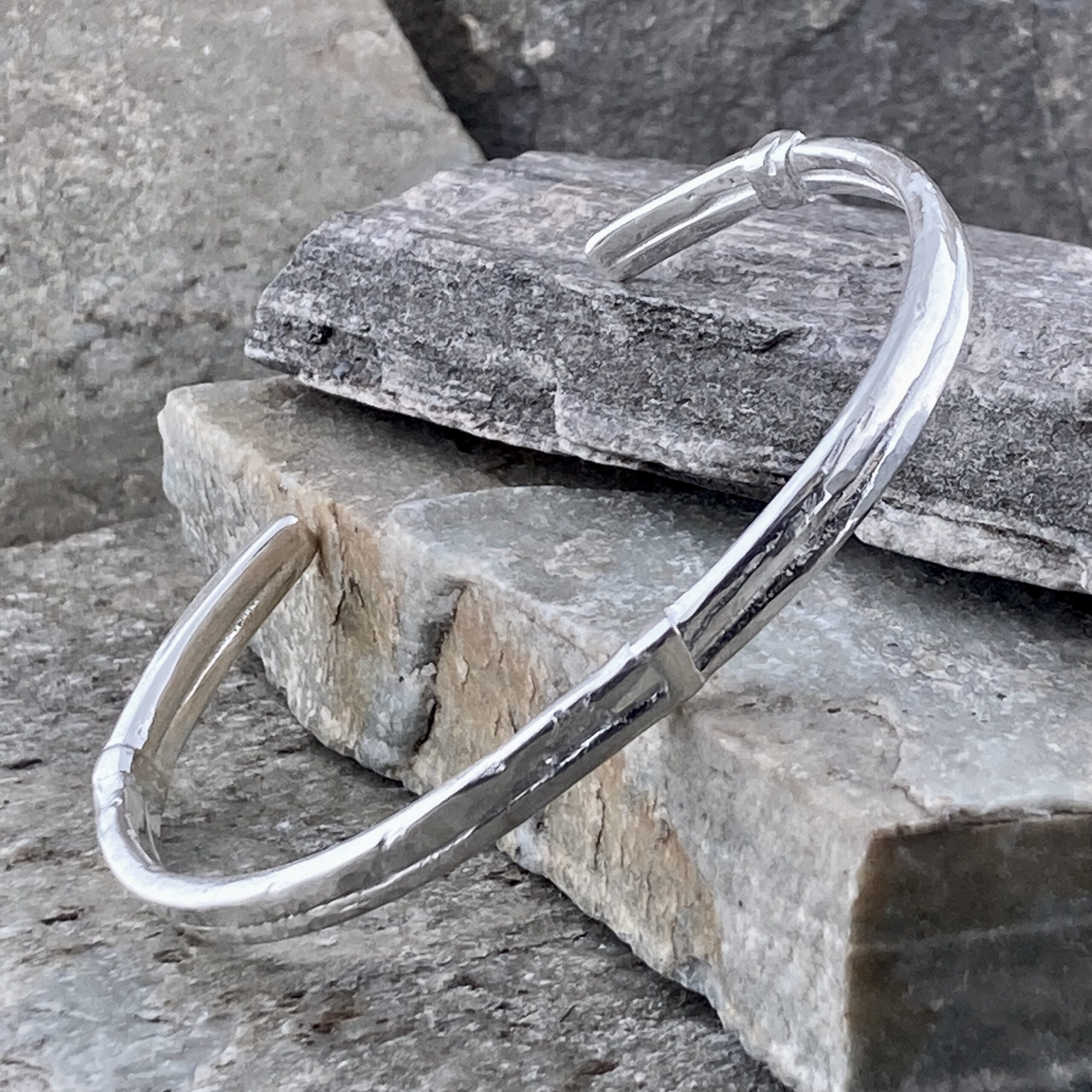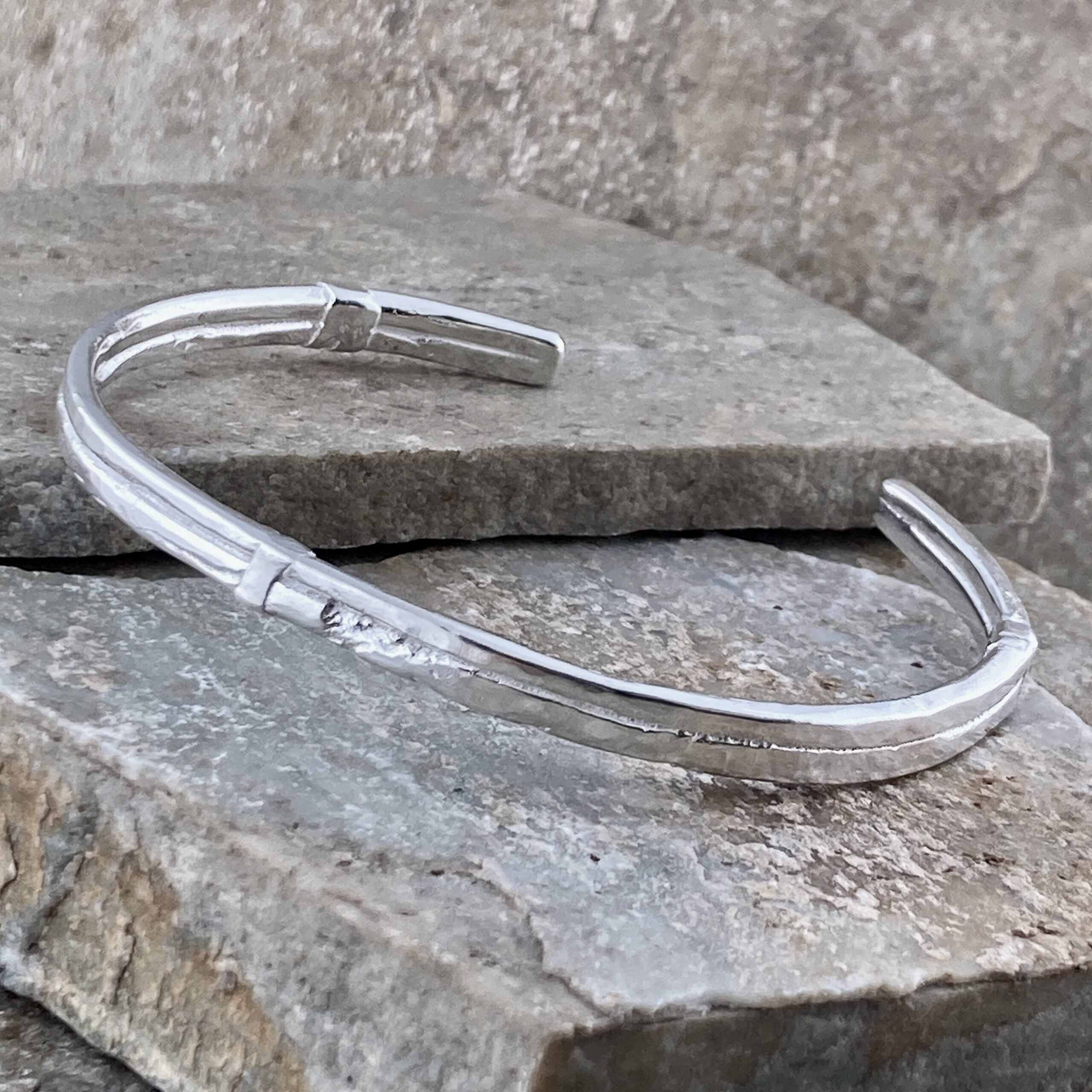 First, I melt and draw Argentium into two rough wires. Next, I lay them in parallel and fuse the seam for strength. Then I set the bracket details, true the oval, and smooth every edge. After that, I bring up the polish so high points shine while the fused line keeps its hand-made character. Finally, I give the cuff a durable finish so the form reads sharp and intentional.
