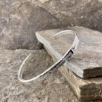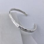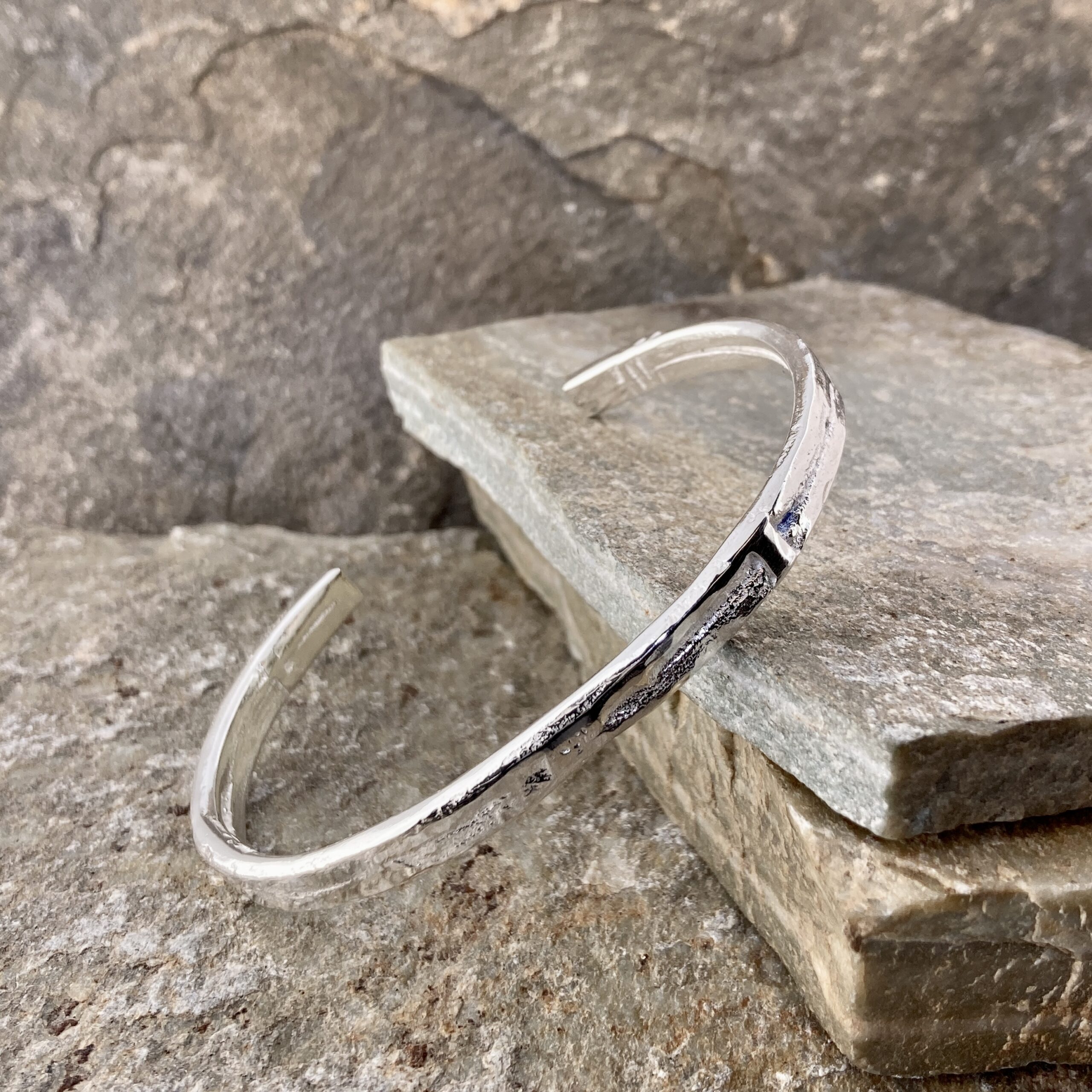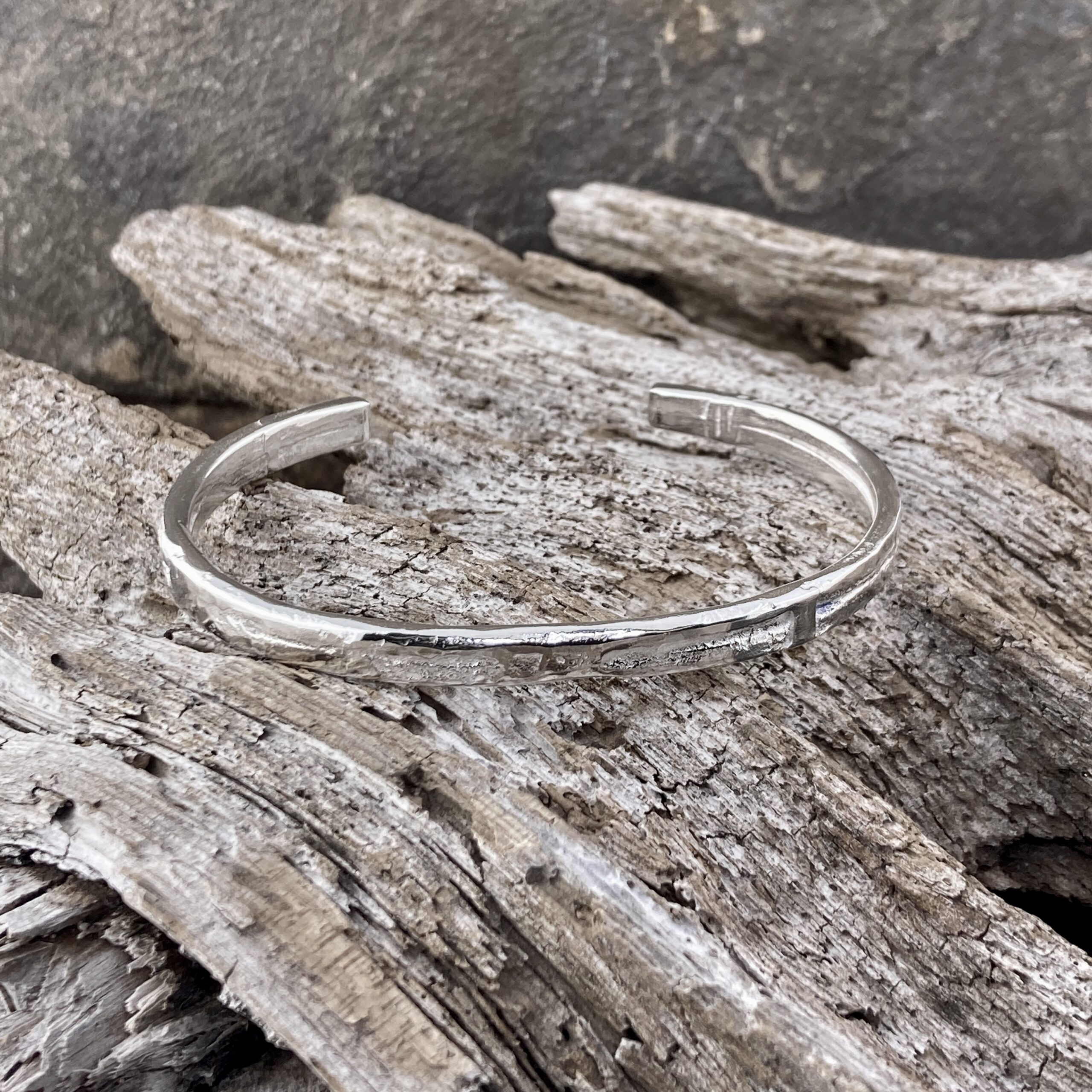 First, I melt and draw Argentium into two rough wires. Next, I lay them in parallel and fuse the seam for strength. Then I set the bracket details, true the oval, and smooth every edge. After that, I bring up the polish so high points shine while the fused line keeps its hand-made character. Finally, I give the cuff a durable finish so the form reads sharp and intentional.