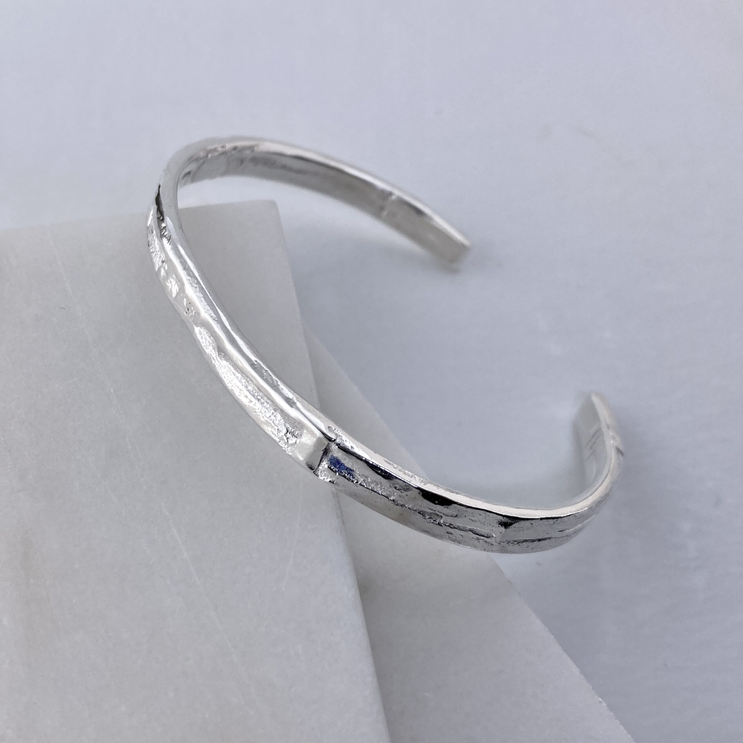 Two fused wires create a narrow, even band that looks refined from a distance and textured up close. The profile stays sleek at 0.5 cm all the way around. Because the edges are smoothed and the oval is carefully trued, the cuff sits naturally on the wrist and feels comfortable through the day.