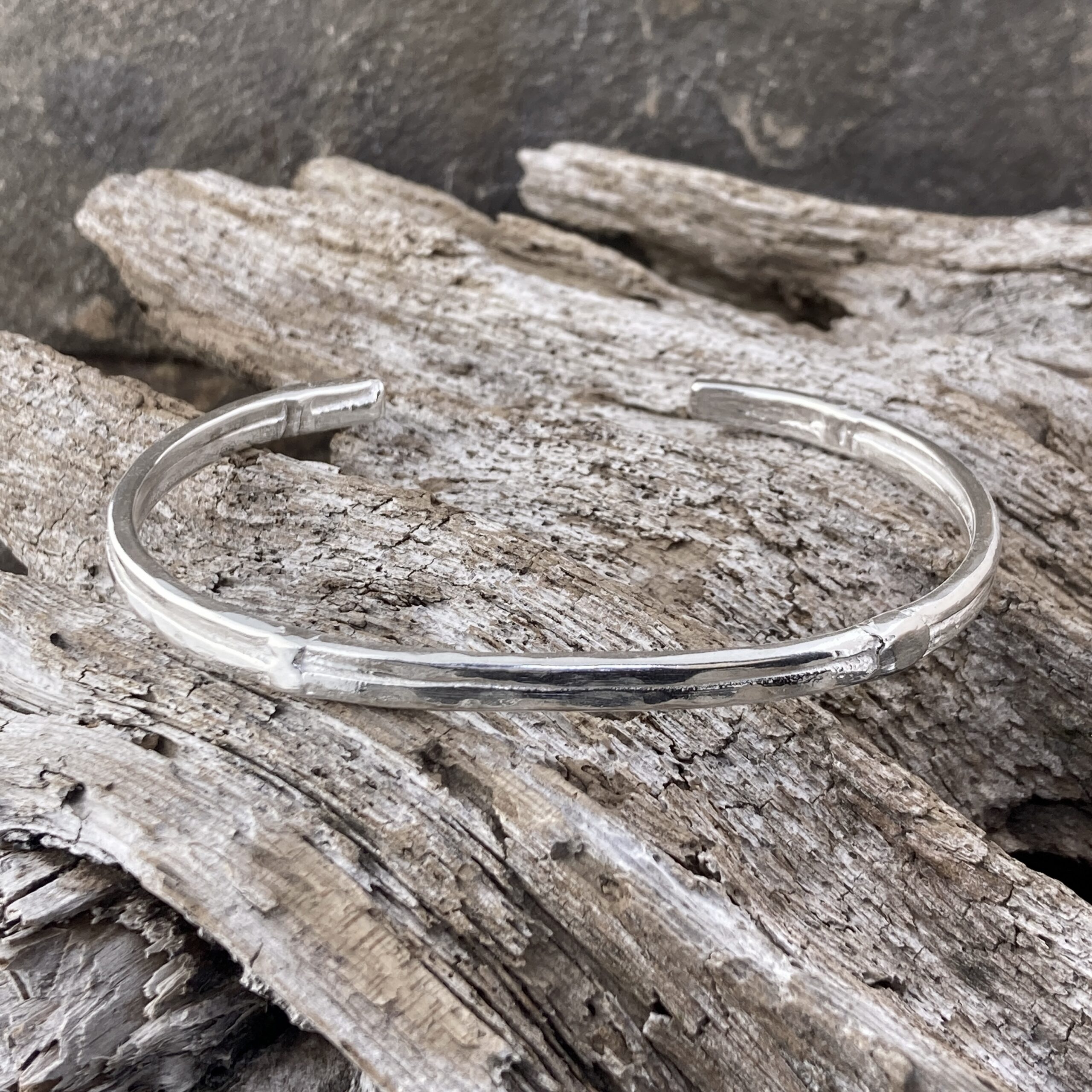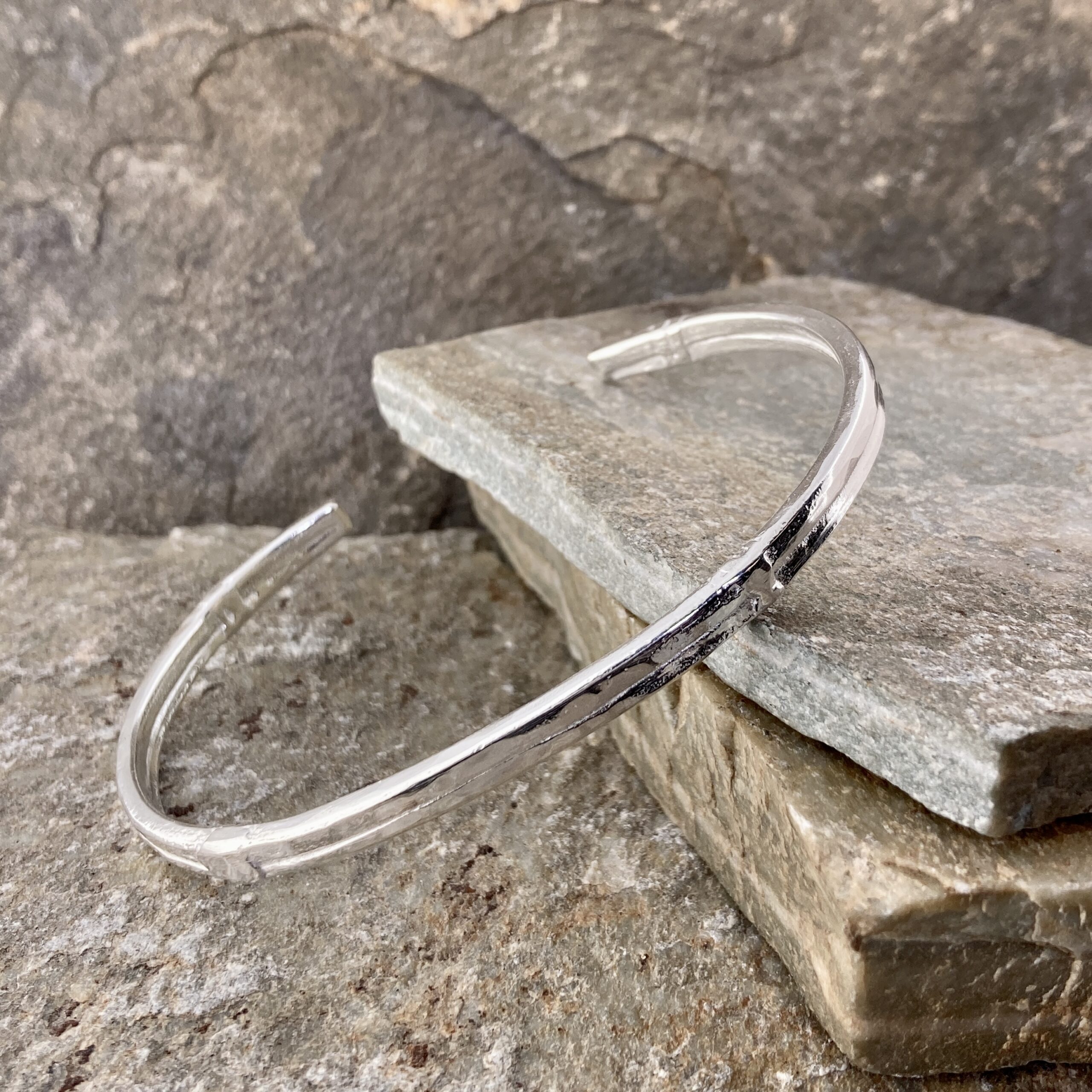 First, I melt and draw Argentium into two rough wires. Next, I set them in parallel and fuse the seam for strength. Then I add and finish the bracket details, true the oval, and smooth every edge. After that, I bring up the polish so high points shine while the fused line keeps its hand-made character. Finally, I give the cuff a durable finish so the form reads sharp and intentional.