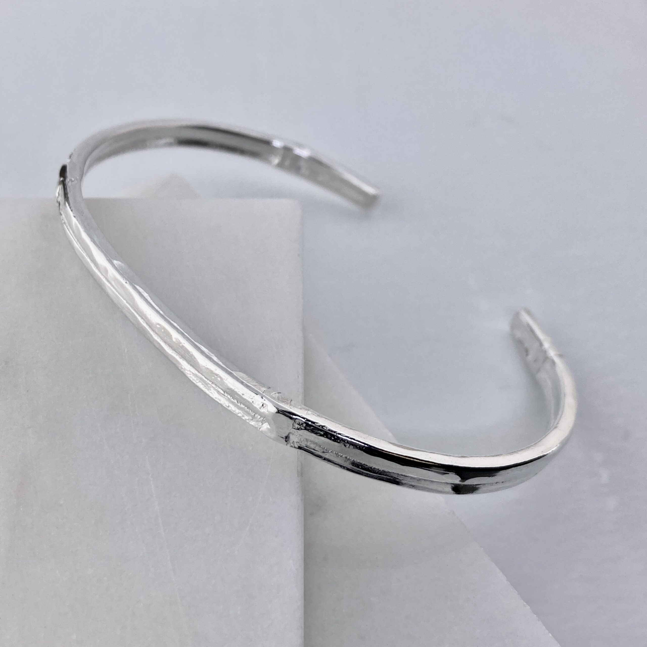 Two fused wires create a narrow, uniform profile that looks refined from a distance and textured up close. The band stays a consistent 0.5 cm all the way around. Because the edges are smoothed and the oval is carefully trued, the cuff sits naturally on the wrist and feels comfortable through the day.