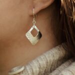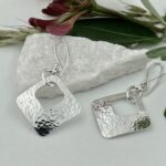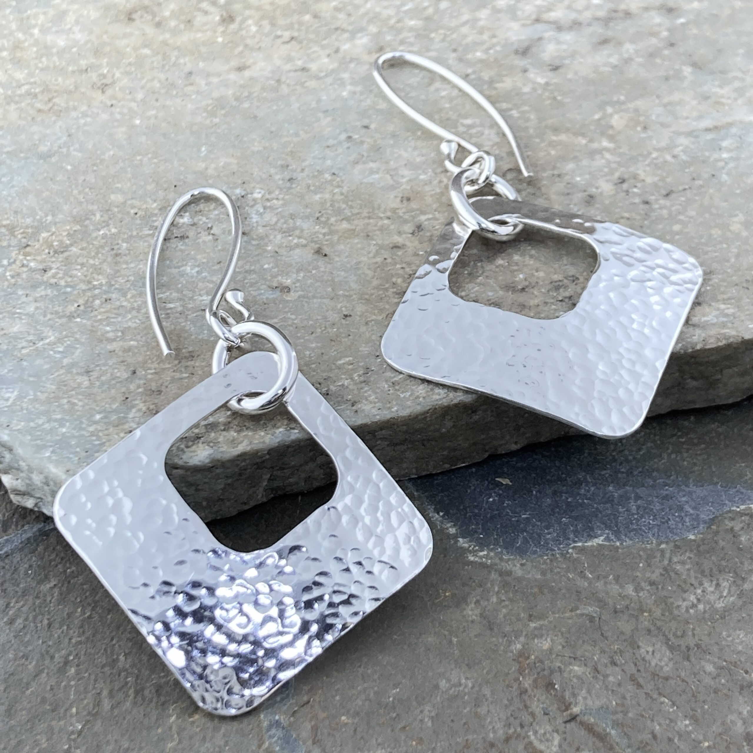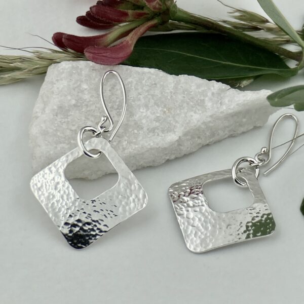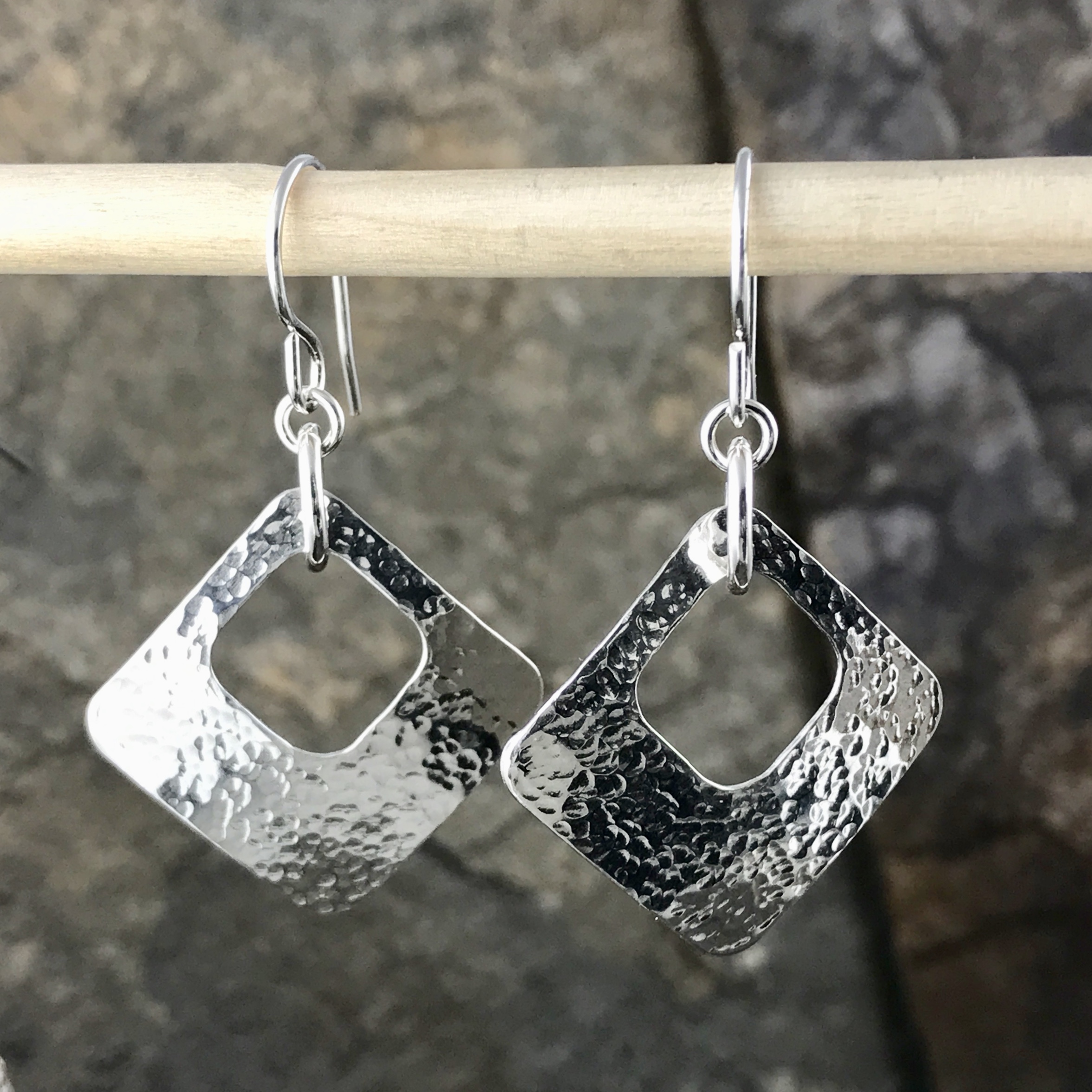 These earrings are hand-hammered silver cut in a diamond shape. With a diamond cut-out in the centre for a beautiful design detail.