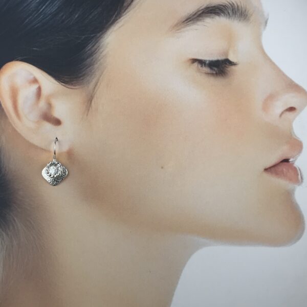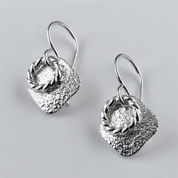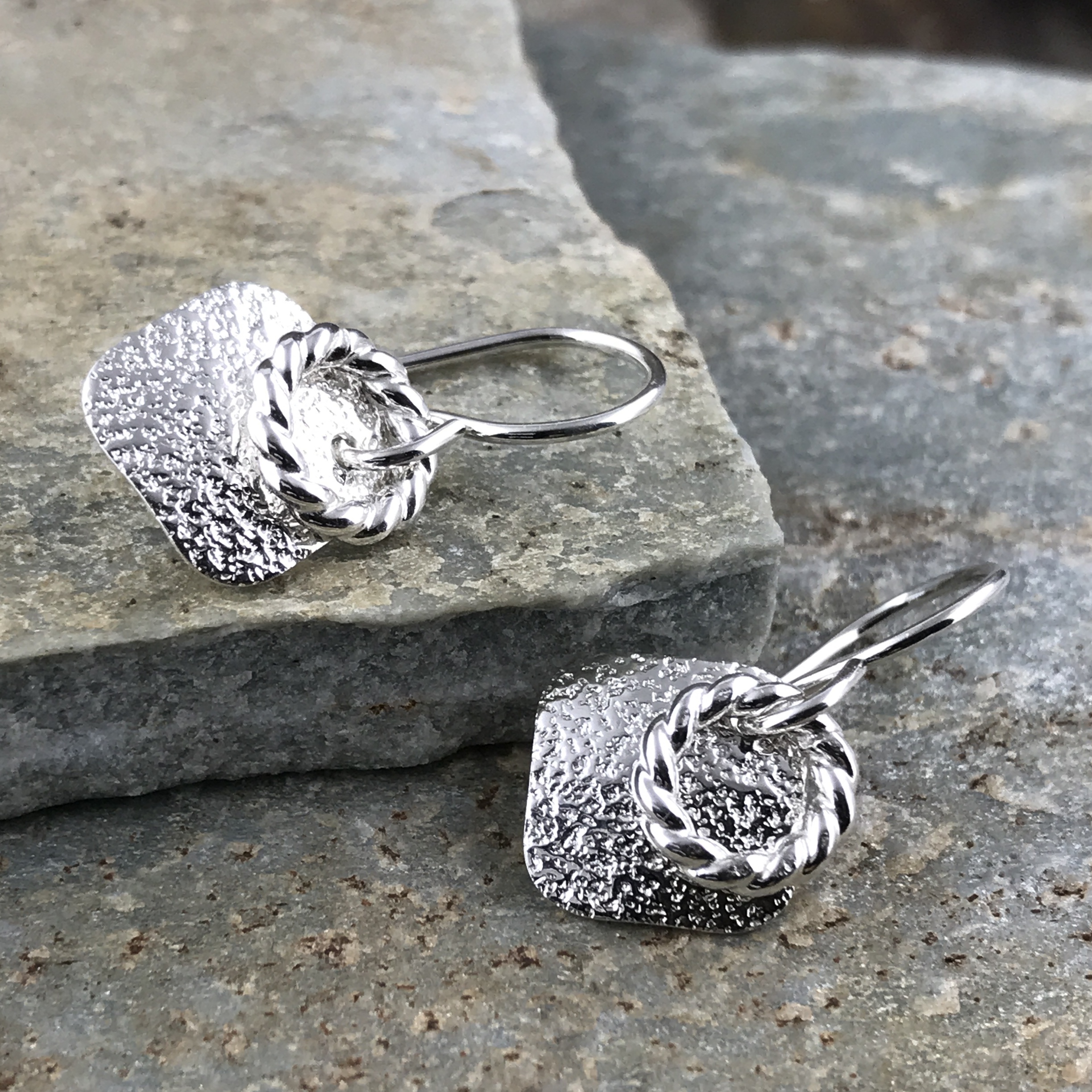 A little shorter than its sister. I have stacked the two design elements on top of each other for a shorter length and interest of design. I textured the little silver diamond with sand – for a subtle sparkle.
