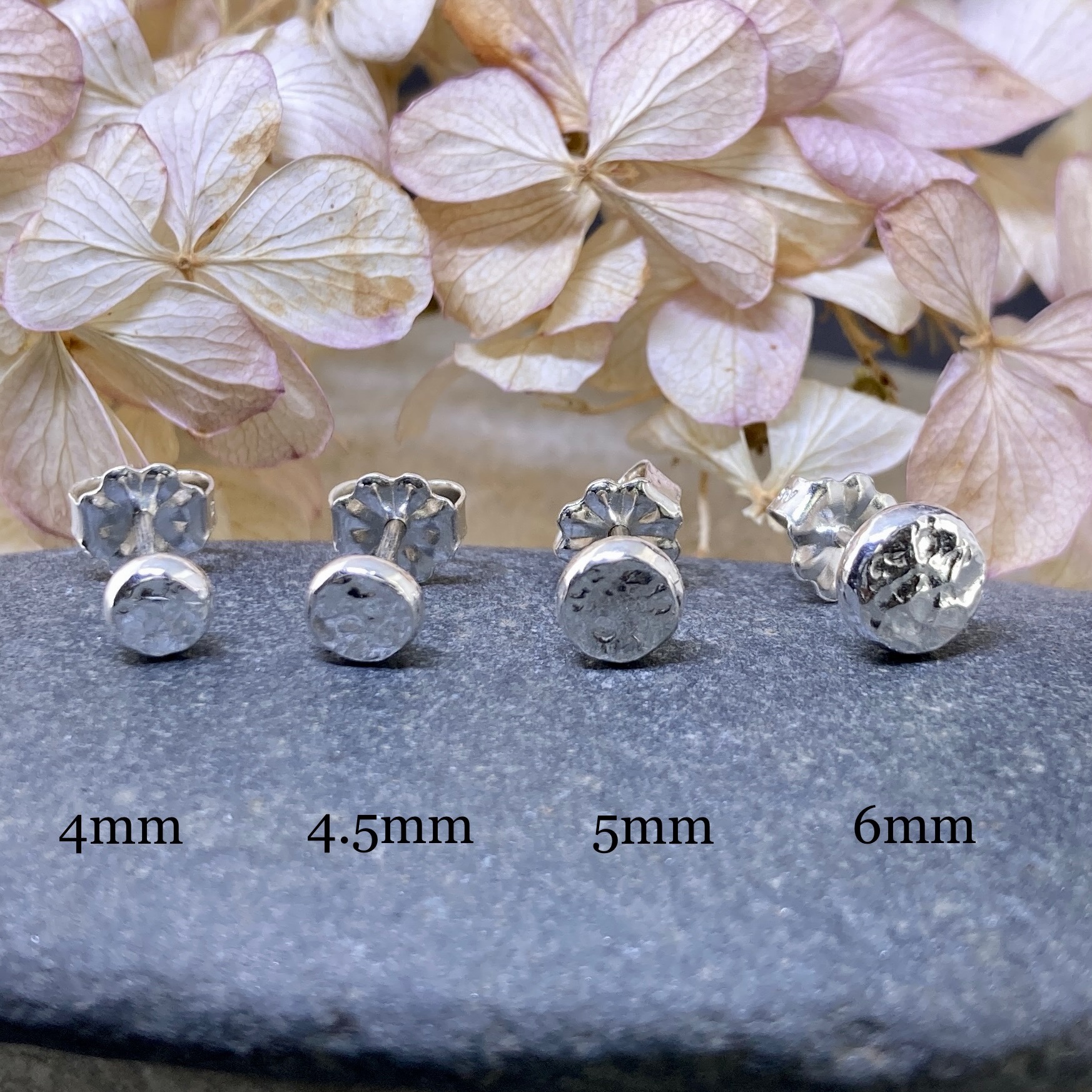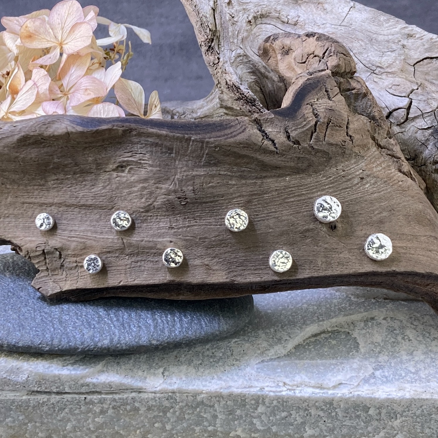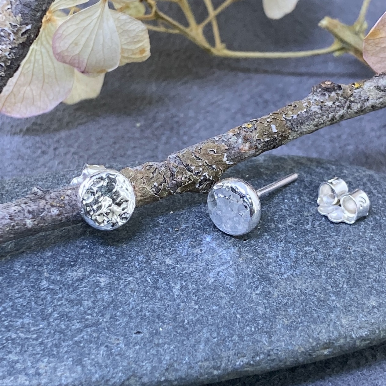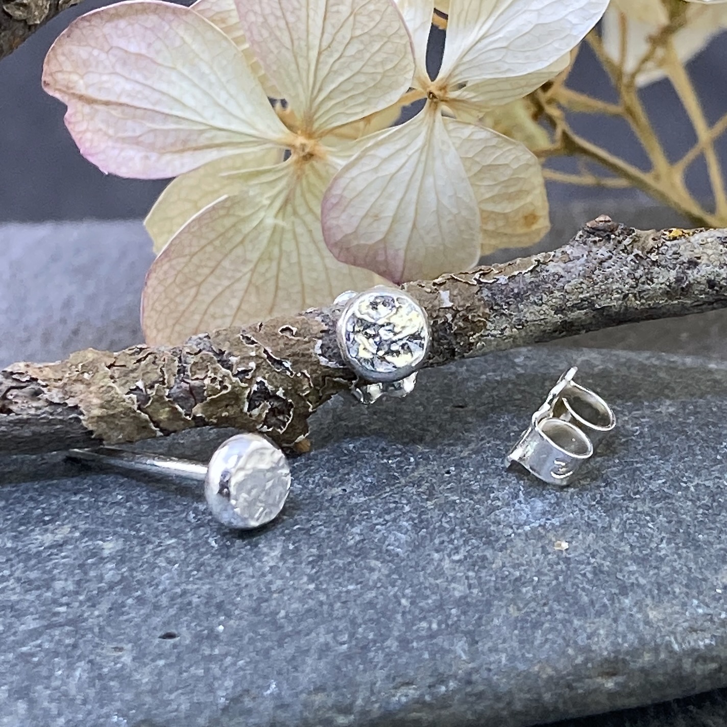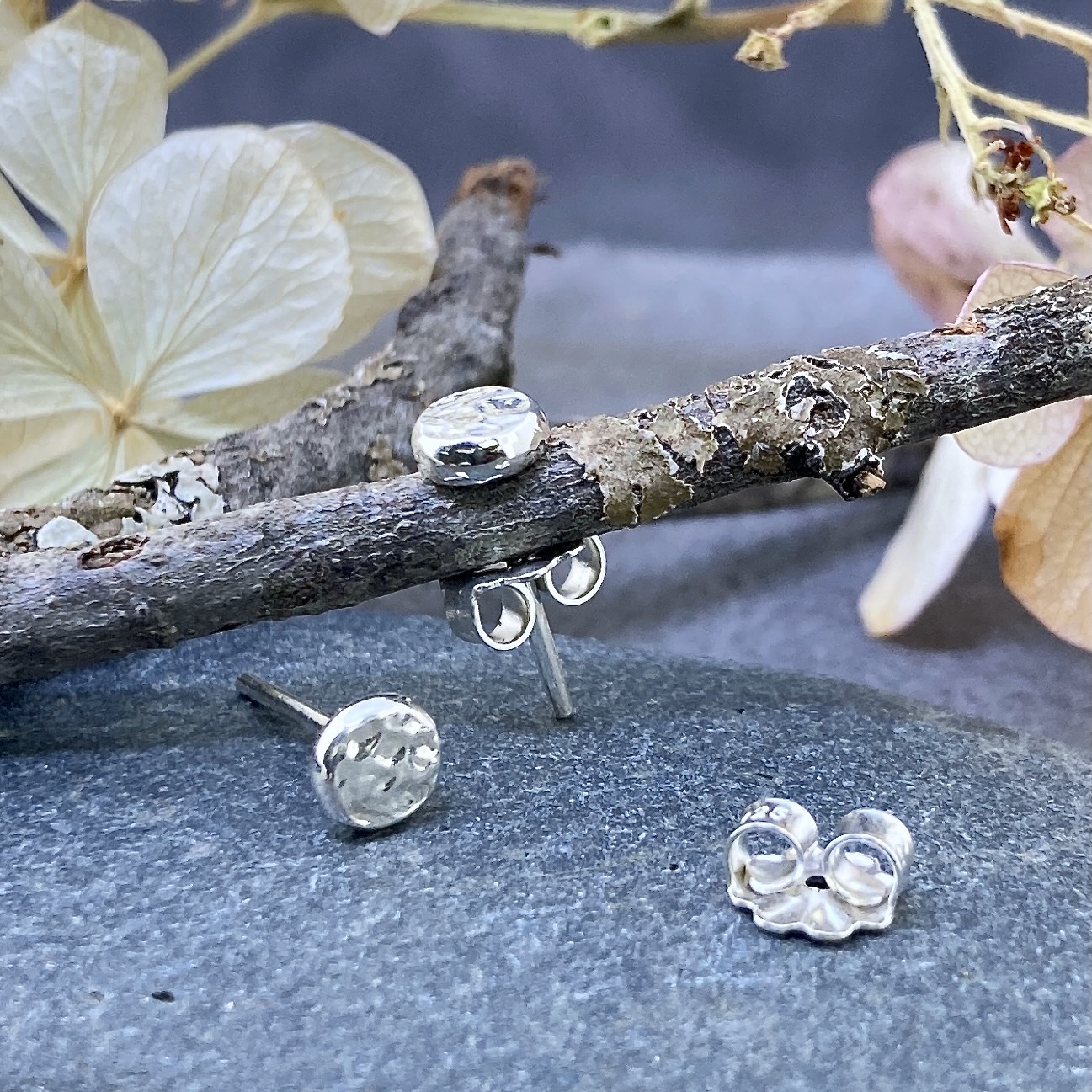 I melt solid Argentium silver into round beads, flatten them slightly, and hammer to texture the surface. After soldering on the posts, each earring is polished and heat-treated to activate the germanium oxide layer. The result is a durable, bright finish that lasts.
