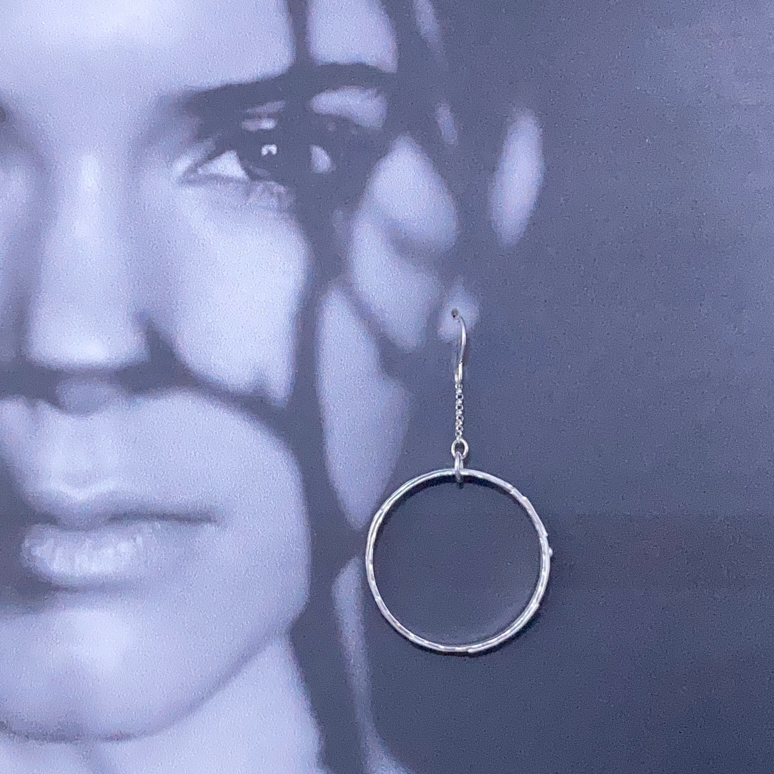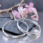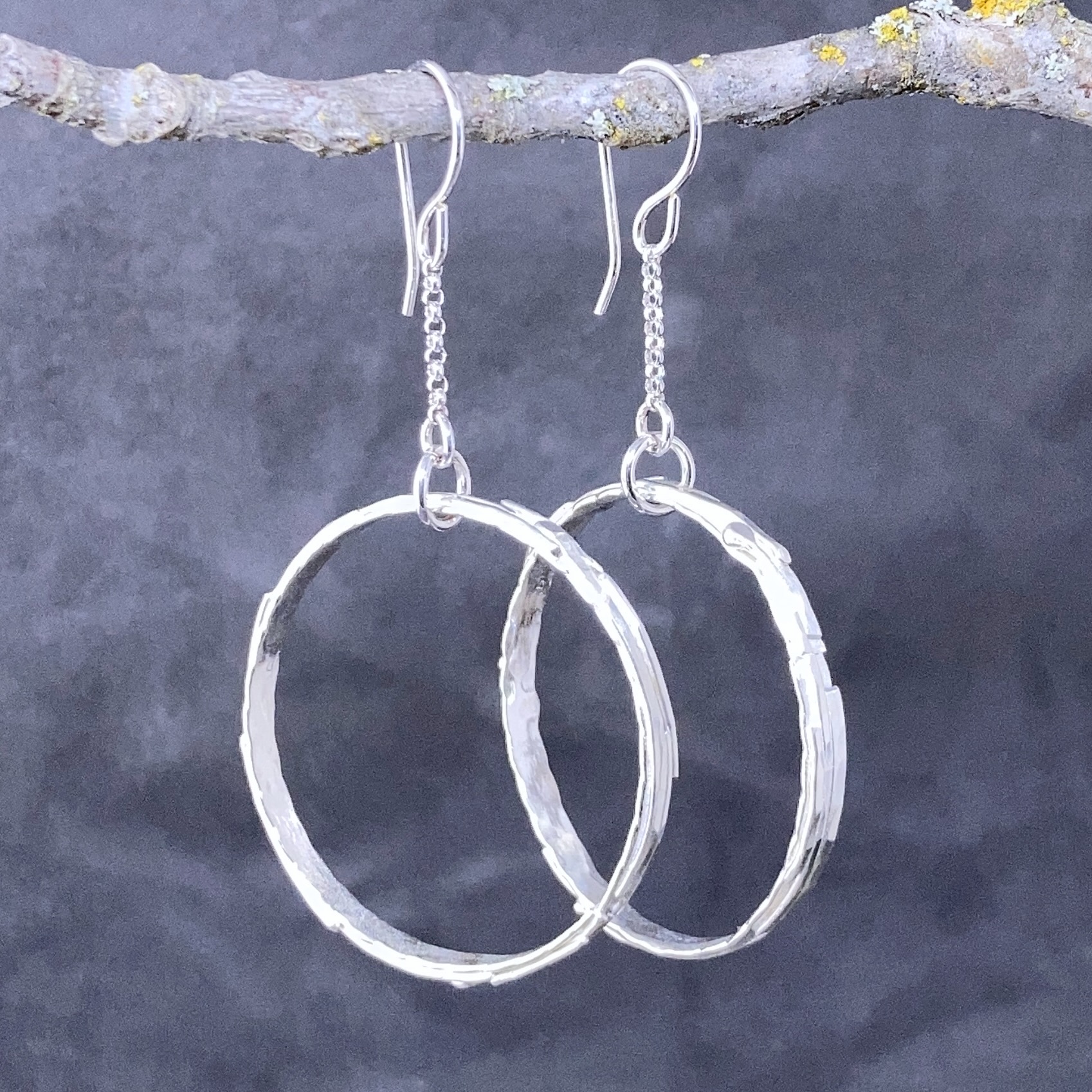An Argentium silver Bark design earring.  I make the Bark texture by starting with a thin sheet of silver and then adding small bits of silver and fusing it all together.  With a little hammering to blend the texture together – and then it is time to shape into a hoop.  I solder the bark hoop together then add Jump rings, Rolo chain and an Argentium ear wire for a floating design hoop earring.