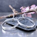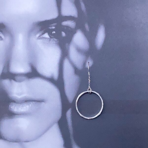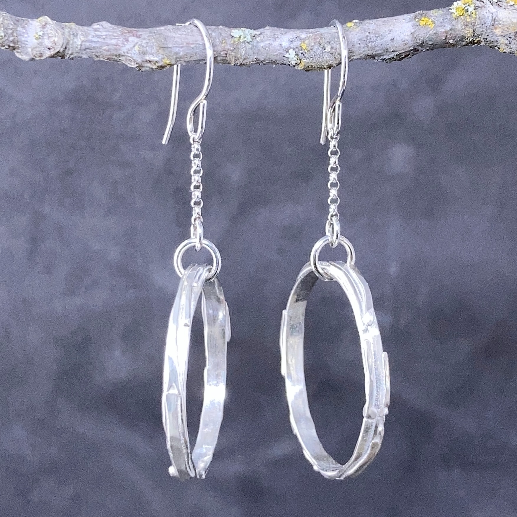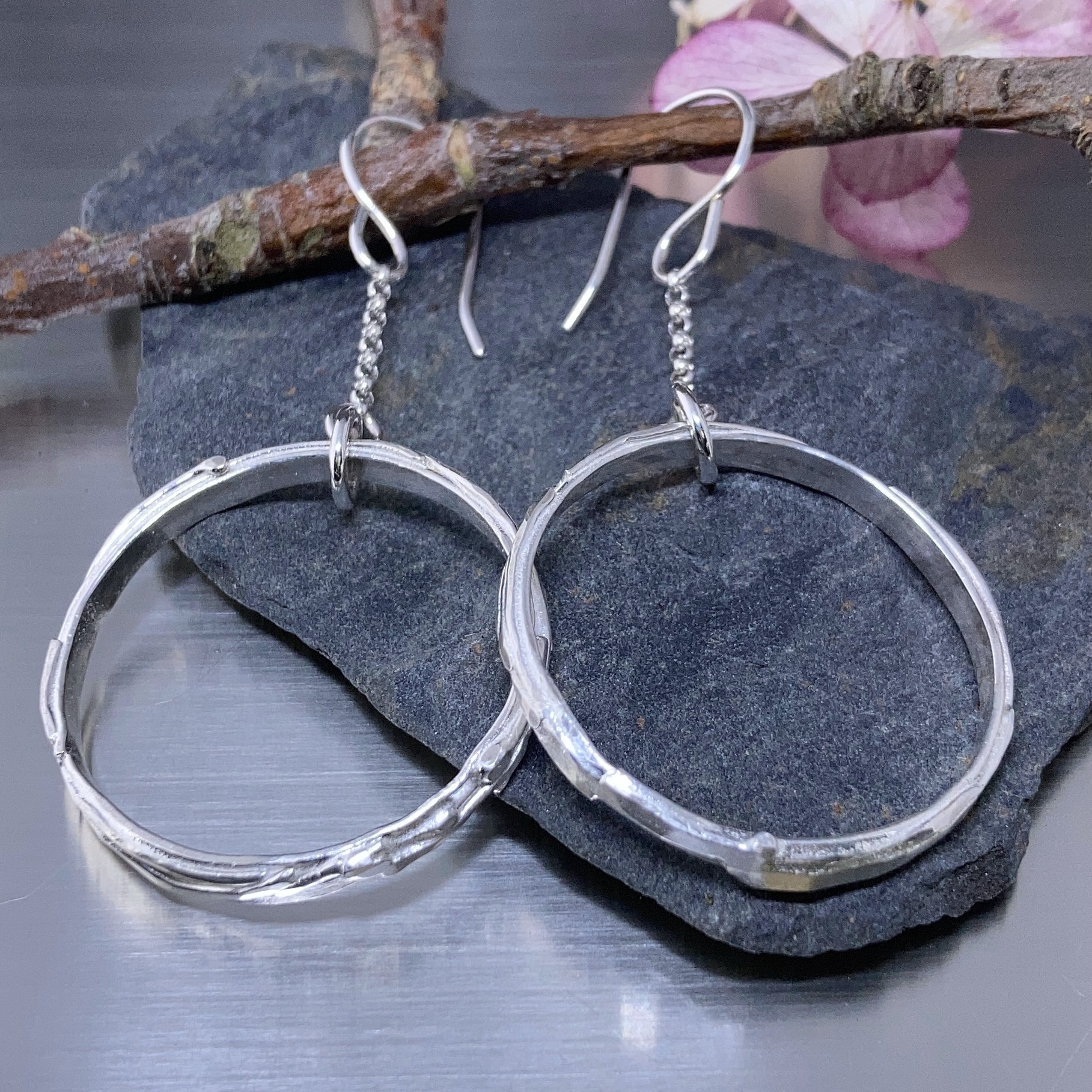 An Argentium silver Bark design earring.  I make the Bark texture by starting with a thin sheet of silver and then adding small bits of silver and fusing it all together.  With a little hammering to blend the texture together – and then it is time to shape into a hoop.  I solder the bark hoop together then add Jump rings, Rolo chain and an Argentium ear wire for a floating design hoop earring.