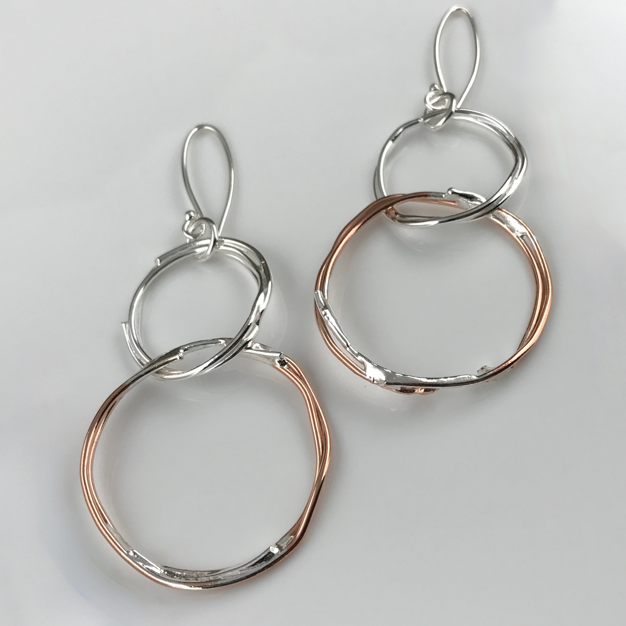 Handmade from solid Copper and Argentium silver  wire.  I wrap the wire to form a rough hollow boulder – interlinking them as I go.  Then I carefully fuse each one by adding molten Argentium silver.  They are permanently linked thru each other – but not attached.  Lots of movement and play!