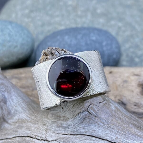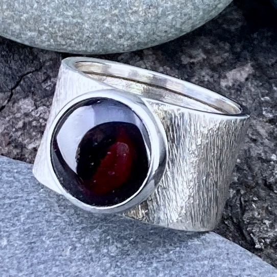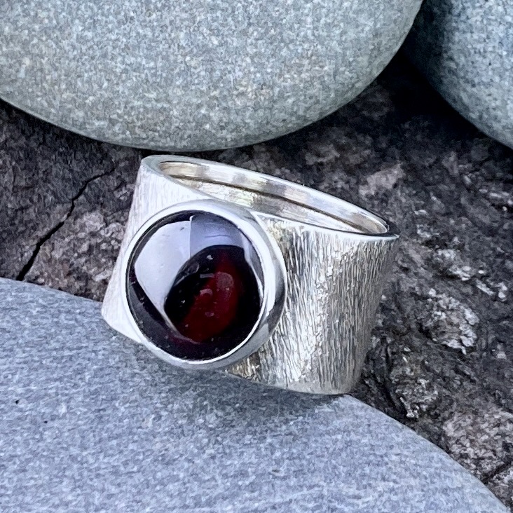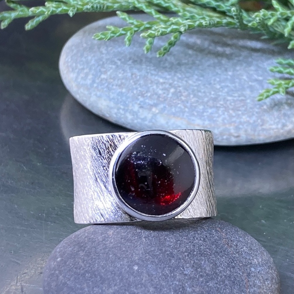 The Garnet Wide Band Ring in Argentium Silver blends strength and warmth. Its broad etched surface holds a deep red gemstone with soft light and quiet power. The design is bold but smooth, built for everyday wear and lasting beauty.