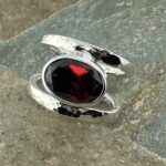 I begin with two rounded silver bands and shape them together for strength and proportion. After fusing the bands, I hammer the surface for texture and light, then polish to reveal contrast. The Garnet is set into a solid bezel, completing a design that joins precision and natural power.