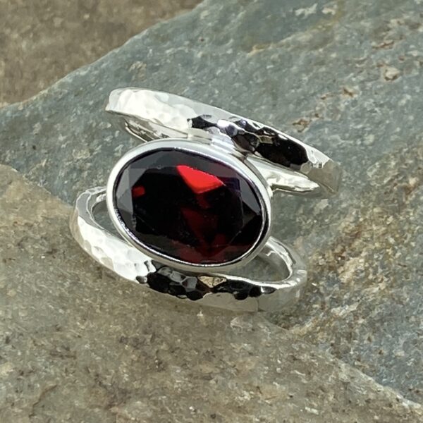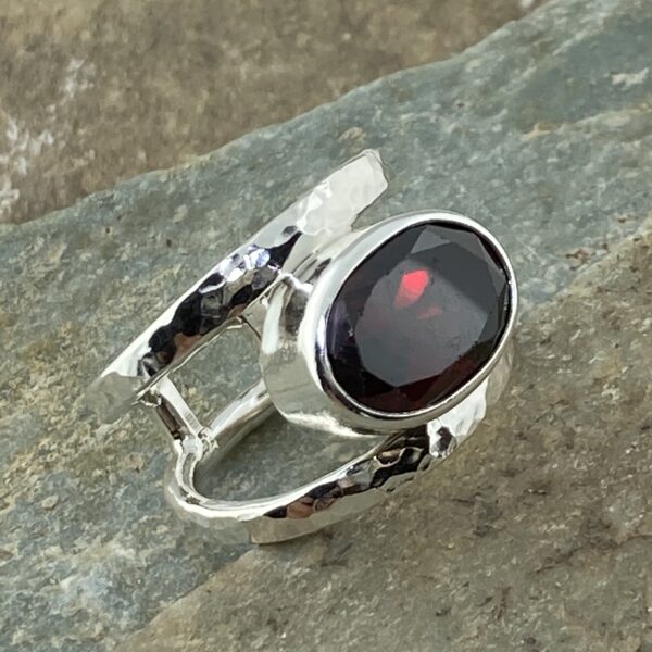 Handmade Garnet ring in Argentium silver with a hammered double band. Oval bezel set gemstone in a bold, refined structure.
