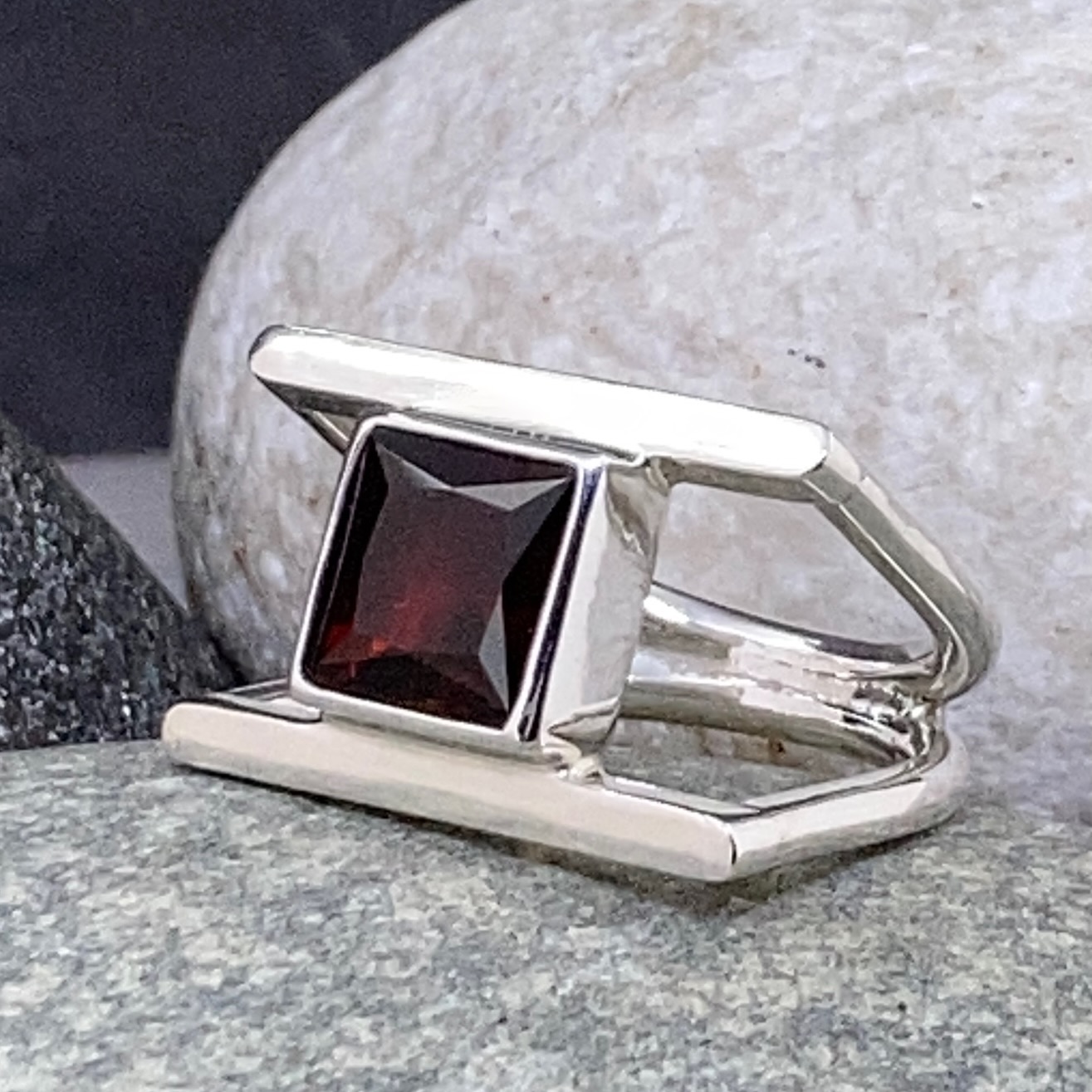 A natural square-cut Garnet (2.5 carat) brings rich, saturated colour and sparkle. The bezel setting holds the stone securely and enhances its geometric precision, reflecting light from all angles while protecting its edges for lasting wear.