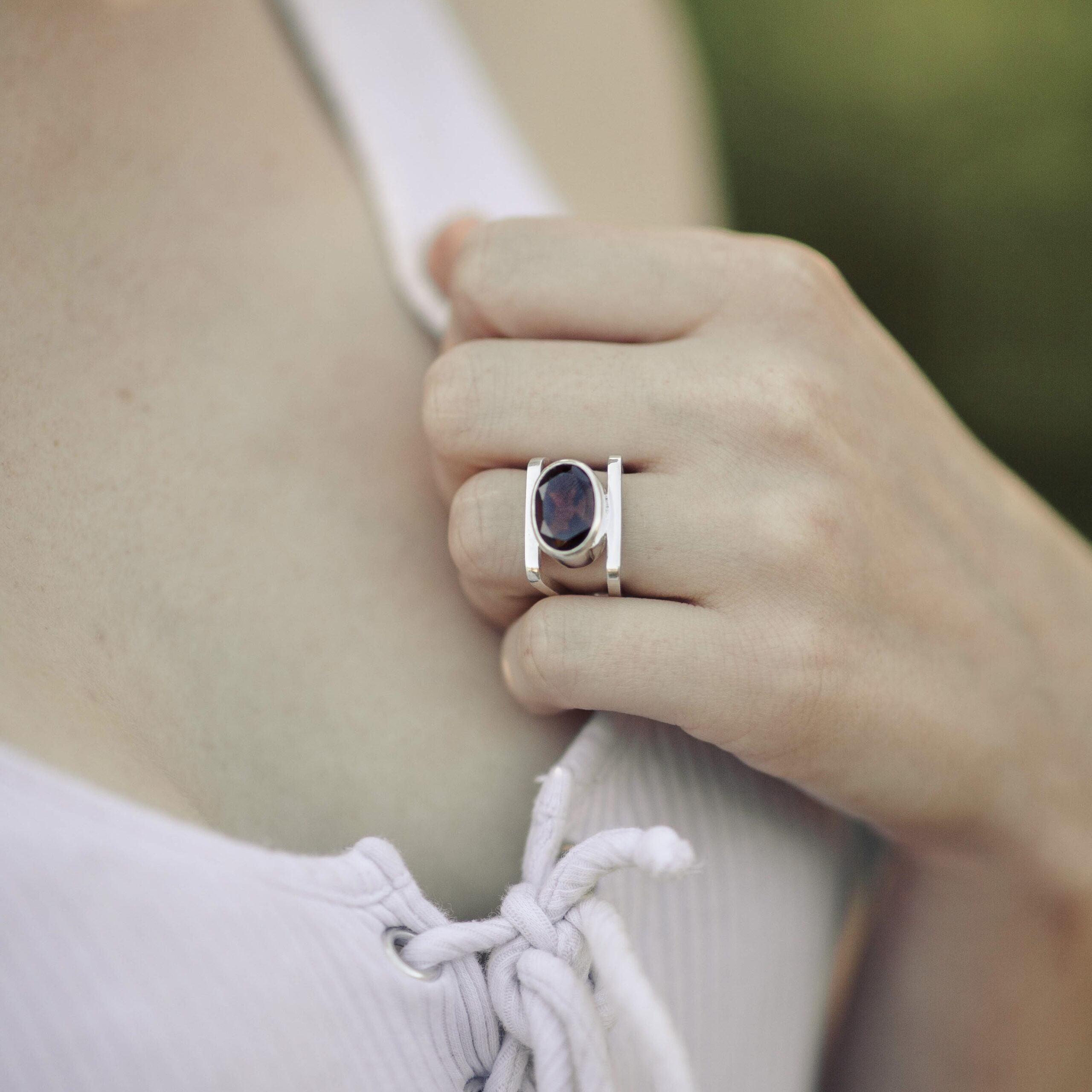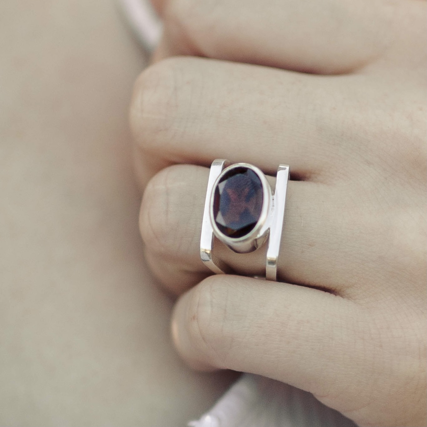 This oval Garnet (~8 carat) shows a rich, dark red tone with flashes of wine and cherry in the light. I set it in a simple bezel so it sits secure and slightly elevated. The contrast between the square silver band and the curved gem gives this piece its striking balance.