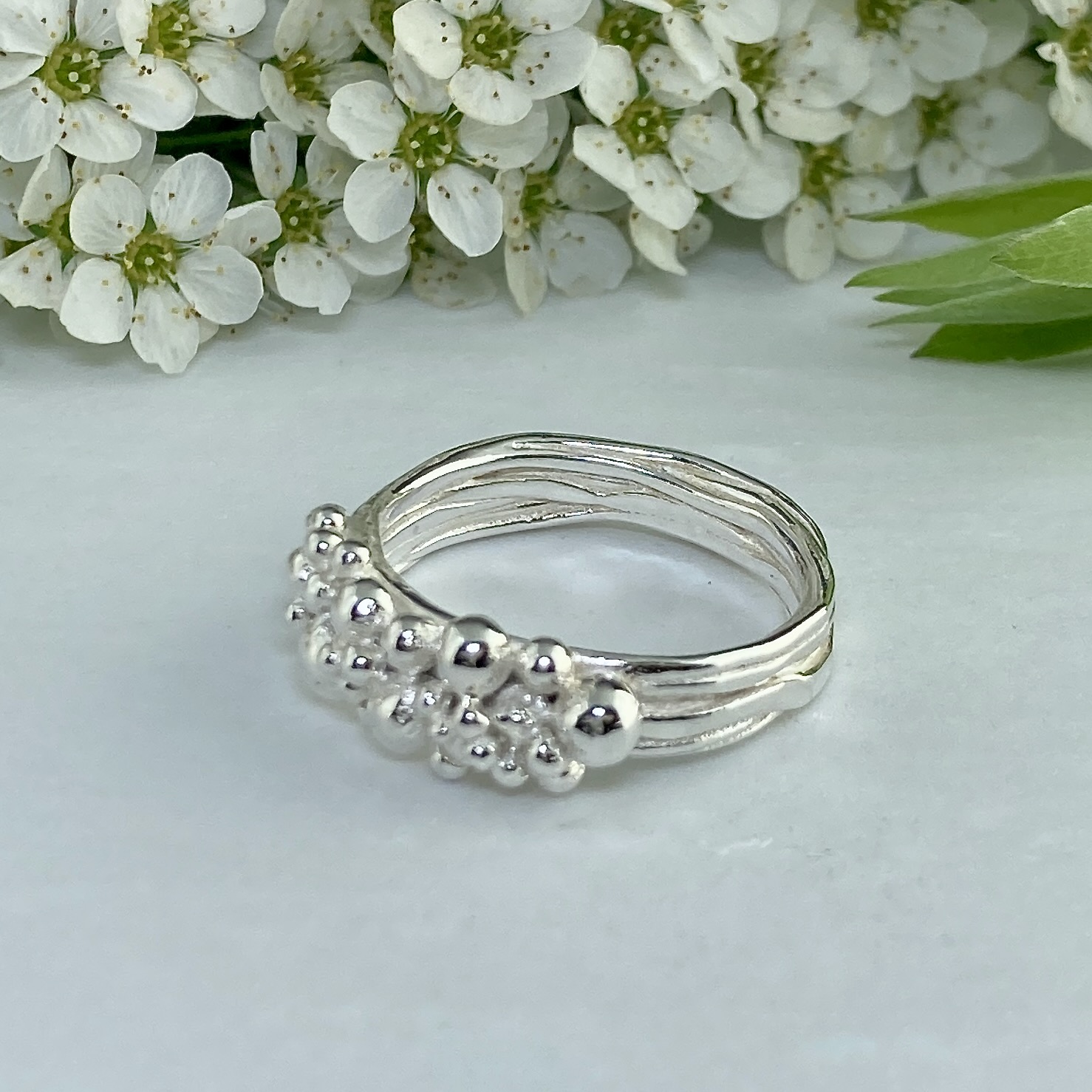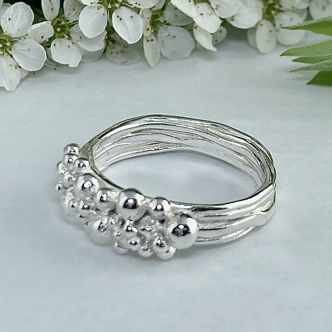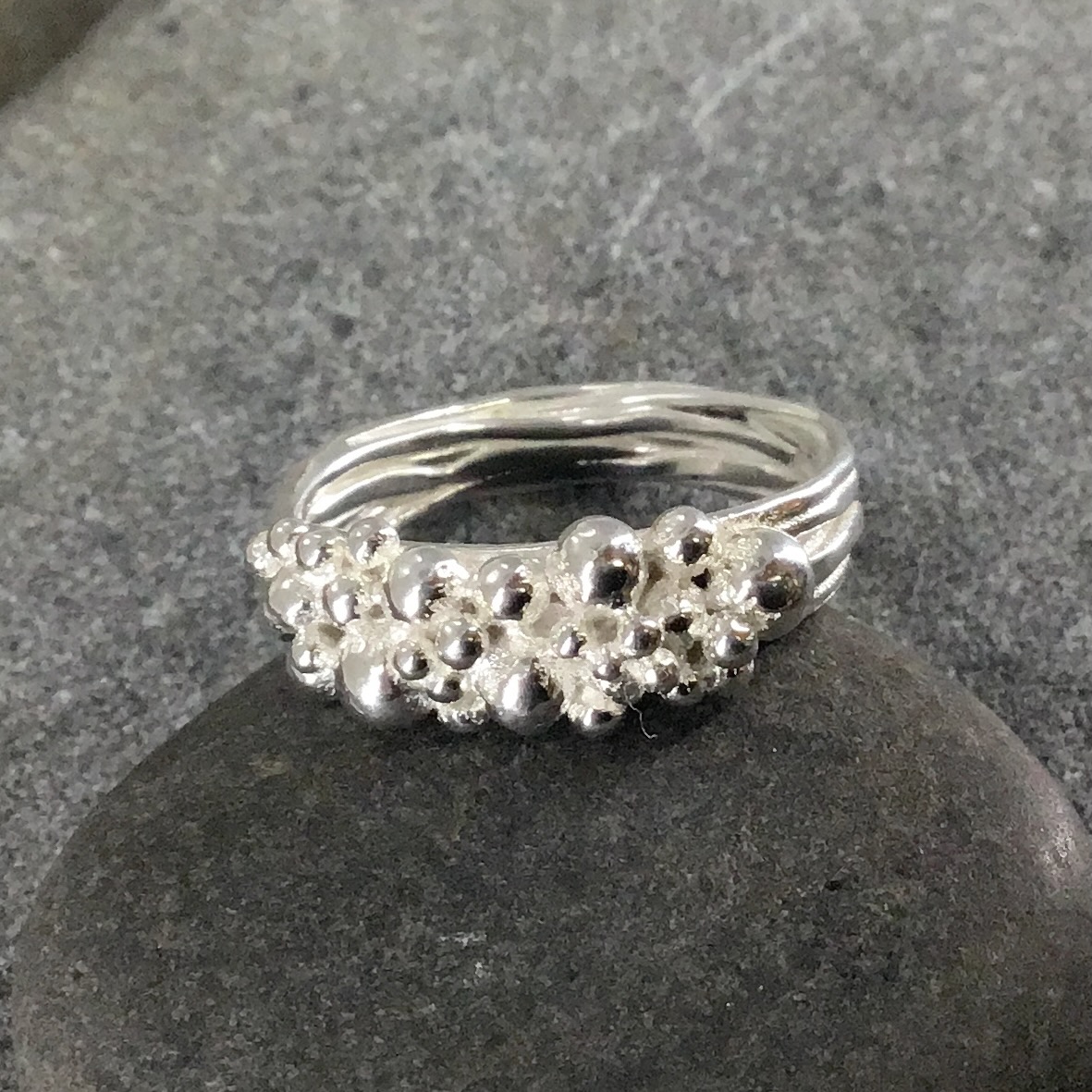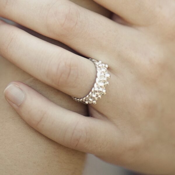 Argentium silver granules fused to a bark textured ring band.  Hand made with solid Argentium Silver.  I melt little bits of silver in all different sizes to make the Granules, and then I play with the layout for attaching to the Bark design Band. Always looking for a balance of size and design.