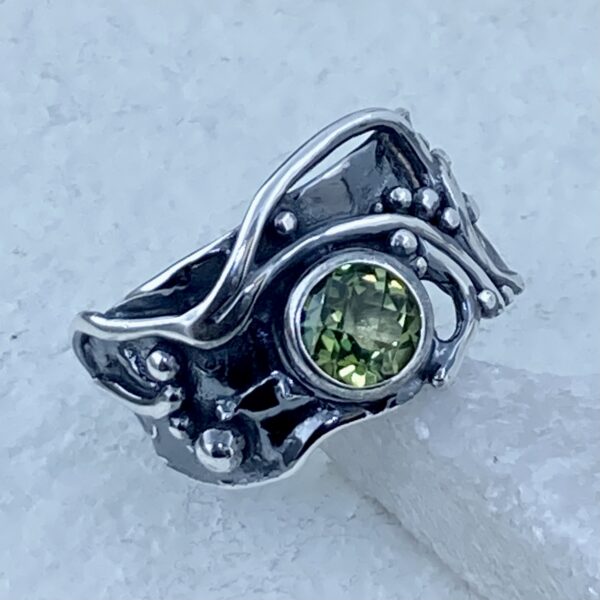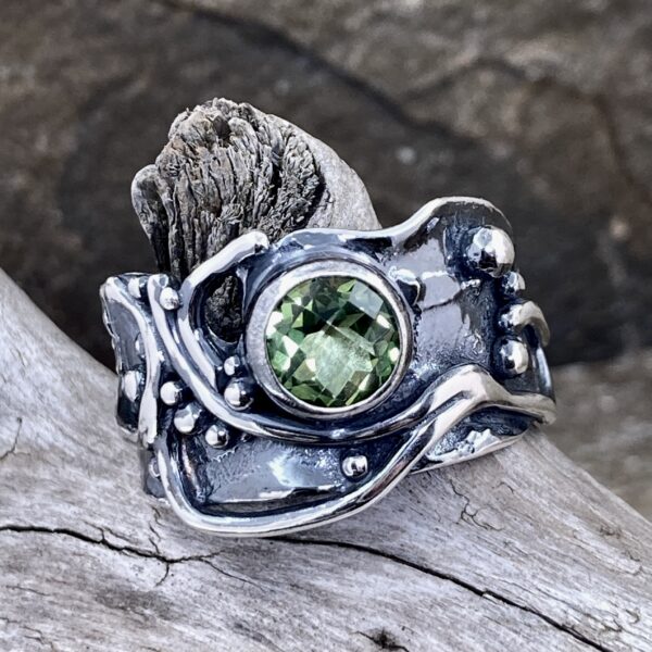 green amethyst ring – size 13.5 – Argentium silver waves – 2 carat