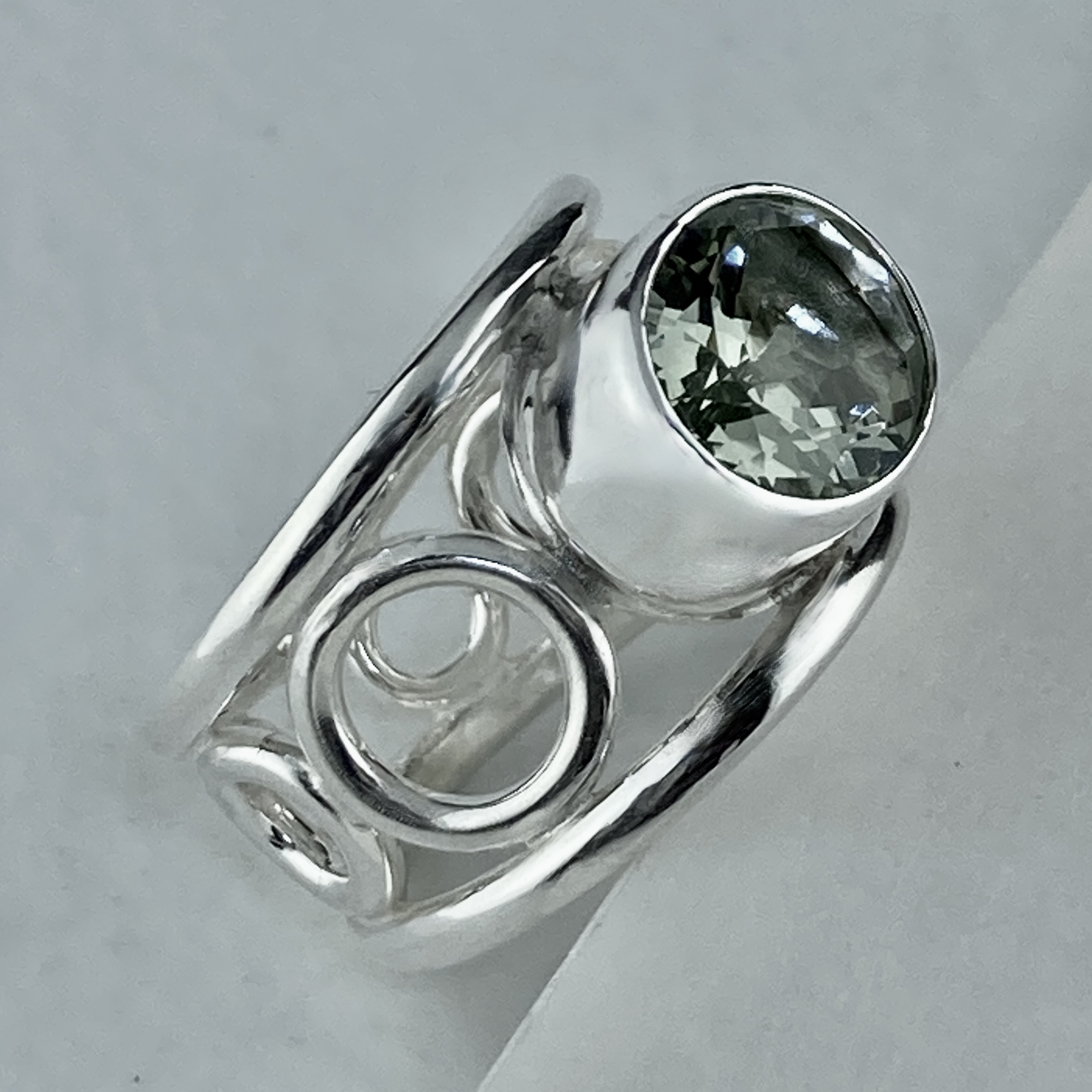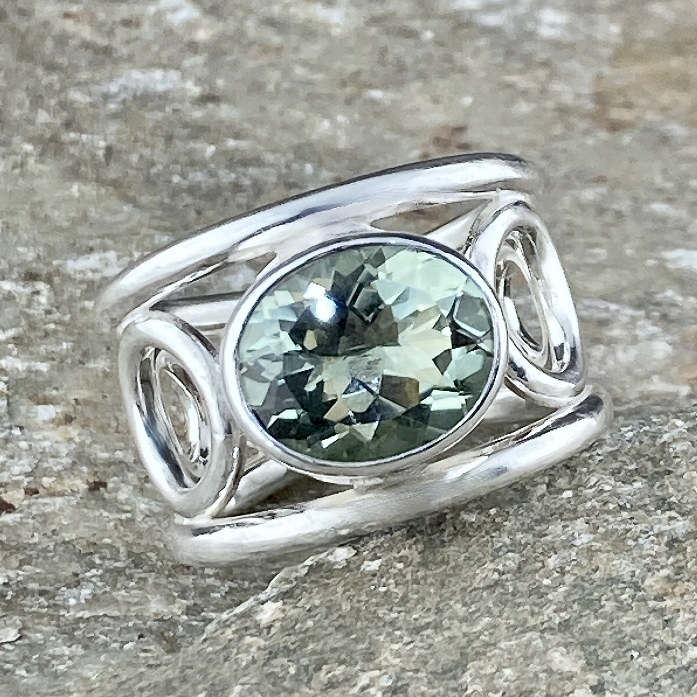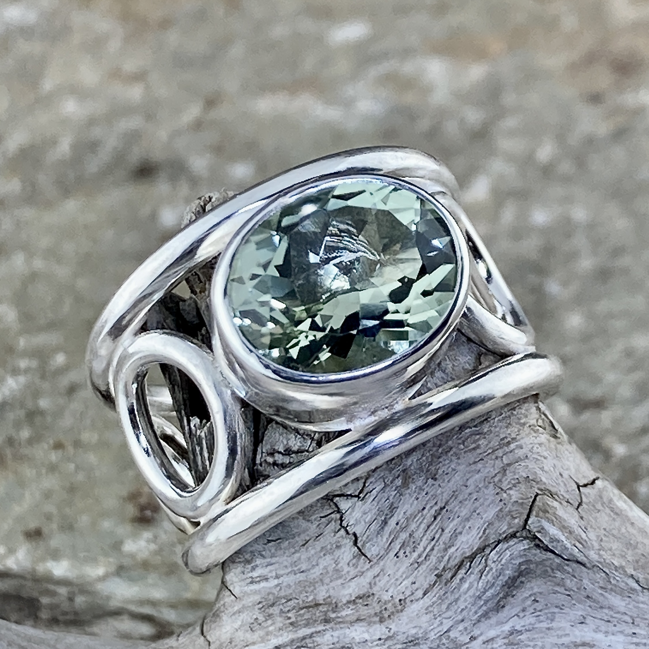 Green amethyst, or prasiolite, carries a soft, cool tone that pairs beautifully with the whiteness of Argentium silver. The gem’s gentle green hue glows in natural light, creating balance between calm transparency and quiet strength.