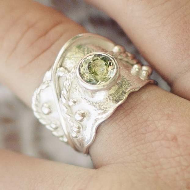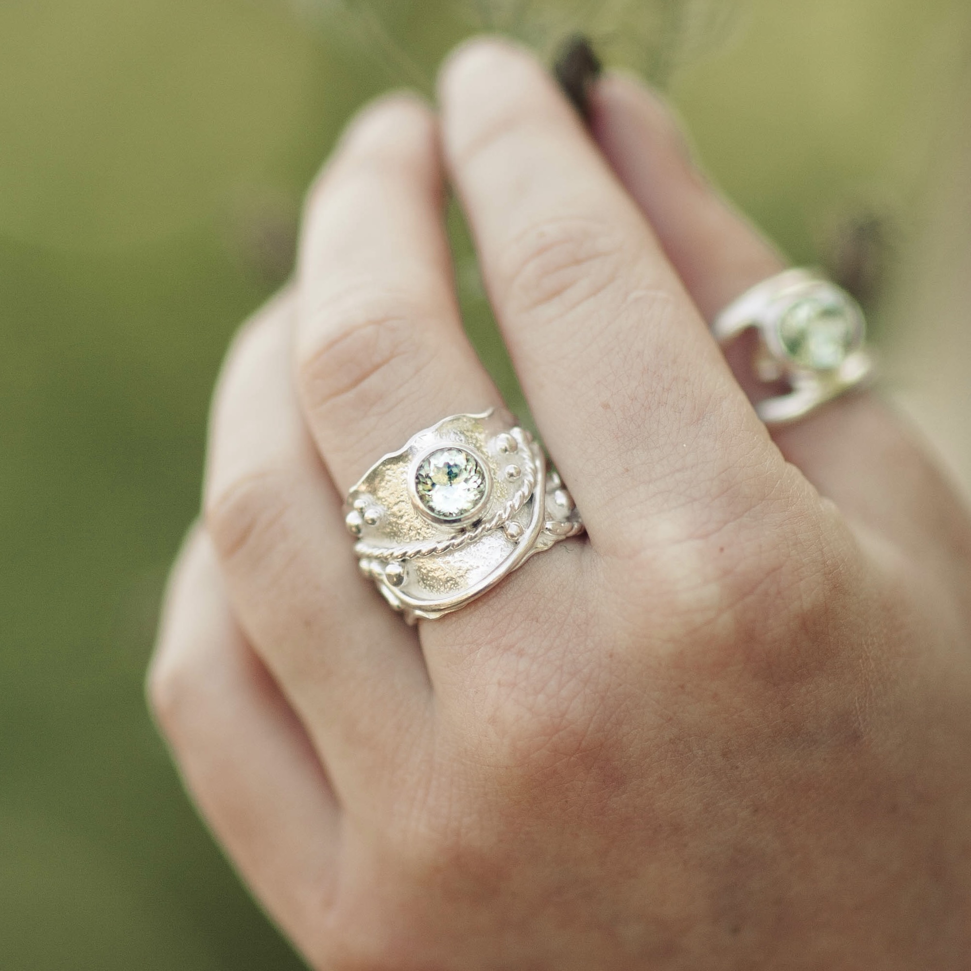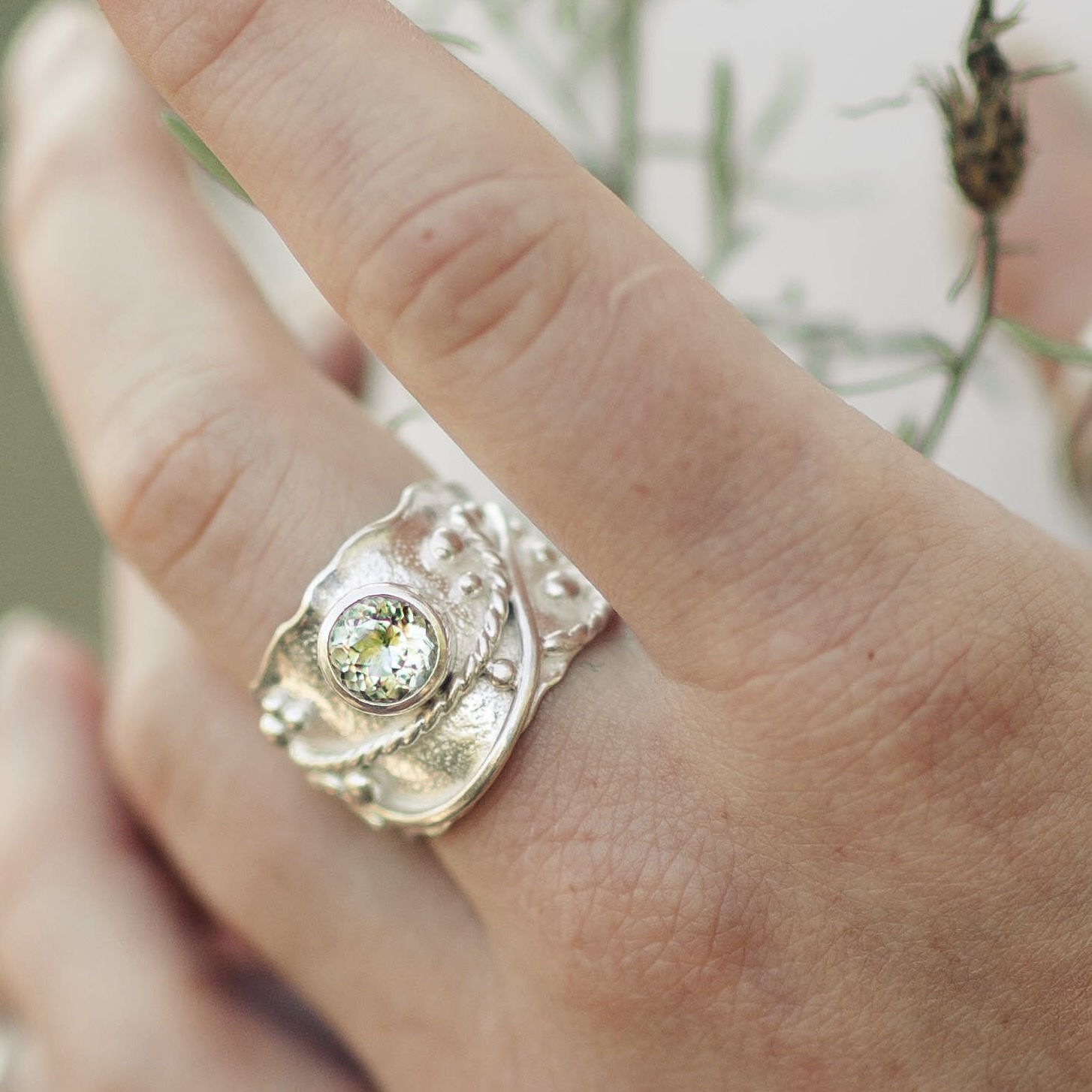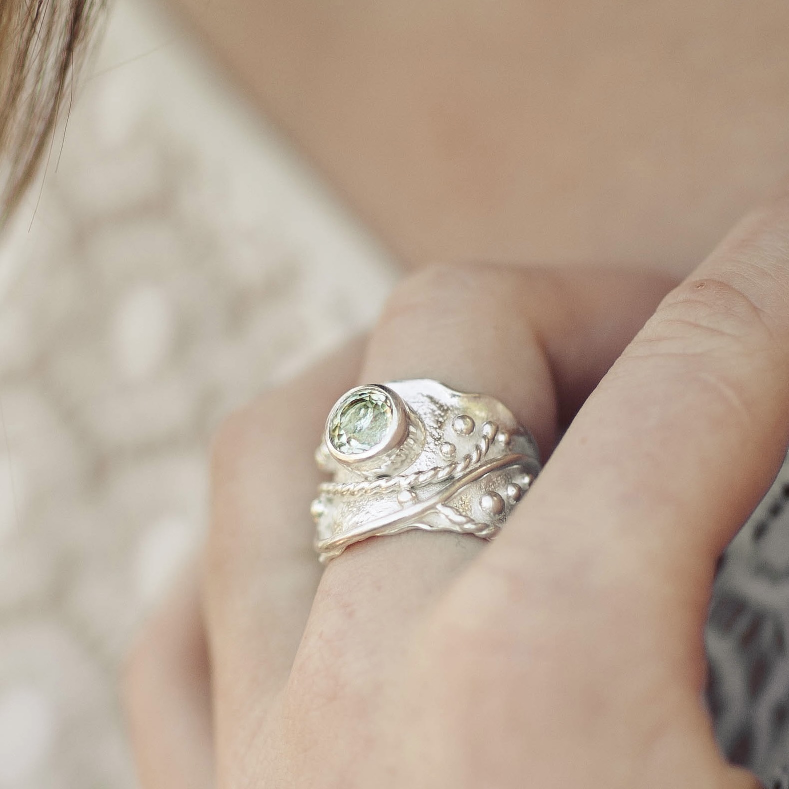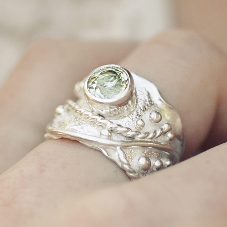The Green Amethyst ring reflects the calm movement of water. Its soft green gemstone and bright silver flow together in a balanced, fluid design. Each ring is handmade for a clean, comfortable fit.