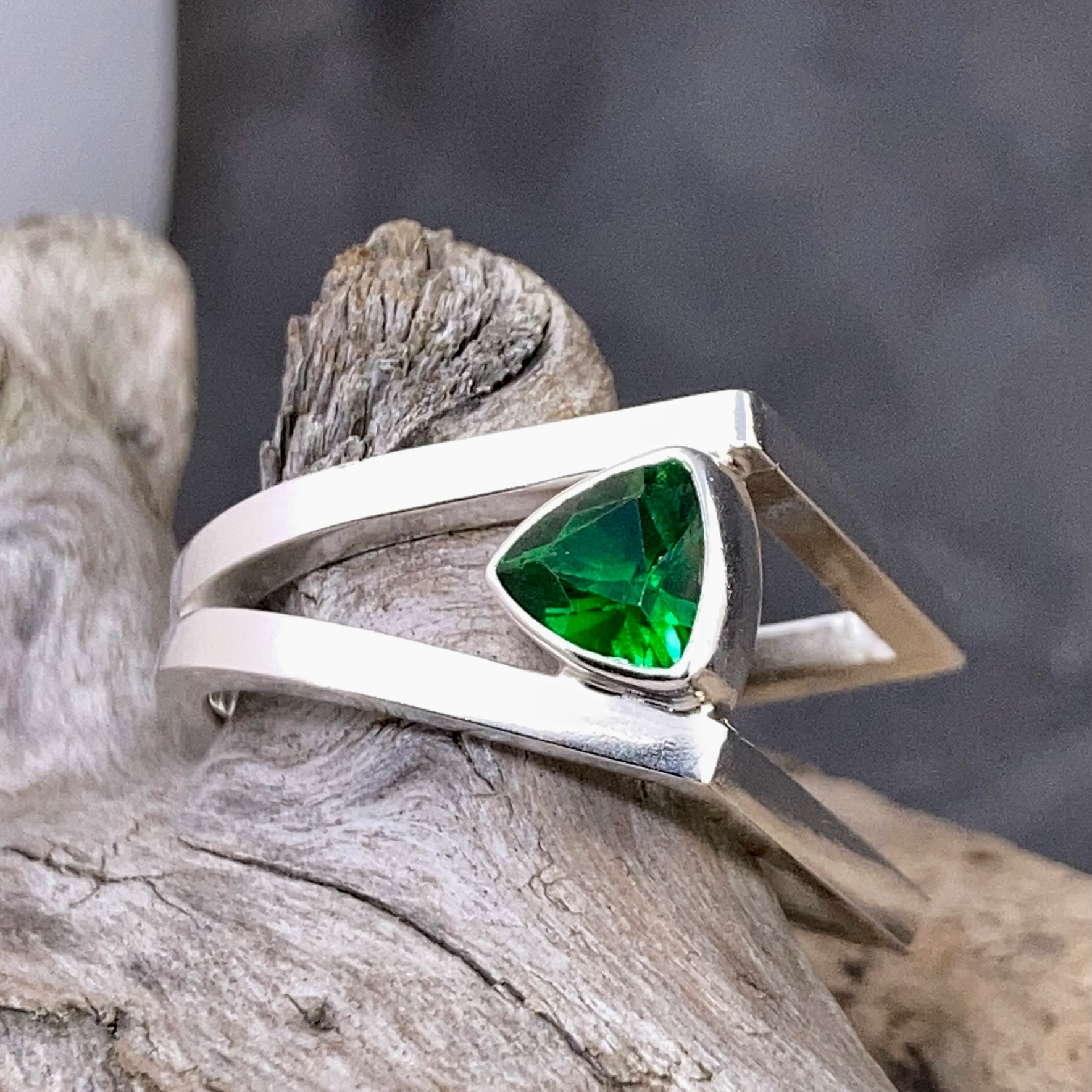 Argentium silver in a D shape, Book design ring.  This is a large size, very heavy Argentium silver ring – with a perfect trillion cut 1.5 carat Green Topaz resting between the two bands of silver.  This would be an excellent ring for either a woman or a man – especially as a first finger ring.