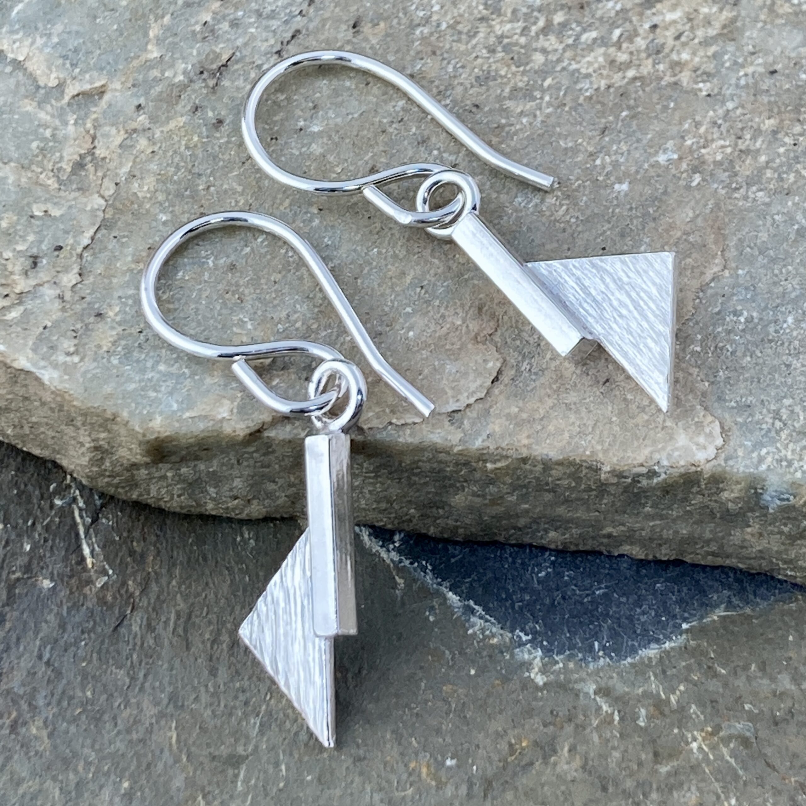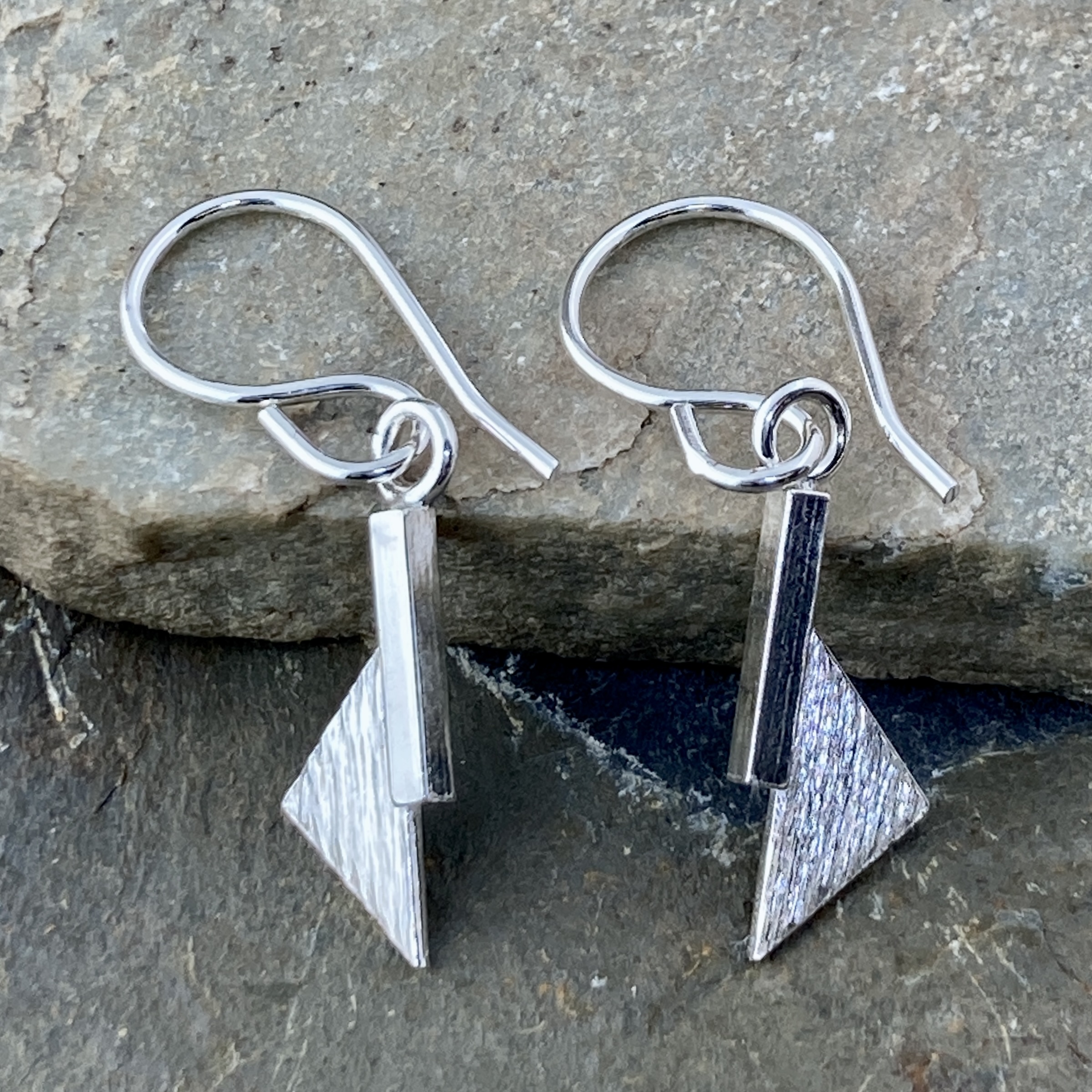 Small Argentium silver geometric earrings.  A small bar on the side of a textured half-diamond.