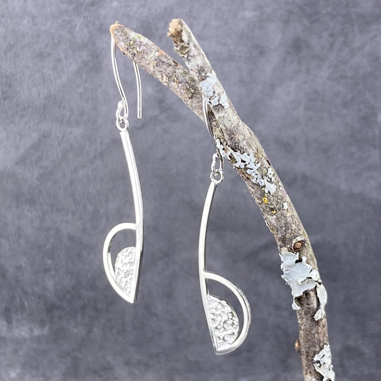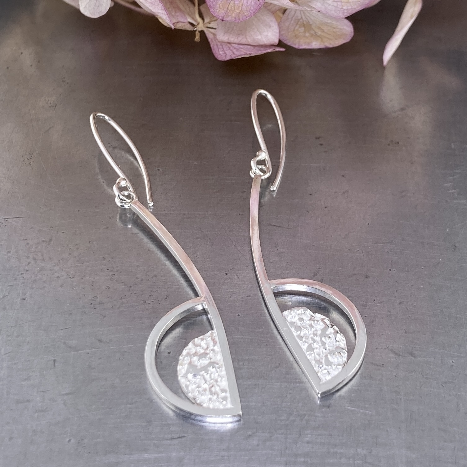 Lunar moon made by moving the silver around while molten, until it resembles the surface of the moon.  Then sun circles are added around the moons.  And a long bar is added for length and detail.