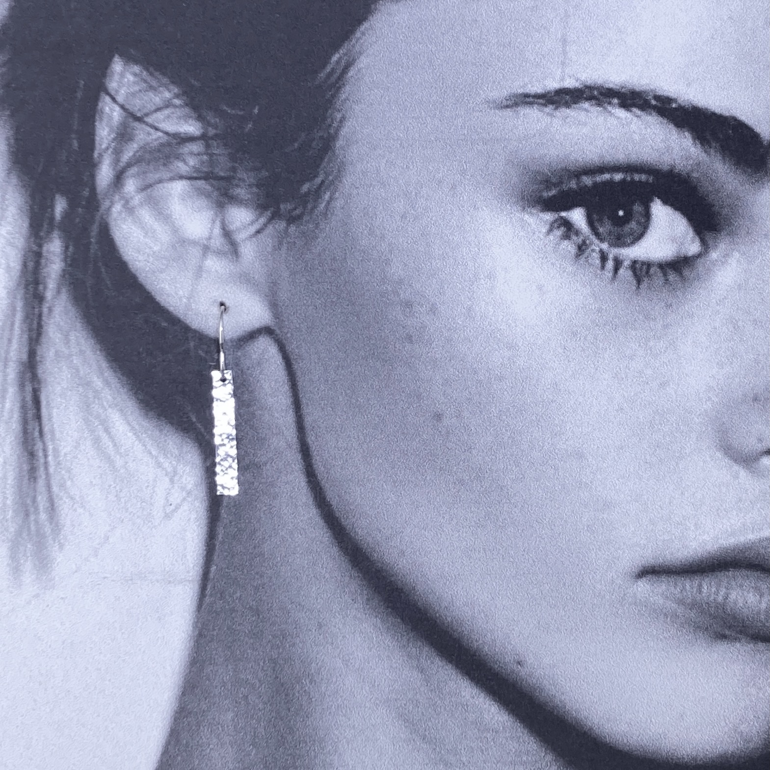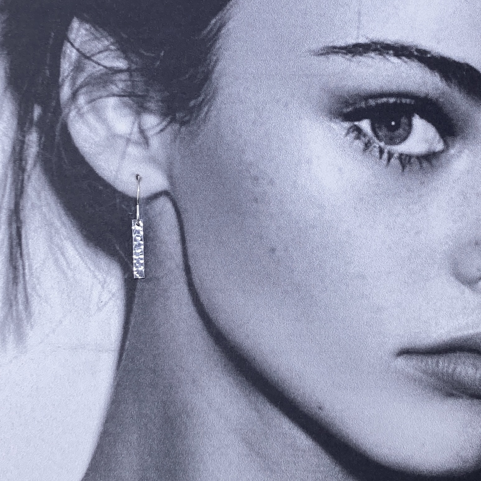 These Argentium Silver Hammered Bar Earrings bring clean lines and bright texture together in a simple, modern form. Each bar is hand-cut and hammered for a fine surface pattern that reflects light with every movement. The look is polished yet strong — a balance of geometry and sparkle.