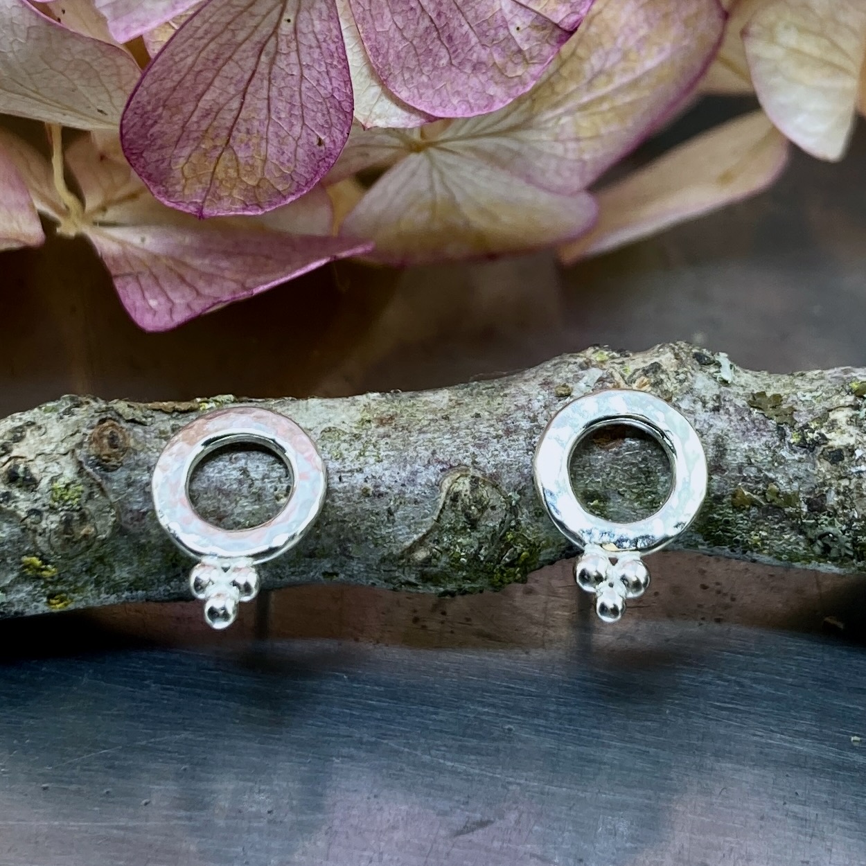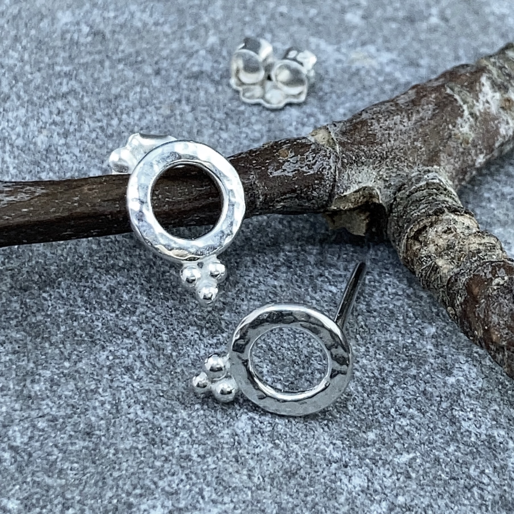 Little round boulders with a hand hammered texture. Â Then little granule piles fused on the bottom. Â This is the small size post earring of this design.