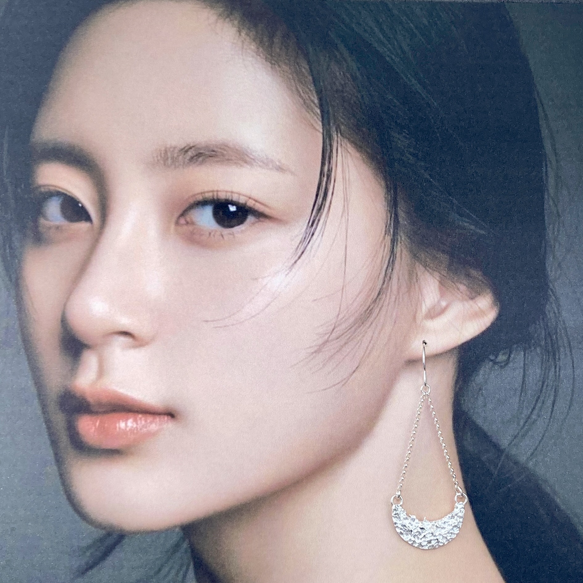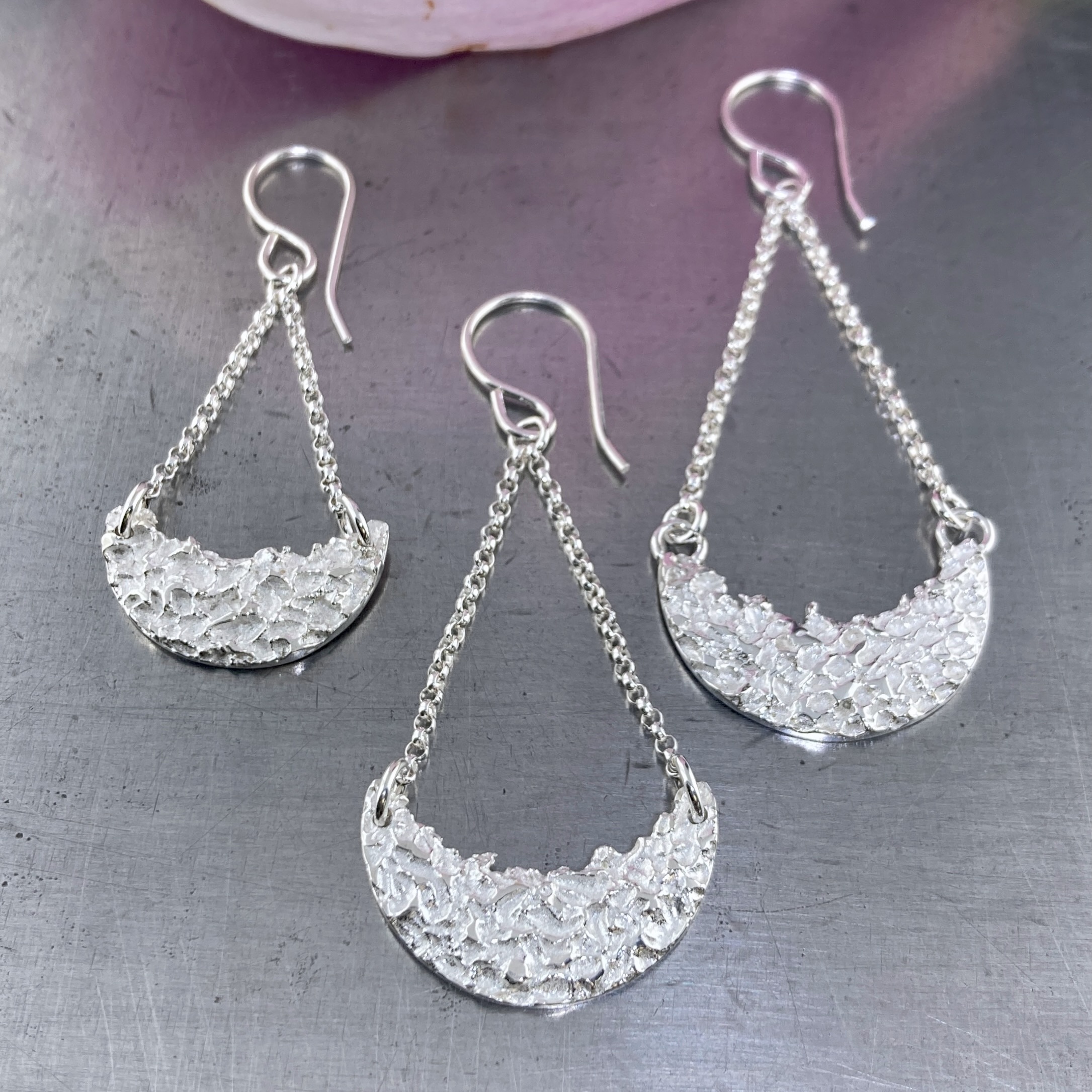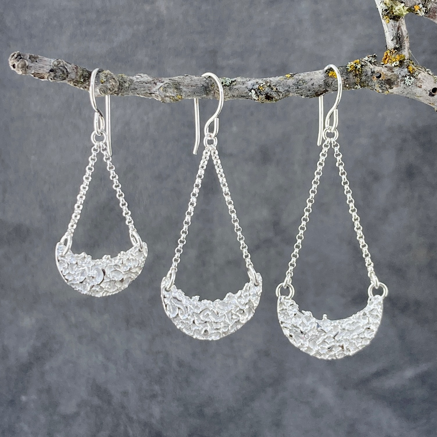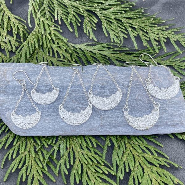 The Lunar design earrings are made by melting Argentium silver and then working it, while it is molten, to make it look like the surface of the moon. Then I hang these little Crescents on Sterling Silver chain with an Argentium silver ear wire.