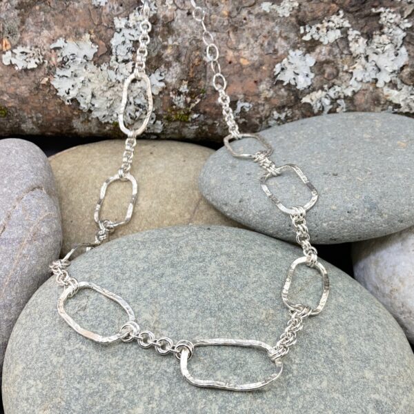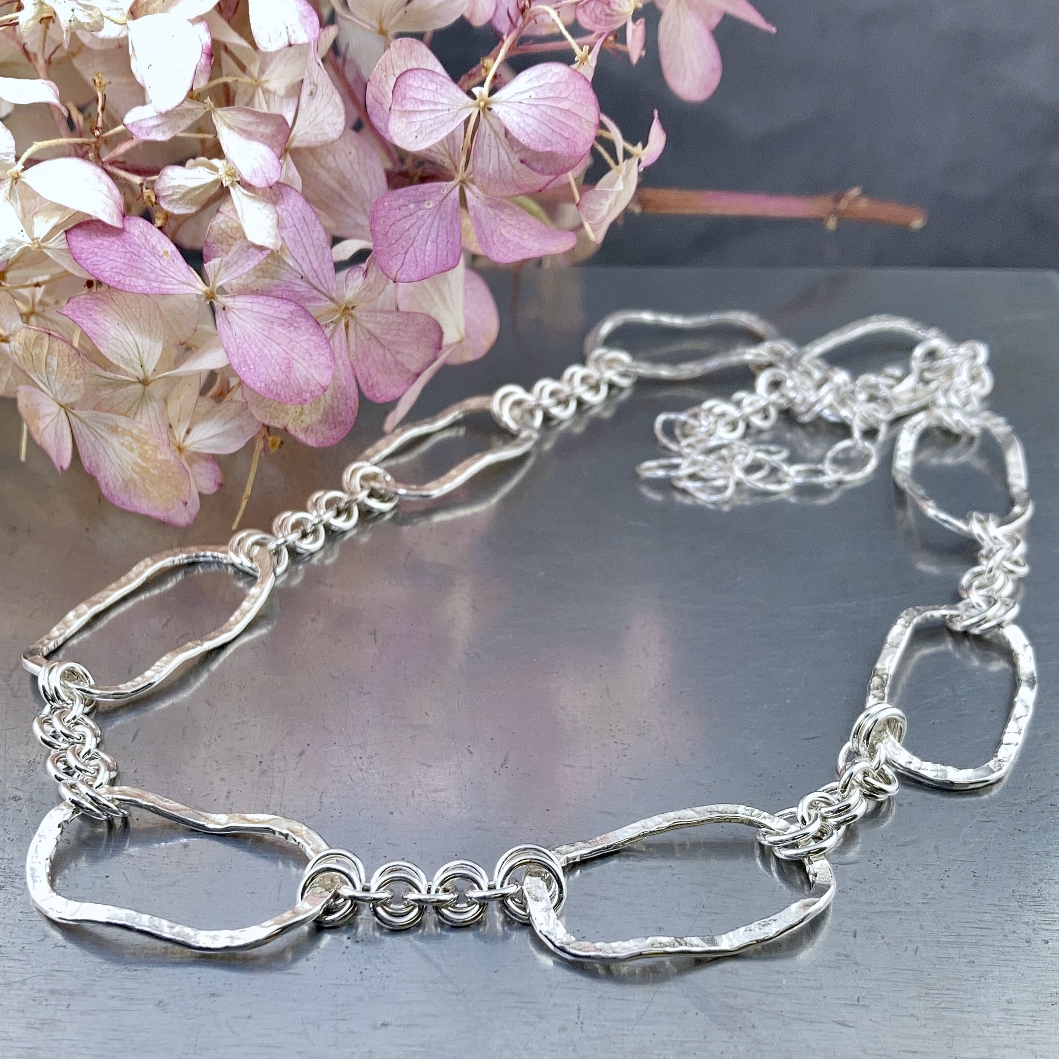 Argentium silver in a hollow boulder shape, fused and then textured. Connected with handmade Argentium silver chain links. This is one of those timeless, easy pieces that you surprise yourself with how often you wear it.
