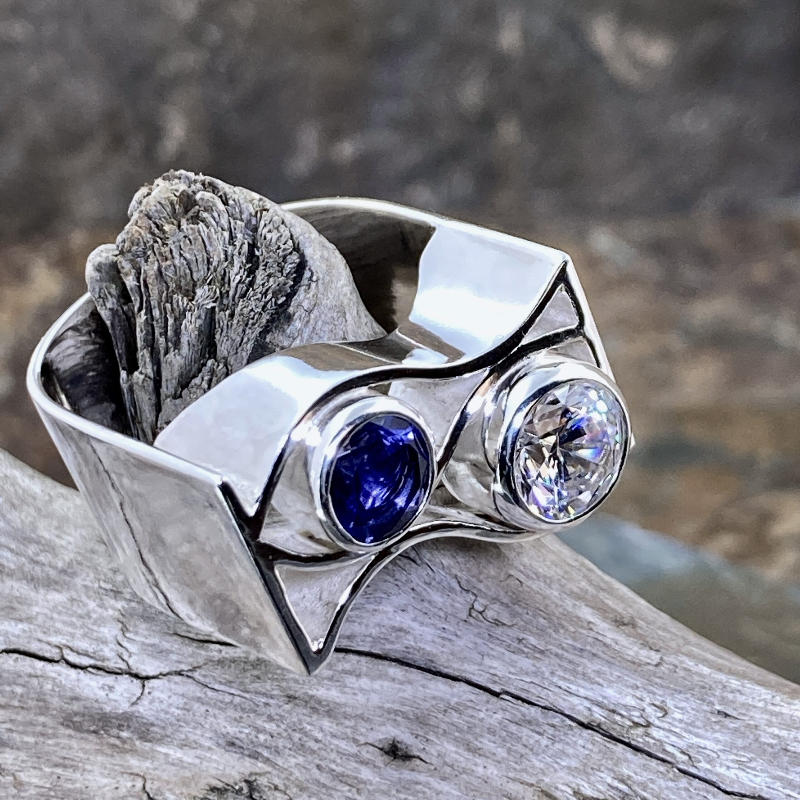 A flowing Flag Band ring inspired by motion and light. The Argentium silver surface bends like a flag in the wind, holding two bezel-set gemstones — a 1 carat Iolite and a 3.5 carat Cubic Zirconia. Their contrasting colors mirror the shifting tones of the sky.