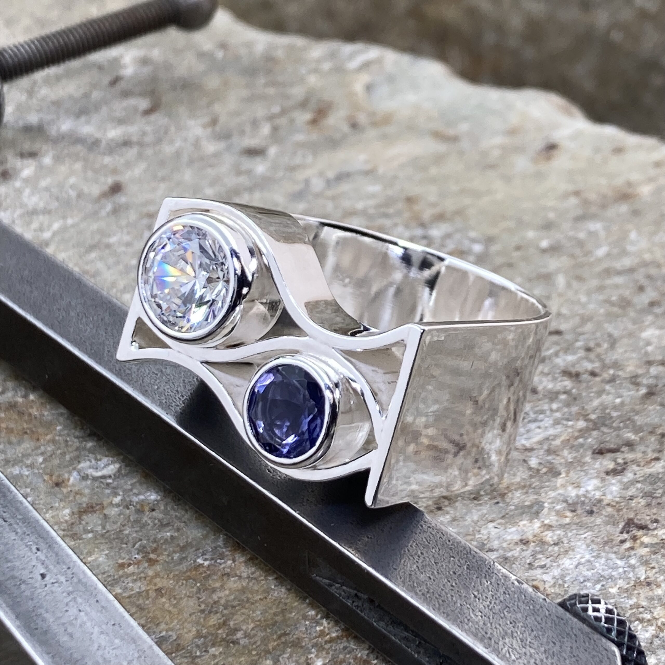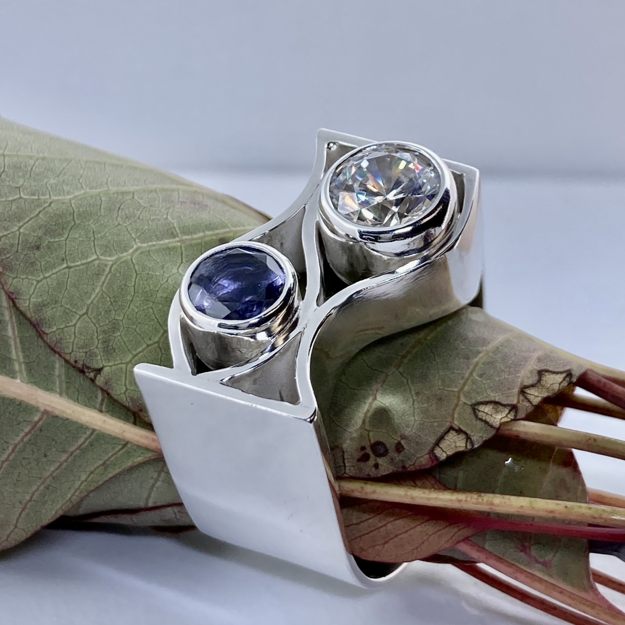 This ring pairs a deep blue-violet Iolite with a brilliant white Cubic Zirconia. Together, they create a cool, luminous effect — one soft and mysterious, the other bright and clear.