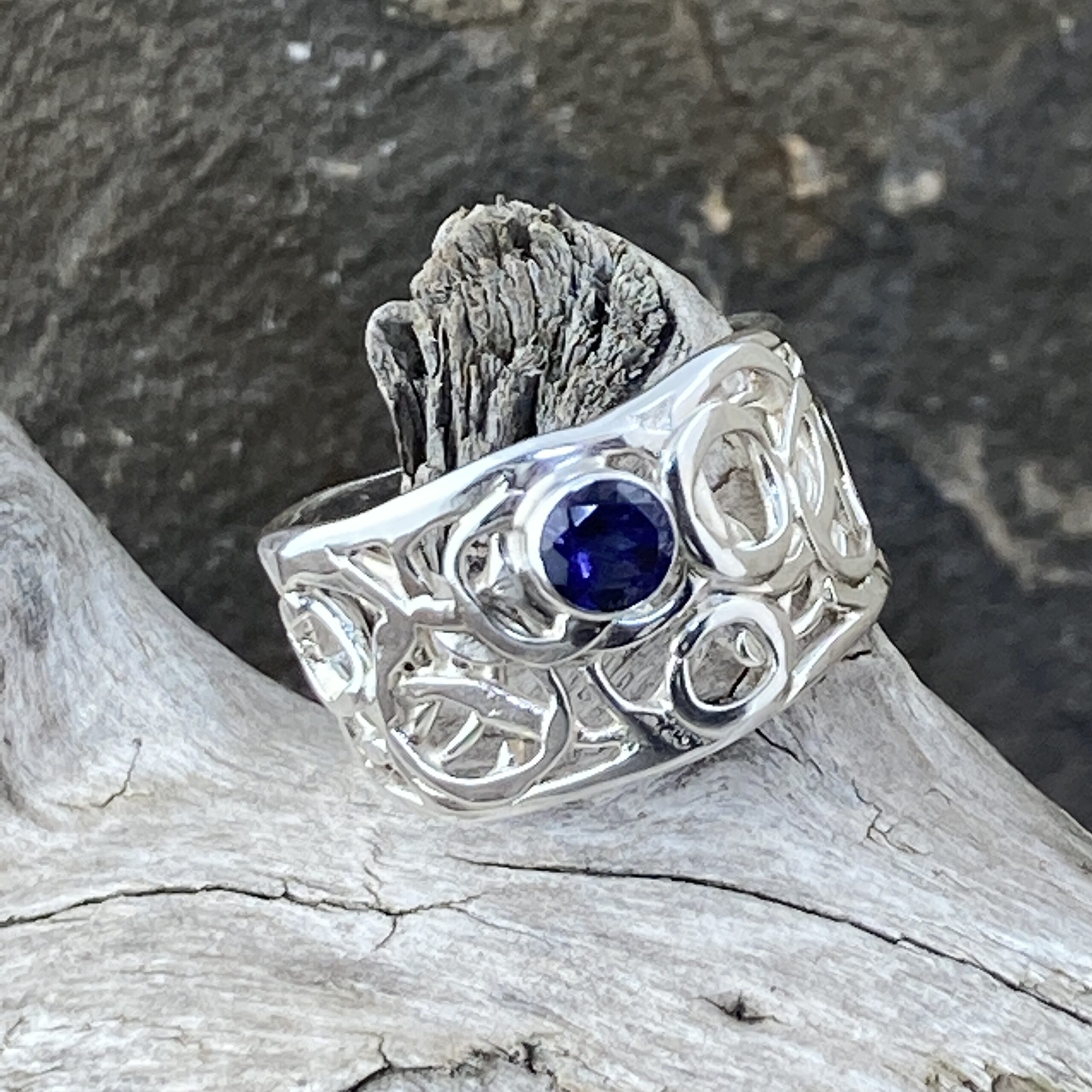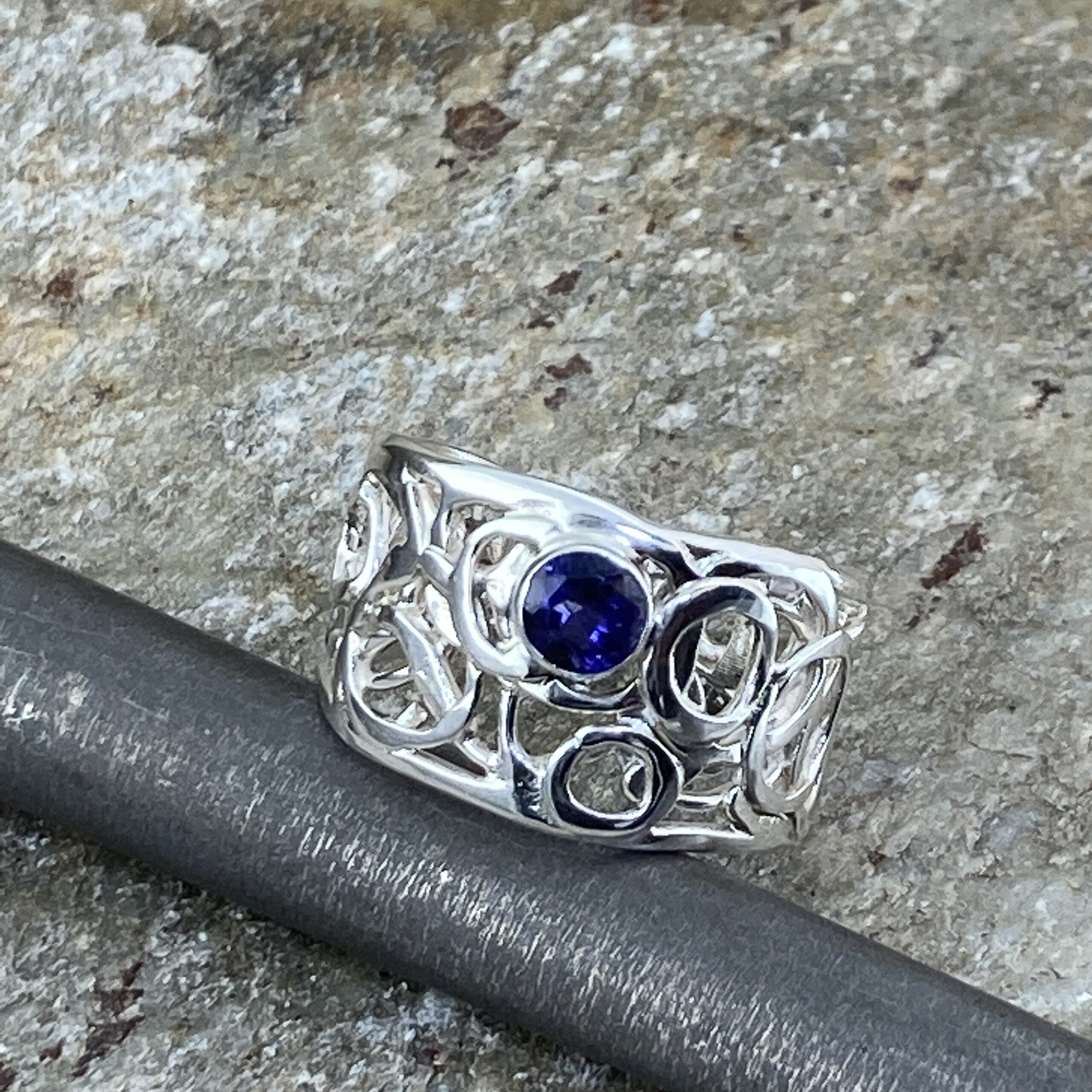 Each Pebbles band begins with many small, hollow silver forms that I shape and solder together. Once the band is complete, I refine and polish the surface to highlight its natural flow. The bezel is formed to fit the Iolite, completing a design that reflects earth, movement, and light.
