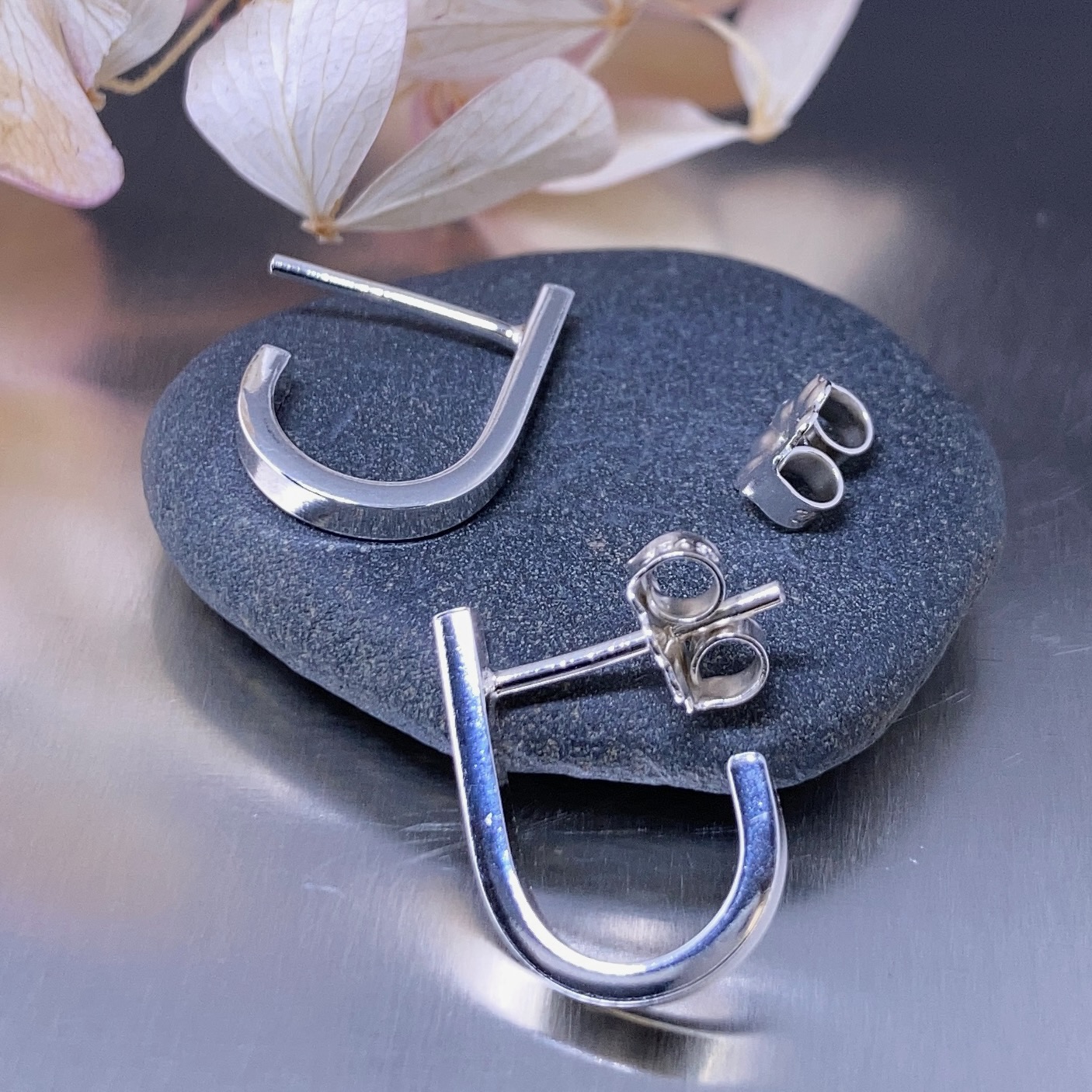 I shape Argentium wire into a J-curve, solder the joint, and refine the surface by hammering and polishing. The result is a small, strong earring with smooth edges and a mirror finish.