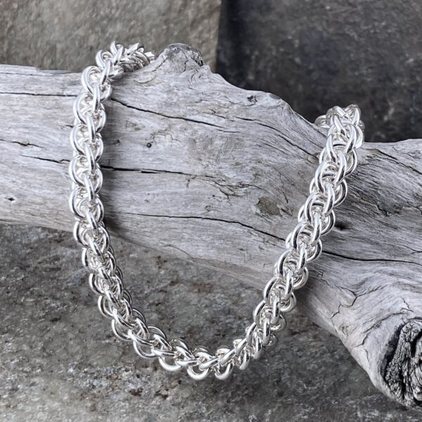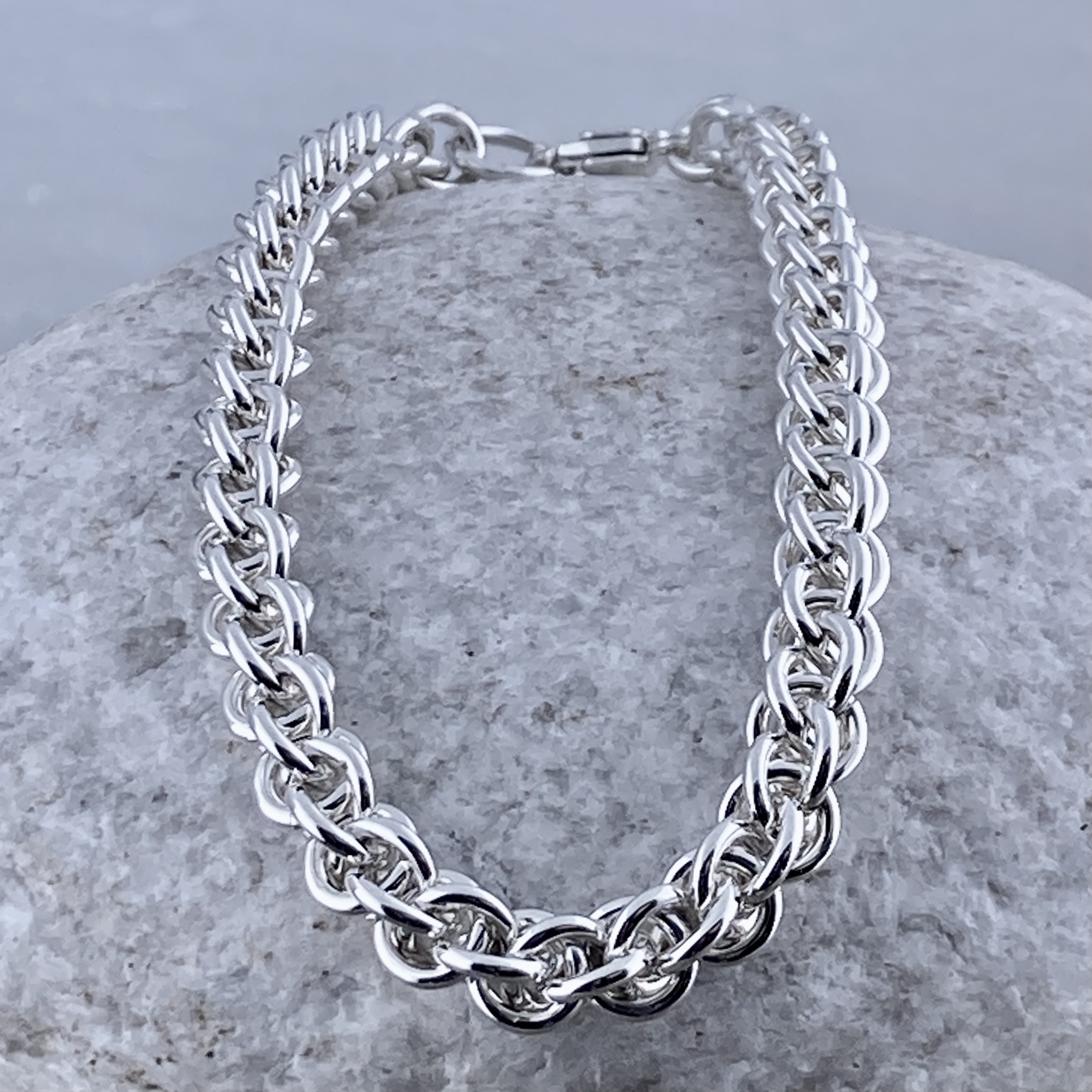 I coil, cut, and size each jump ring for accuracy. Then I weave the Jens Pind spiral so every link sits true and aligned. Next, I close and work-harden the chain for strength. Finally, I polish it to a mirror glow. The result feels fluid on the wrist yet looks structured and intentional.