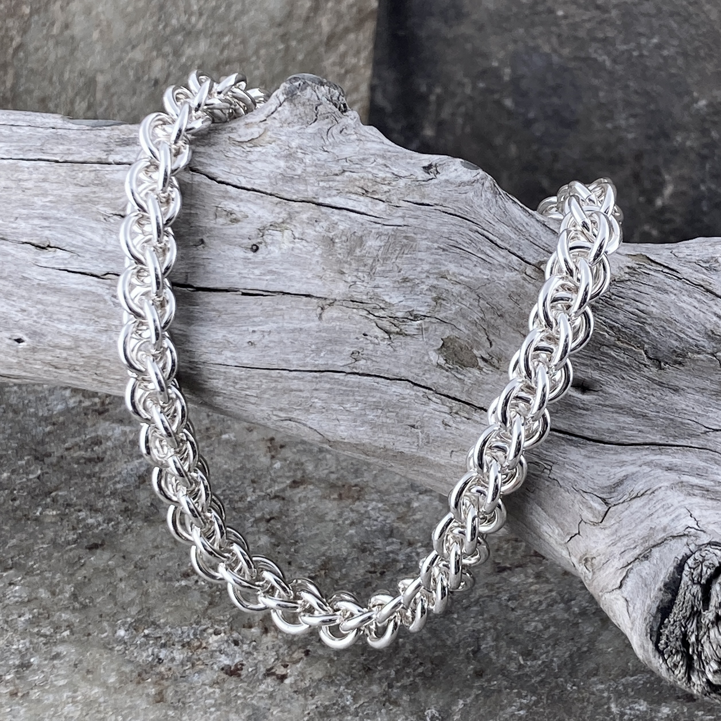 Jens Pind (JPL) is a dense spiral with excellent symmetry. I offer three weights across the line: 14-5 (heaviest), 16-4 (medium), and 18-3 (finest). The numbers refer to jump-ring sizing, which determines the final chain width and feel.