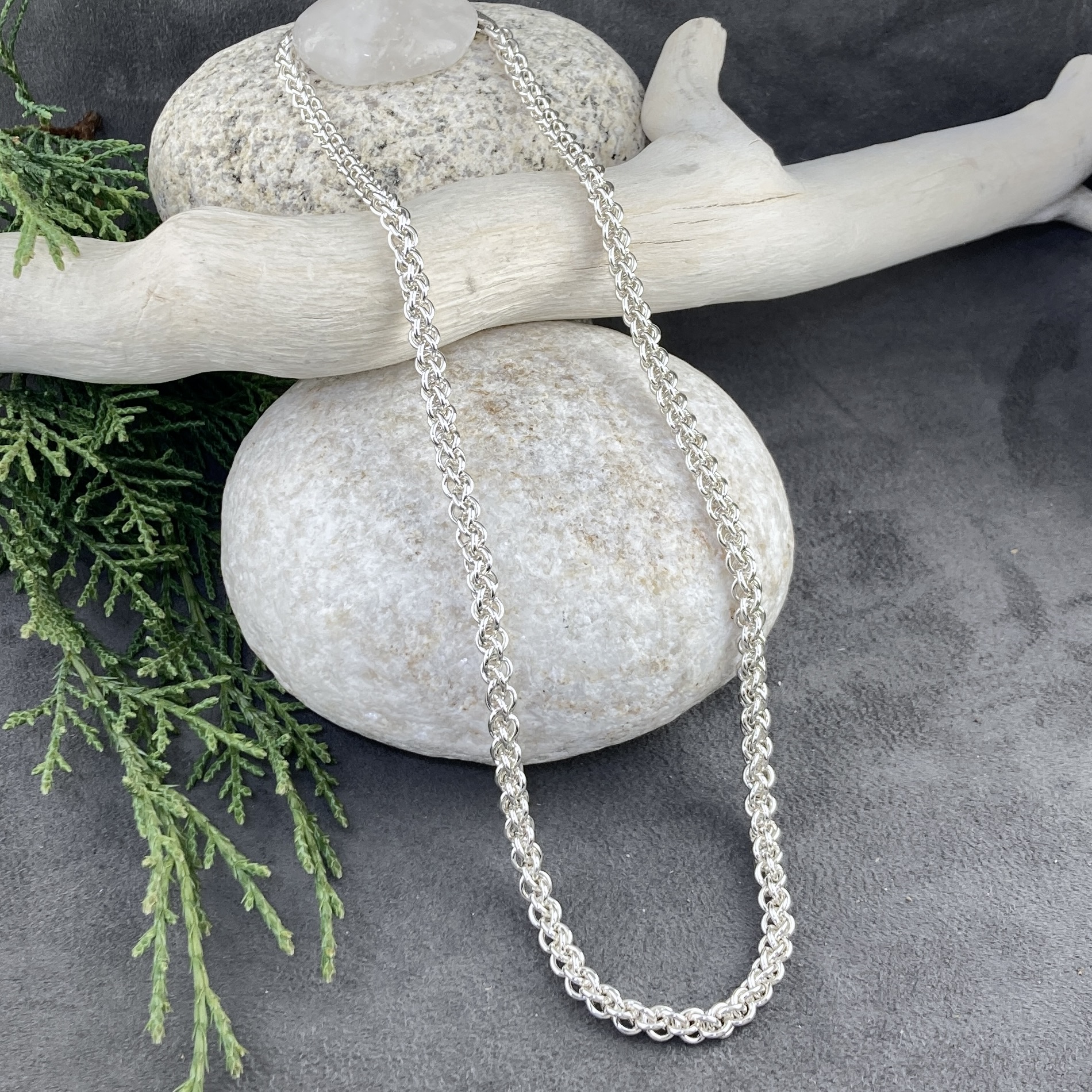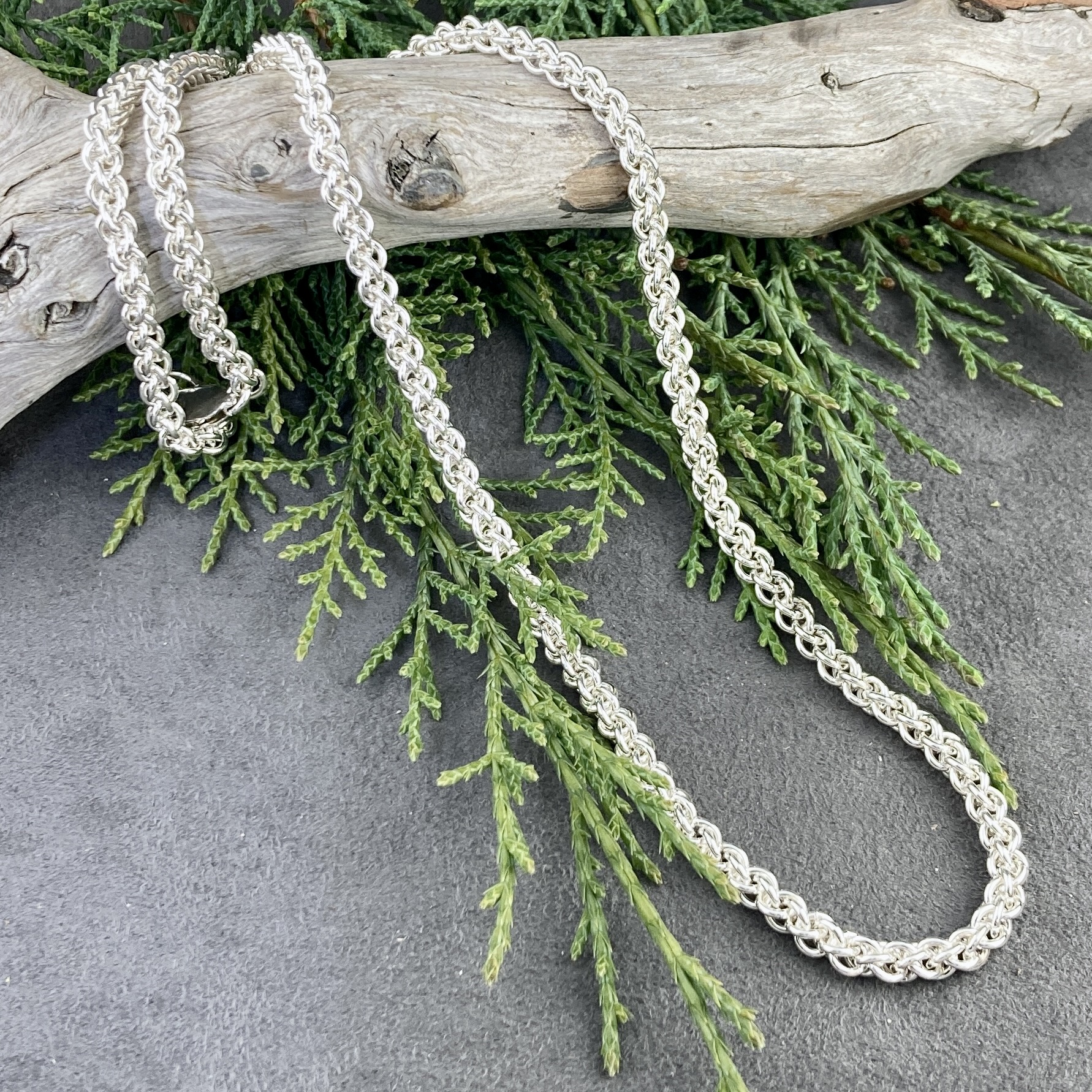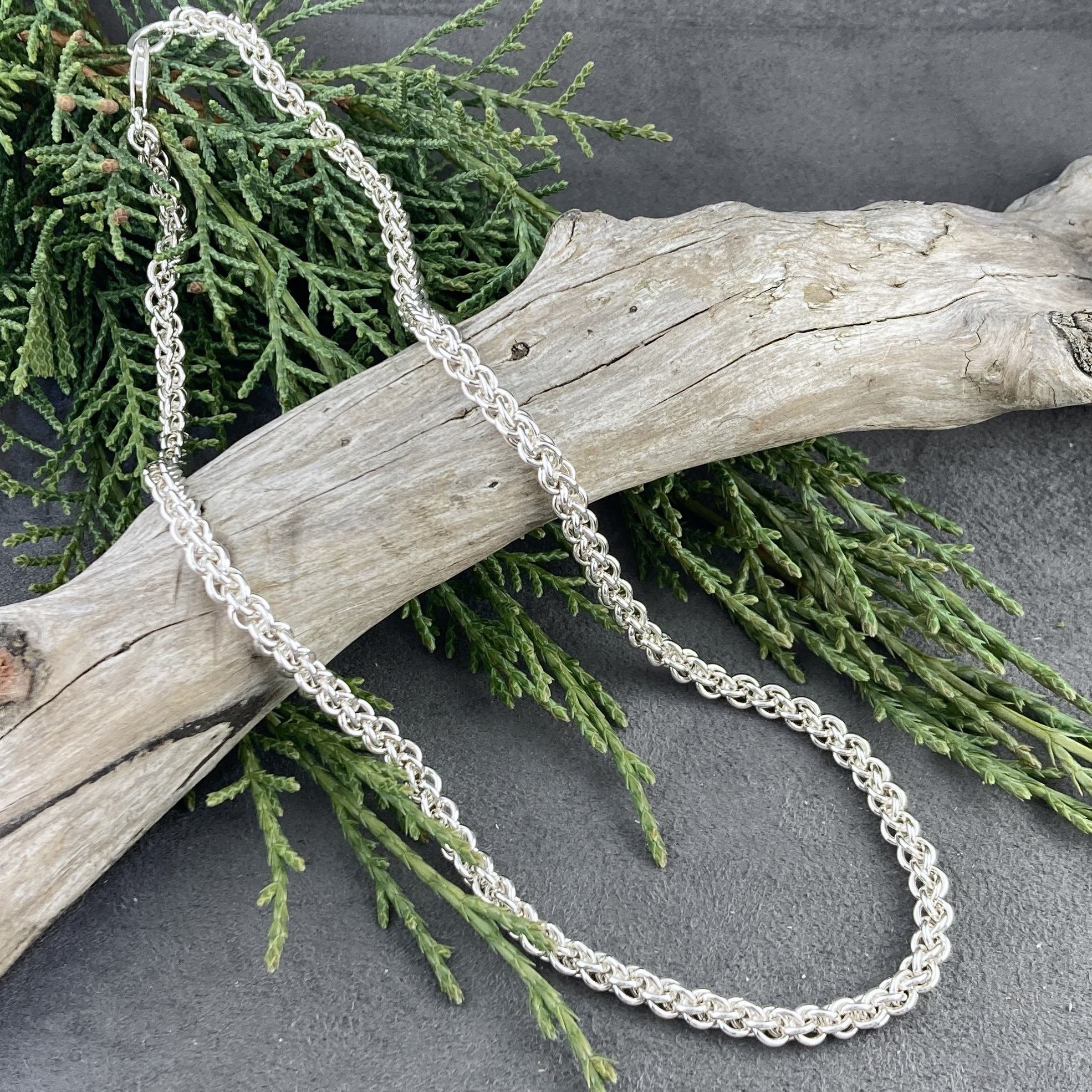 Jens Pind necklace (18-3) – hand made chain maille. Jens Pind is the name of a popular weave. It is smooth and linear – a really nice link by itself or for adding a pendant to.