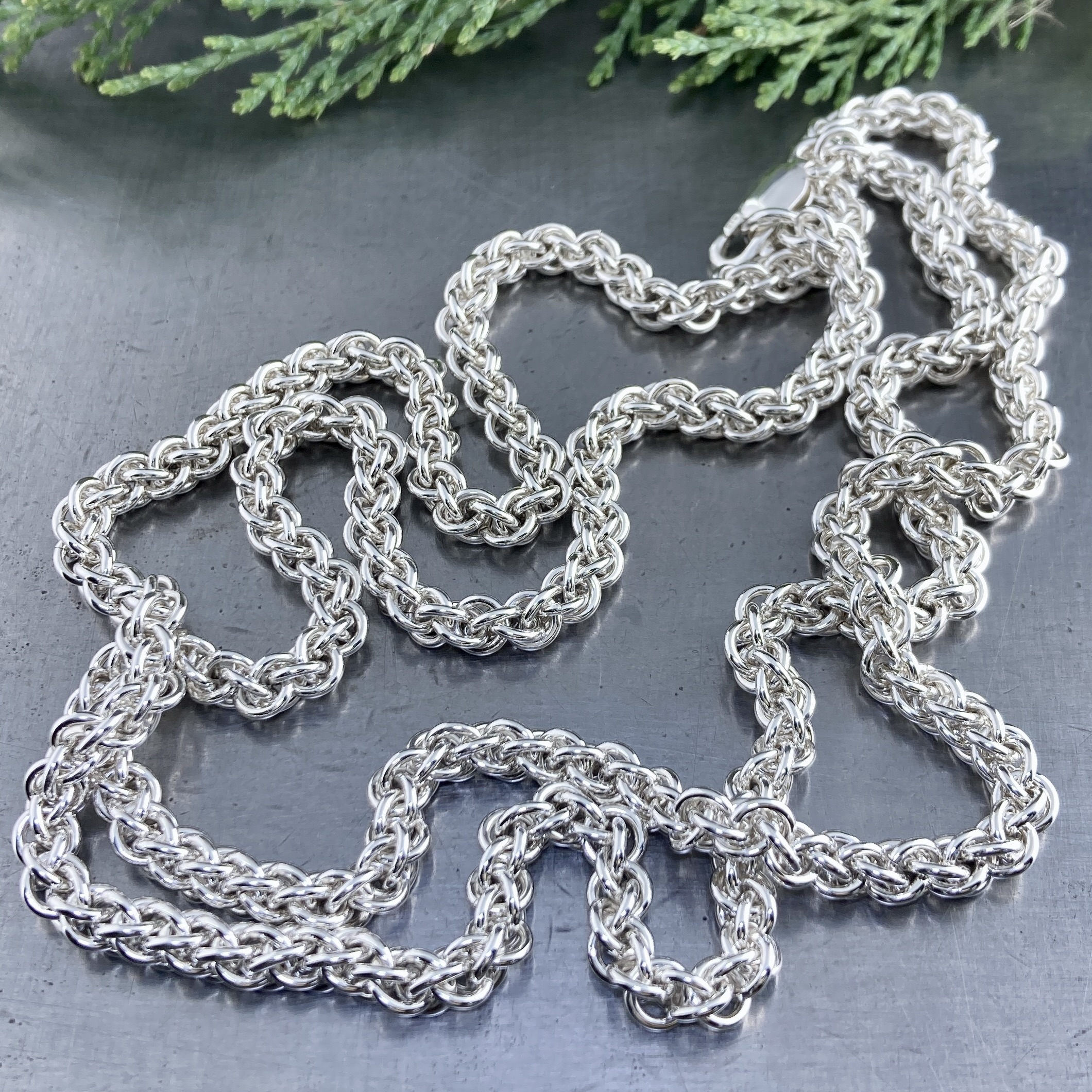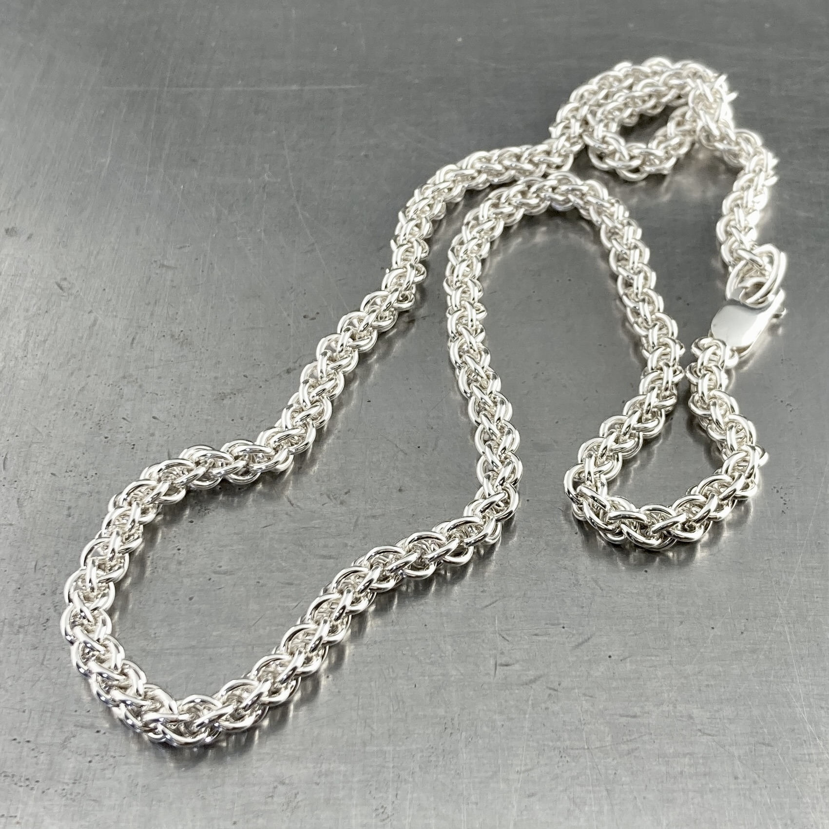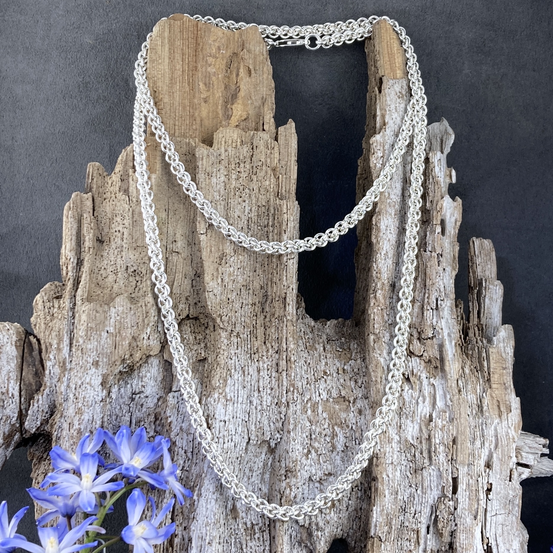 Jens Pind necklace (18-3) – hand made chain maille. Jens Pind is the name of a popular weave. It is smooth and linear – a really nice link by itself or for adding a pendant to.