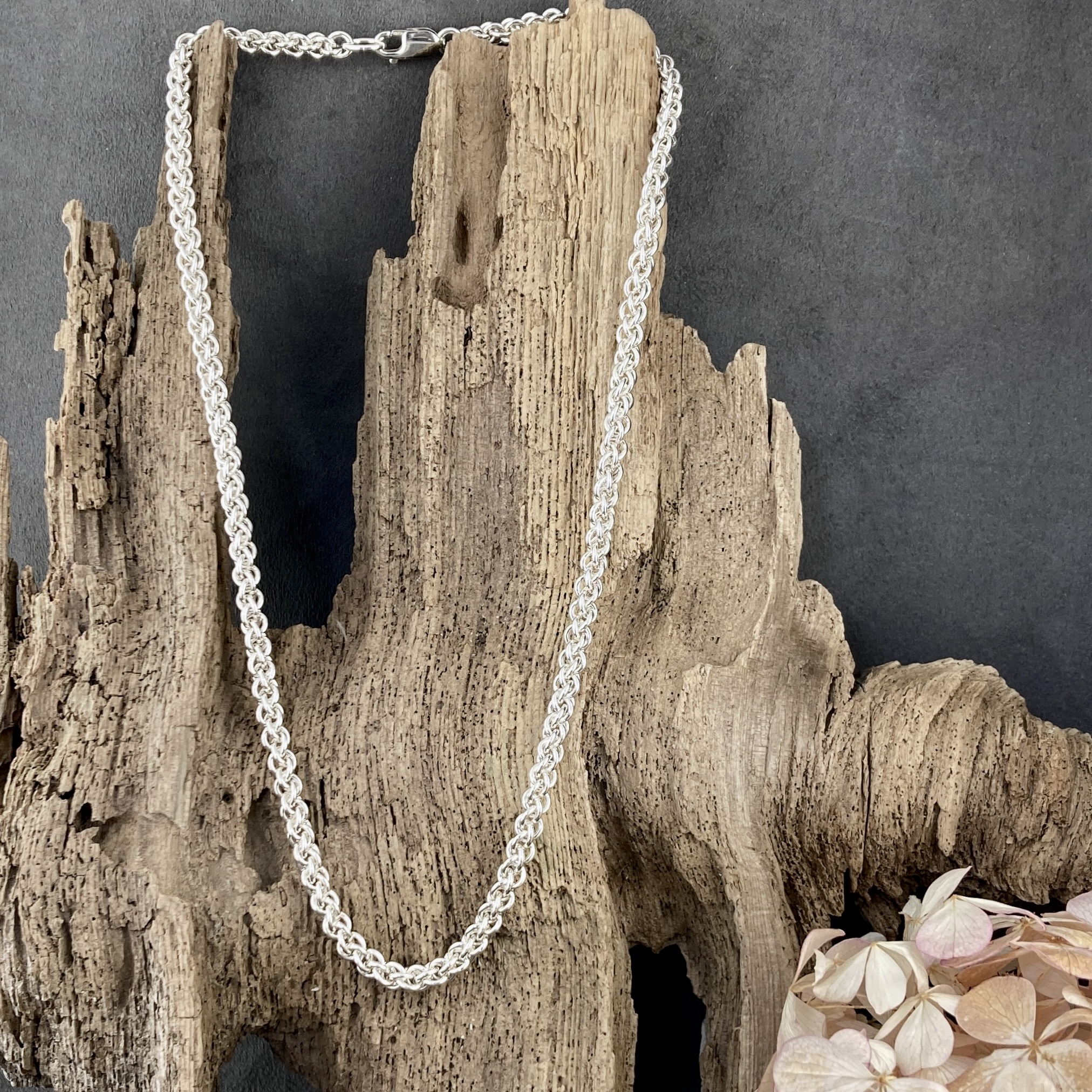 18-3 refers to the size of the jump rings to make the weave – it is the narrowest of the Jens Pind weaves. Heavier weaves are also available – especially in the bracelets.