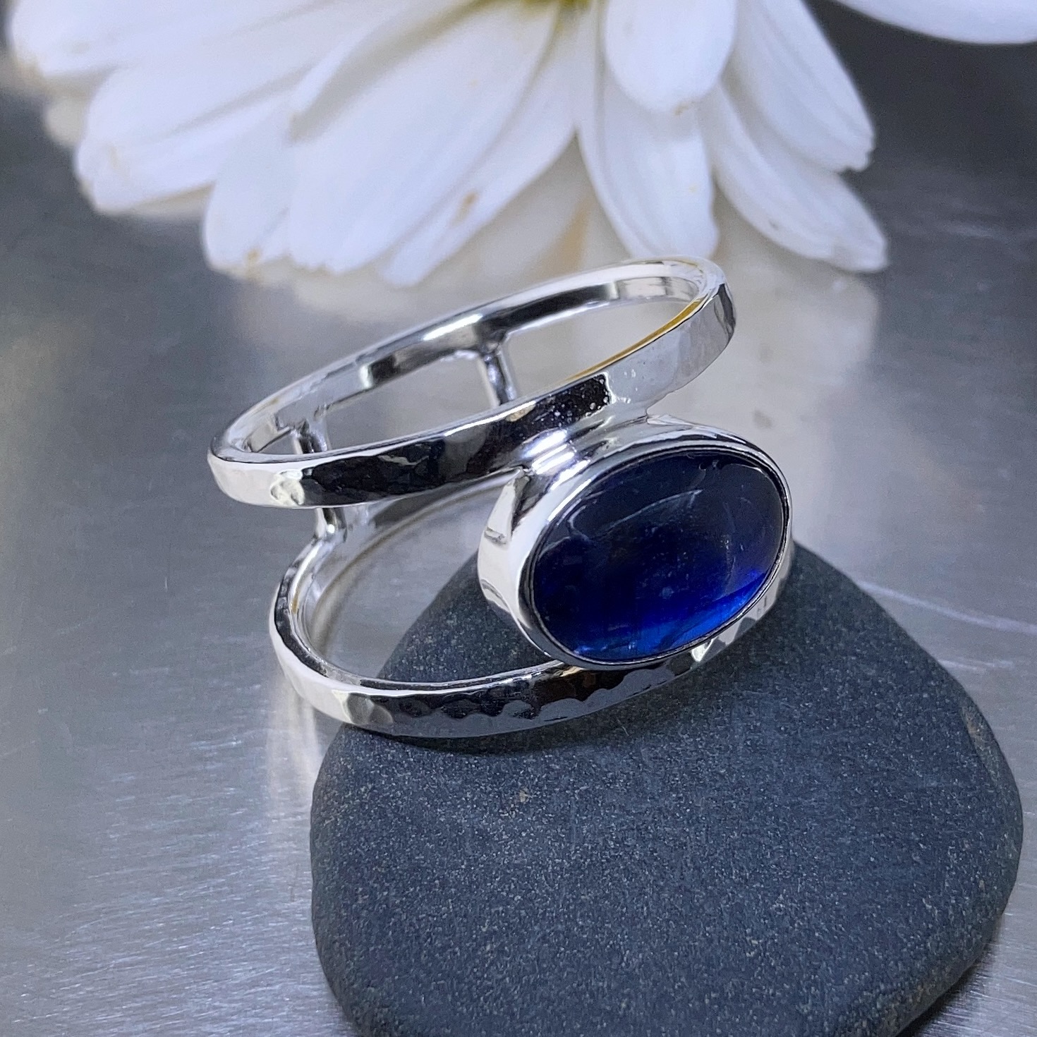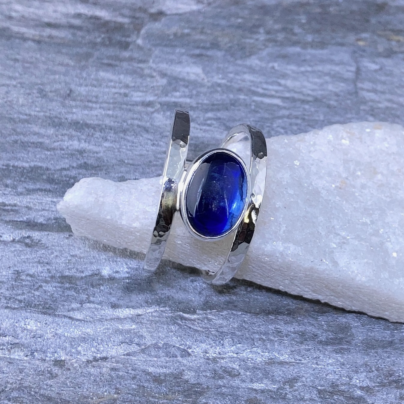 A bold Round Double-Band ring featuring a 5.5 carat oval Kyanite cabochon. The gemstone rests between two hammered Argentium silver bands, creating a clean balance of texture and color. Its deep blue tone reflects light softly, giving the piece quiet strength and depth.